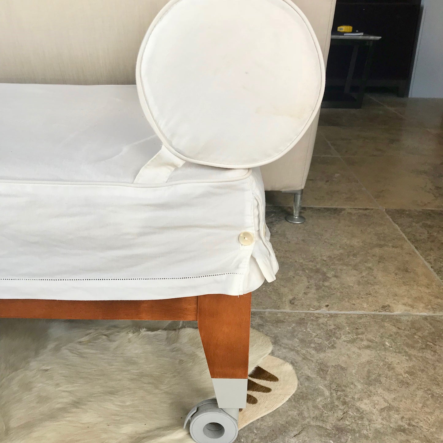Neoz sofas, and day-bed emphasise the formal characteristics of the collection they belong to, by building a sort of “living nest” marked by the hem-stitched tissue whiteness, like past laundry, and the cushions’ softness. Large wheels, though, suggest an only temporary luxe.Cast-aluminium leg terminals with nylon castors and polyurethane foams padded solid wood structure with linen/cotton hem-stitched fabric detachable upholstery.