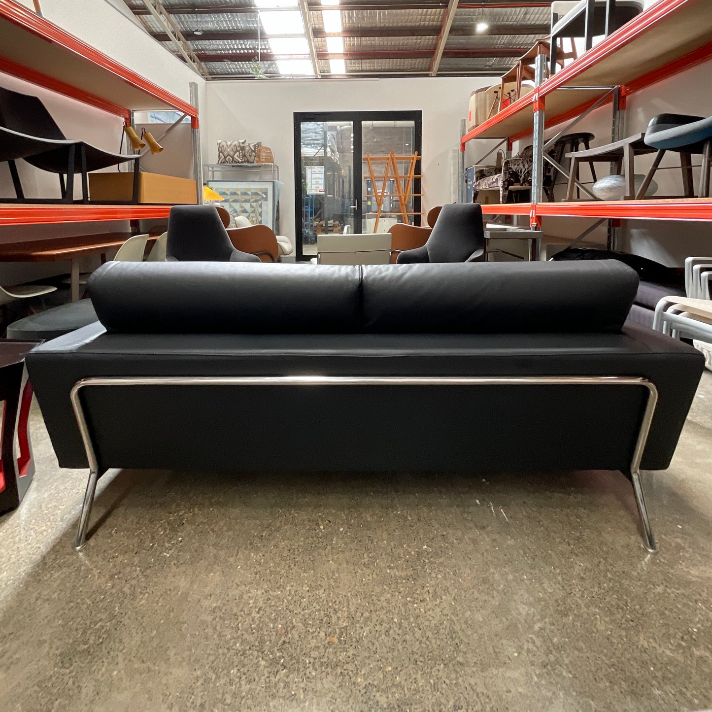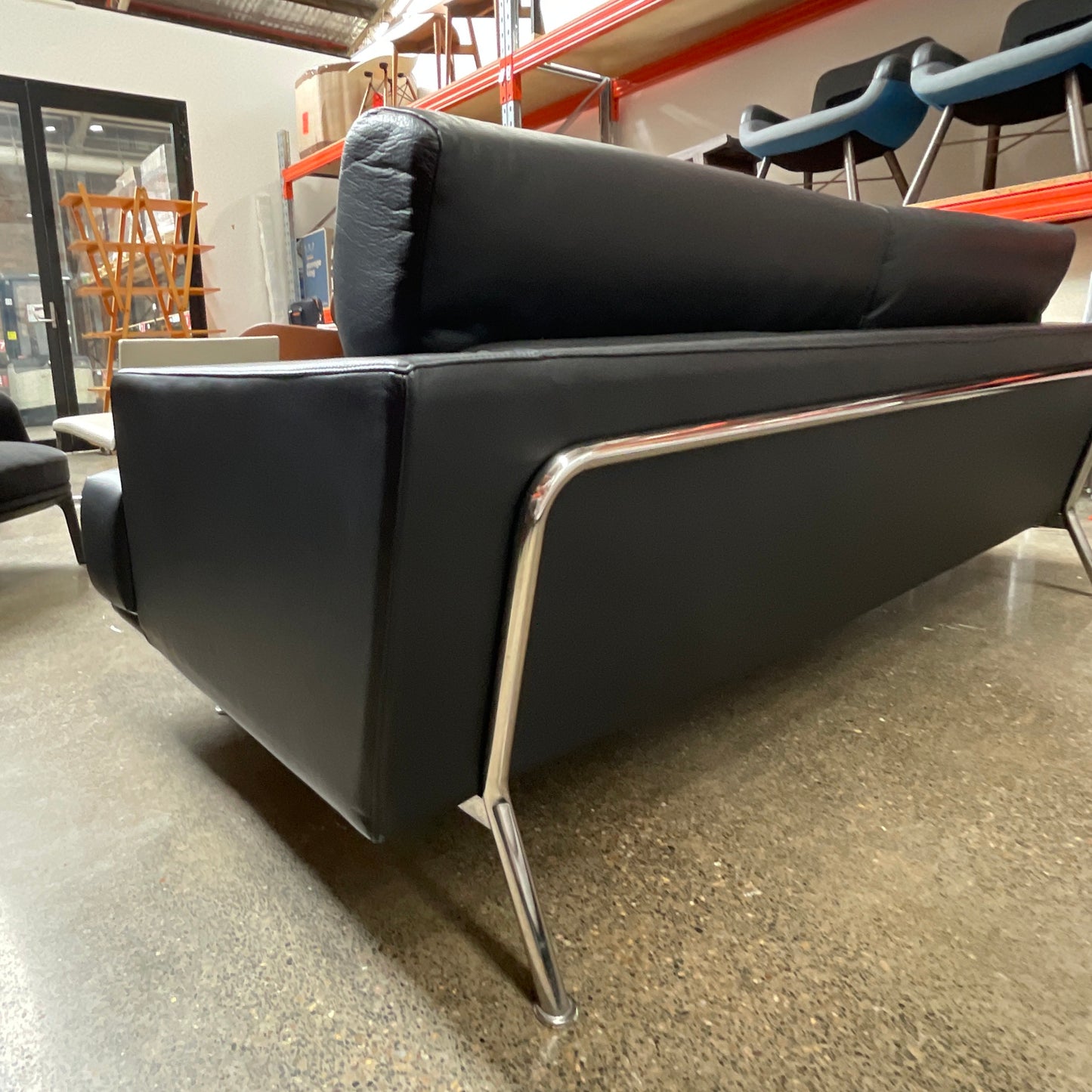 The 253 Nest Sofa by Piero Lissoni for Cassina has a visible frame made of chrome plated lacquered steel and multiplywood internal frame; upholstery in CFCfree polyurethane foam and polyester padding. Large, loose seat and back cushions. Upholstered in leather with completely removable covers. The sofa we have on offer is a three seater upholstered in a black Cassina leather. The sofa has just been professionally cleaned and conditioned.