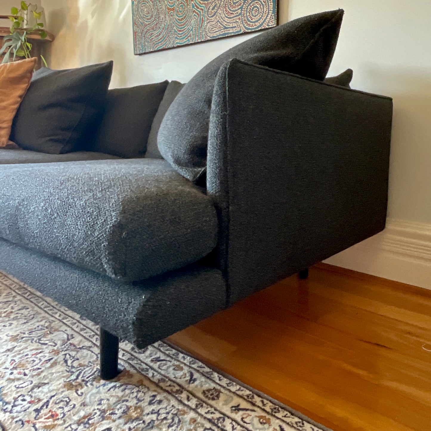 Nook’s slim profile and tapered legs make for a truly iconic modern sofa. The sofa we have on offer has two loose seat cushions with two loose back cushions and two throw pillows. Upholstered in a charcoal fabric with charcoal timber legs