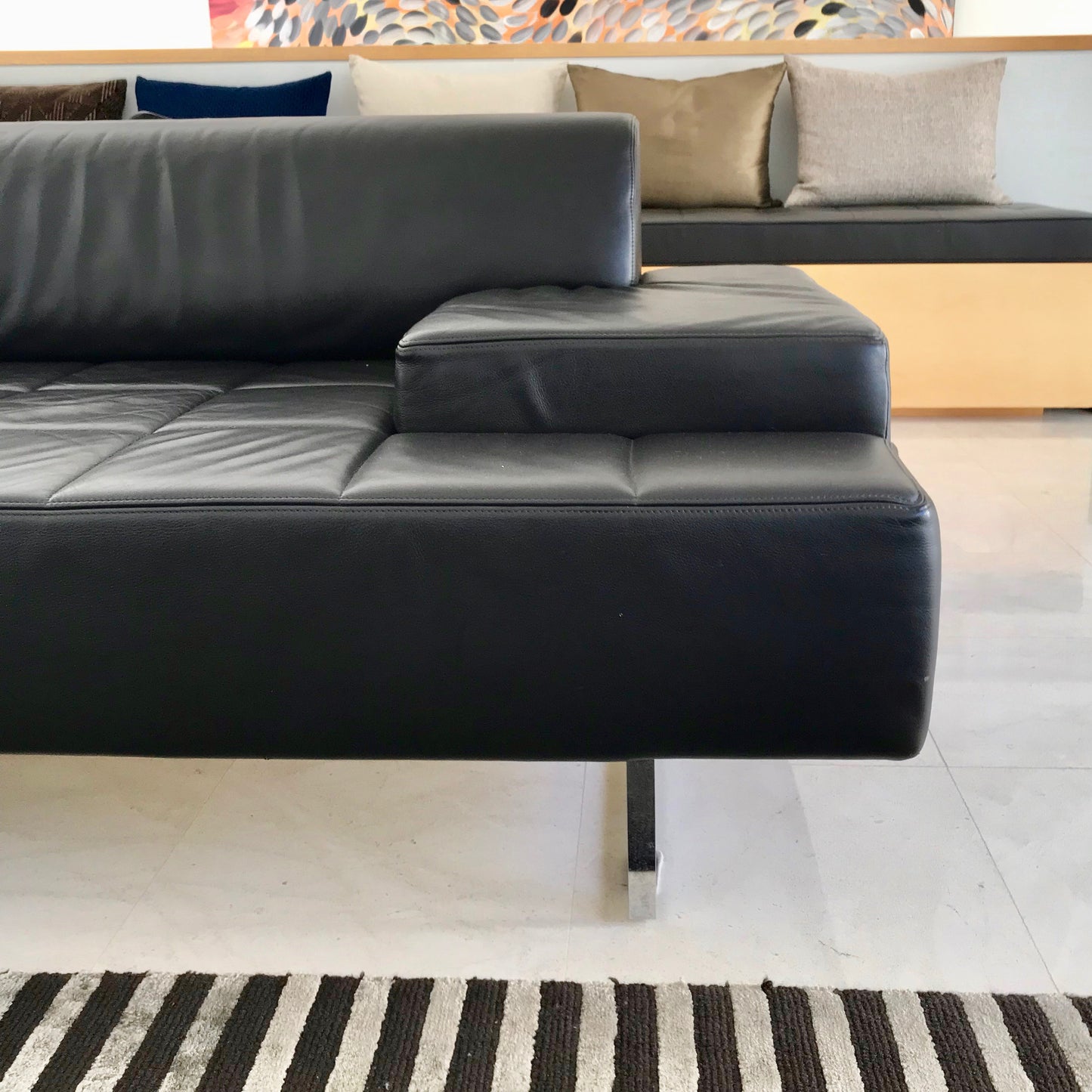 The Quadra by Poltrona Frau is a rational and elegant design. The collection is based on the replication of a square shaped module that can be combined with three armrest variants – high, medium and low – to produce a great variety of configurations. Upholstery is in dark brown Pelle Frau® leather or non-removable fabric. The piece rests on a metal, silver-finished support that is polyester protected.