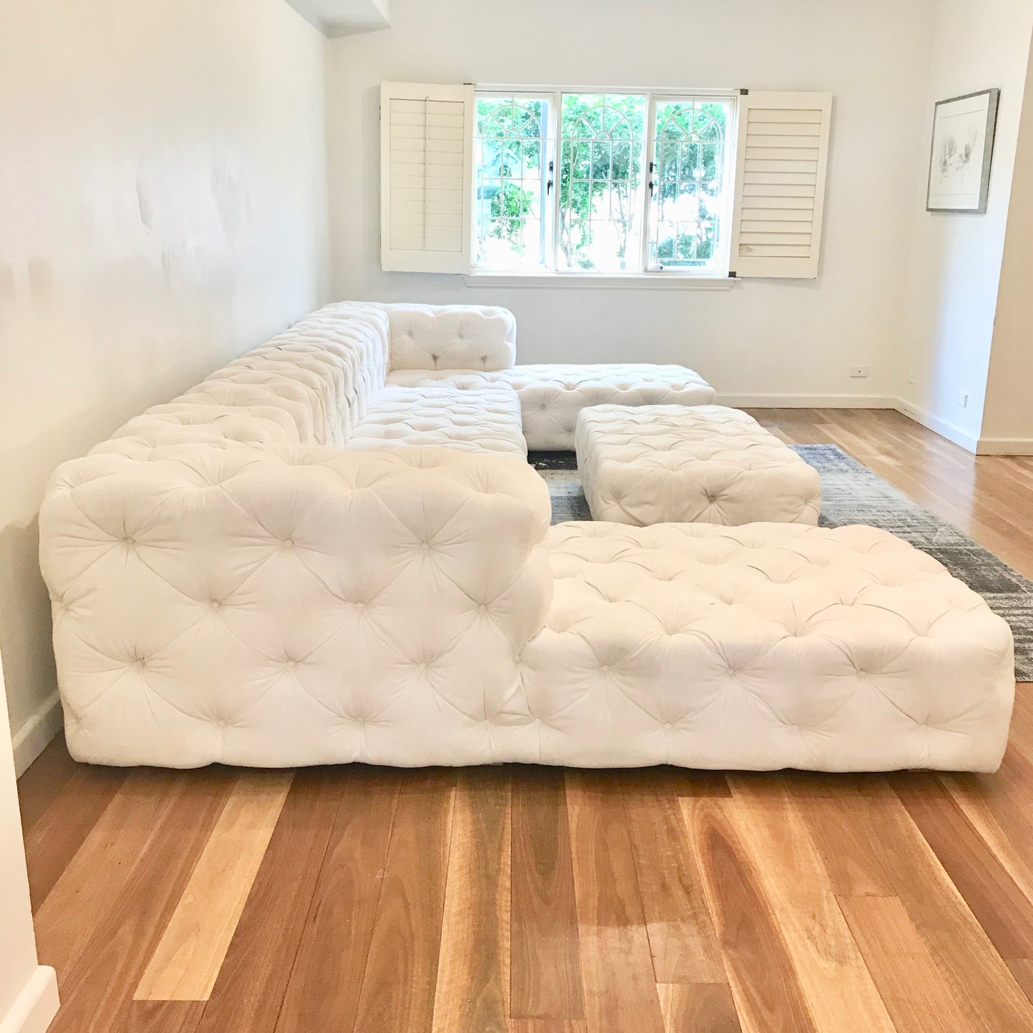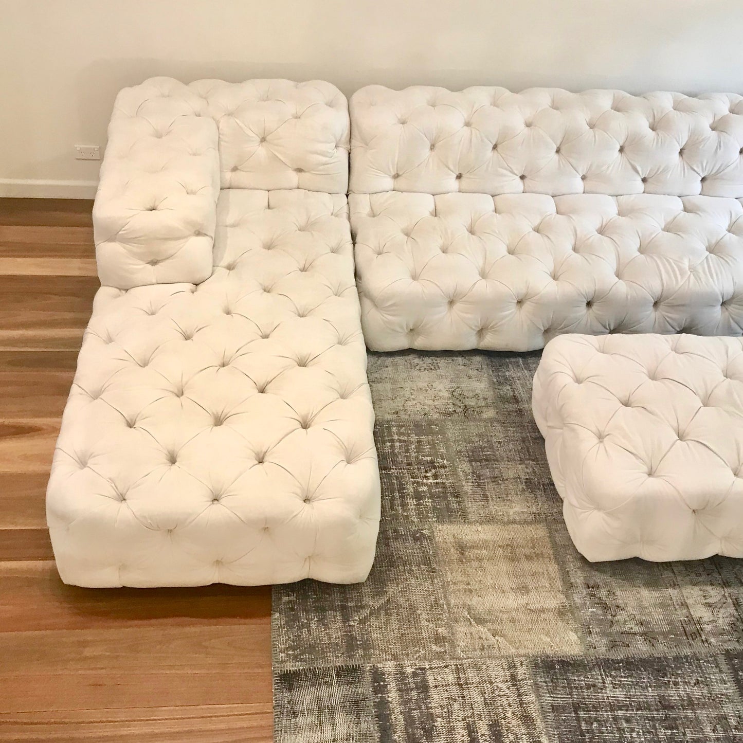 Grandly proportioned, with a low seat, plush padding and allover button tufting, our sofa is comfort writ large. Its lavish styling recalls the classic Chesterfield – plush seating for London's turn-of-the-century gentlemen's clubs – while squared-off arms and a rakishly low profile imbue it with contemporary style. The sofa we have on offer is the preconfigured soho tufted U-Chaise modular with ottoman.