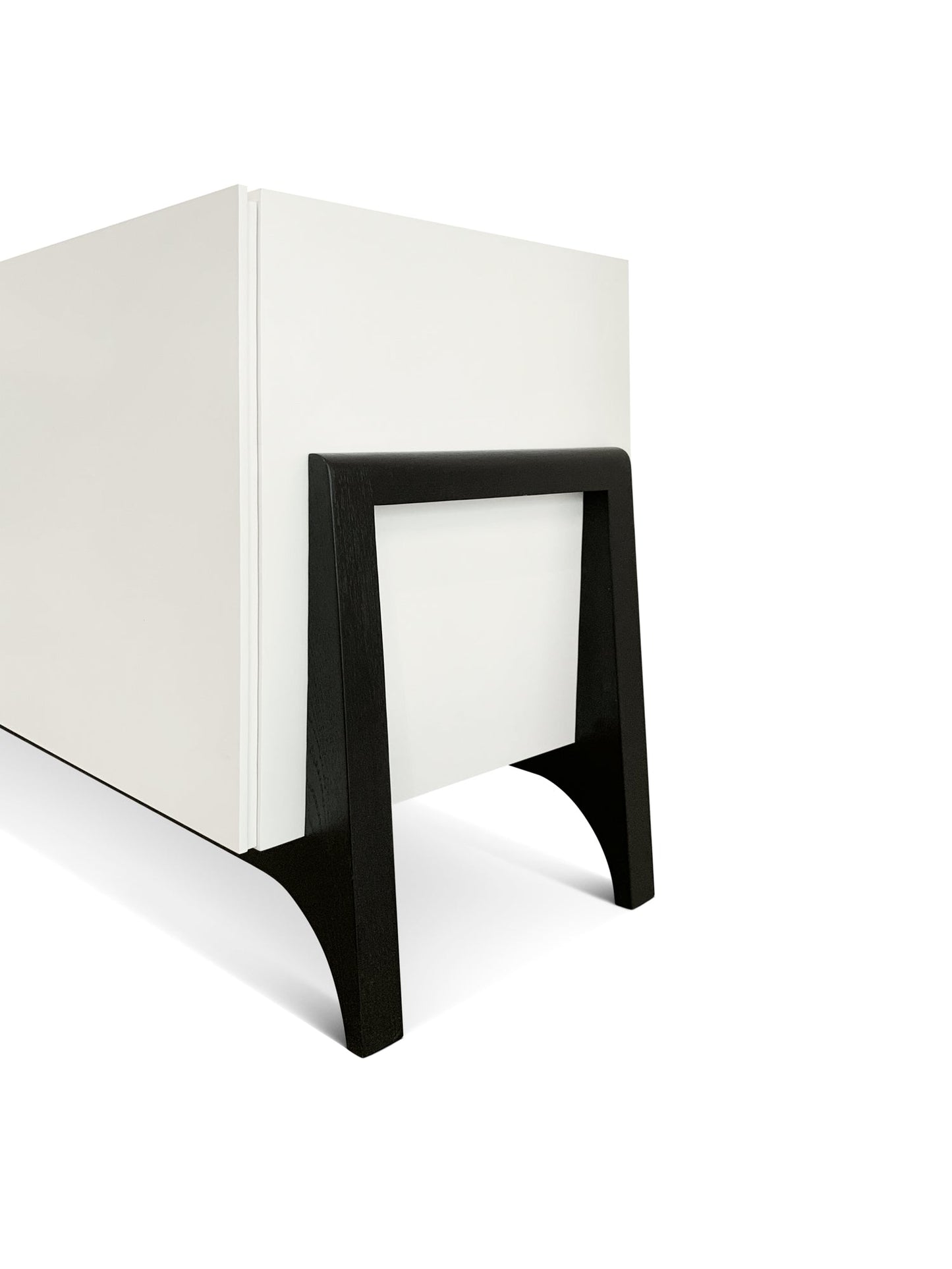 The Audrey sideboard is the latest in Australian made design. Created with quality, traditional materials this piece is characterised by extremely original design and boasts a striking form which offers many possible uses in the home. The Audrey is composed of three doors and two drawers. The materials used in the design are 2-pac soft white cabinet with a leg structure in solid timber.