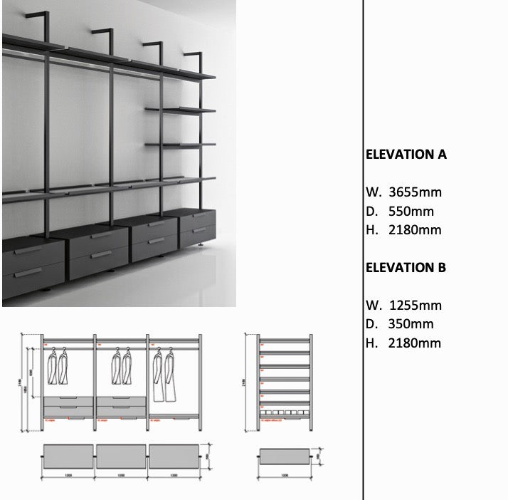 3 x 1200mm wide flat shelves in matt lacquer with LED 3 x 1200mm wide hanging rails 2 x 1200mm wide 2 drawer units with doors in matt lacquer & drawer box in decomat finish (AC Adaptor to base of unit)