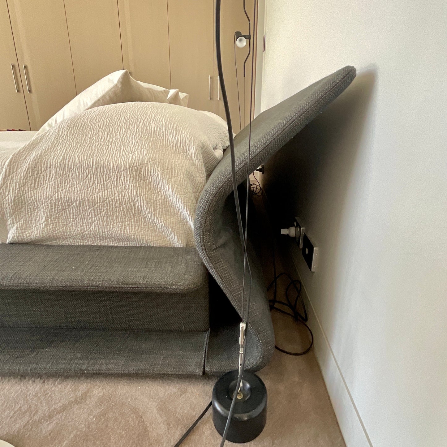 Clip is an upholstered bed with a unique design. The headboard continues for the whole length of the bed to the footboard and folds back on itself to trace a highly original image resembling a paperclip which can be tilted to several positions. It can take all types of mattress-base and the fully removable covers. The bed we have on offer is in a grey fabric.