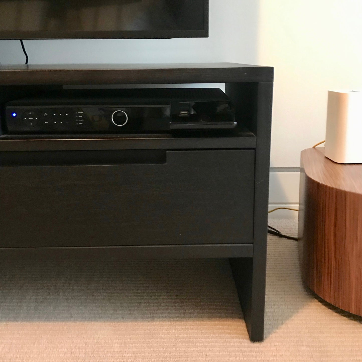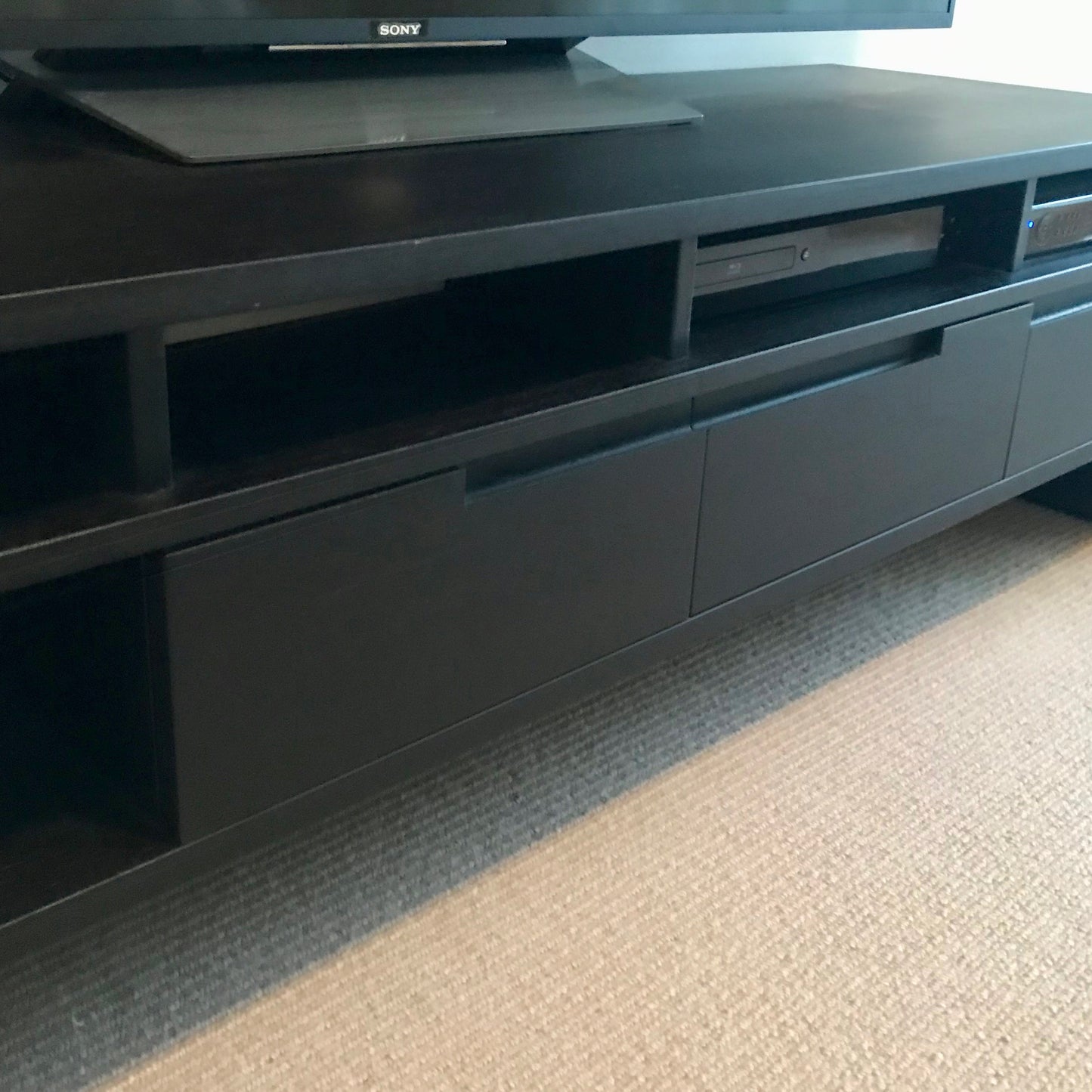Console TV/DVD with structure in wood conglomerate with finish en ebonized teak wood. Indoor use only.