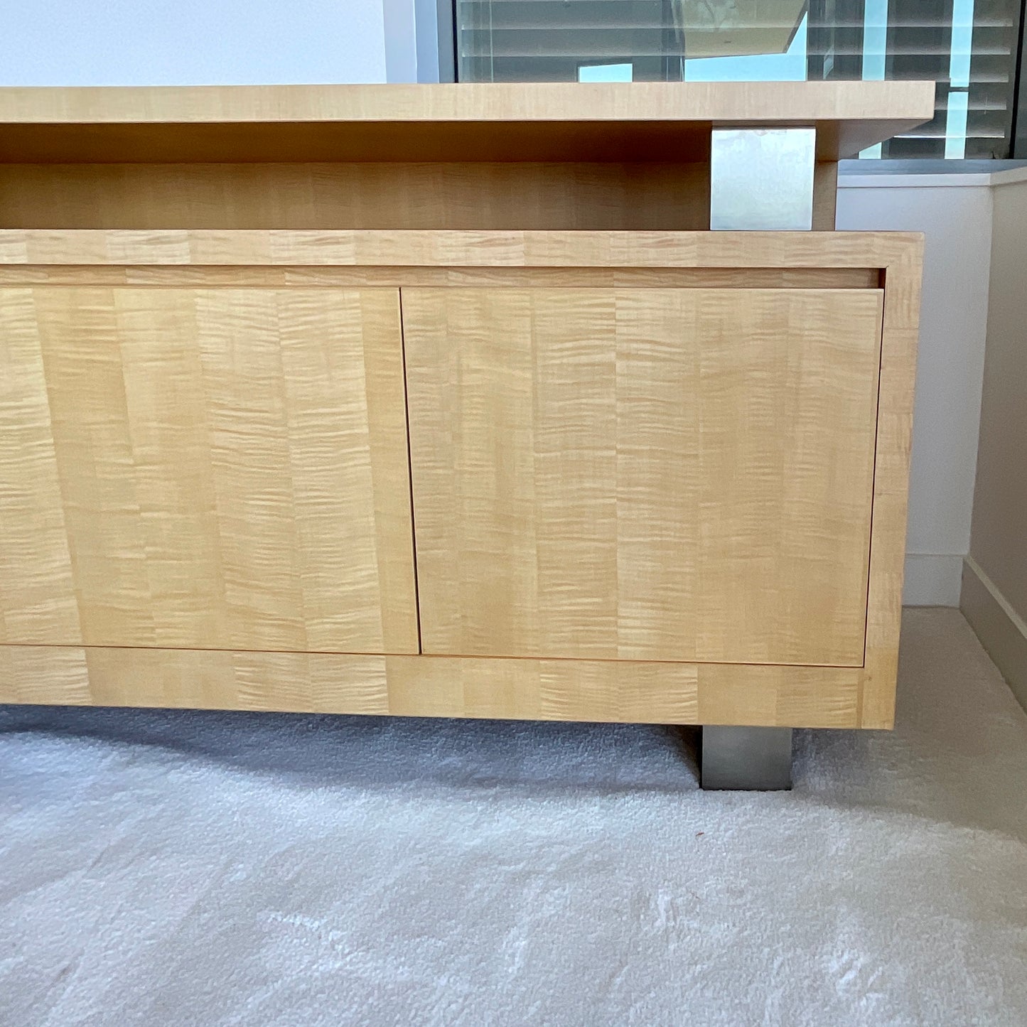 The handcrafted credenza we have on offer is constructed using a Figured Maple veneer. The credenza has a open shelf with metal supports. The cabinetry below has five doors. Beautifully crafted this piece would work as a media unit or great office console. This item is extremely heavy and would require a four man delivery.