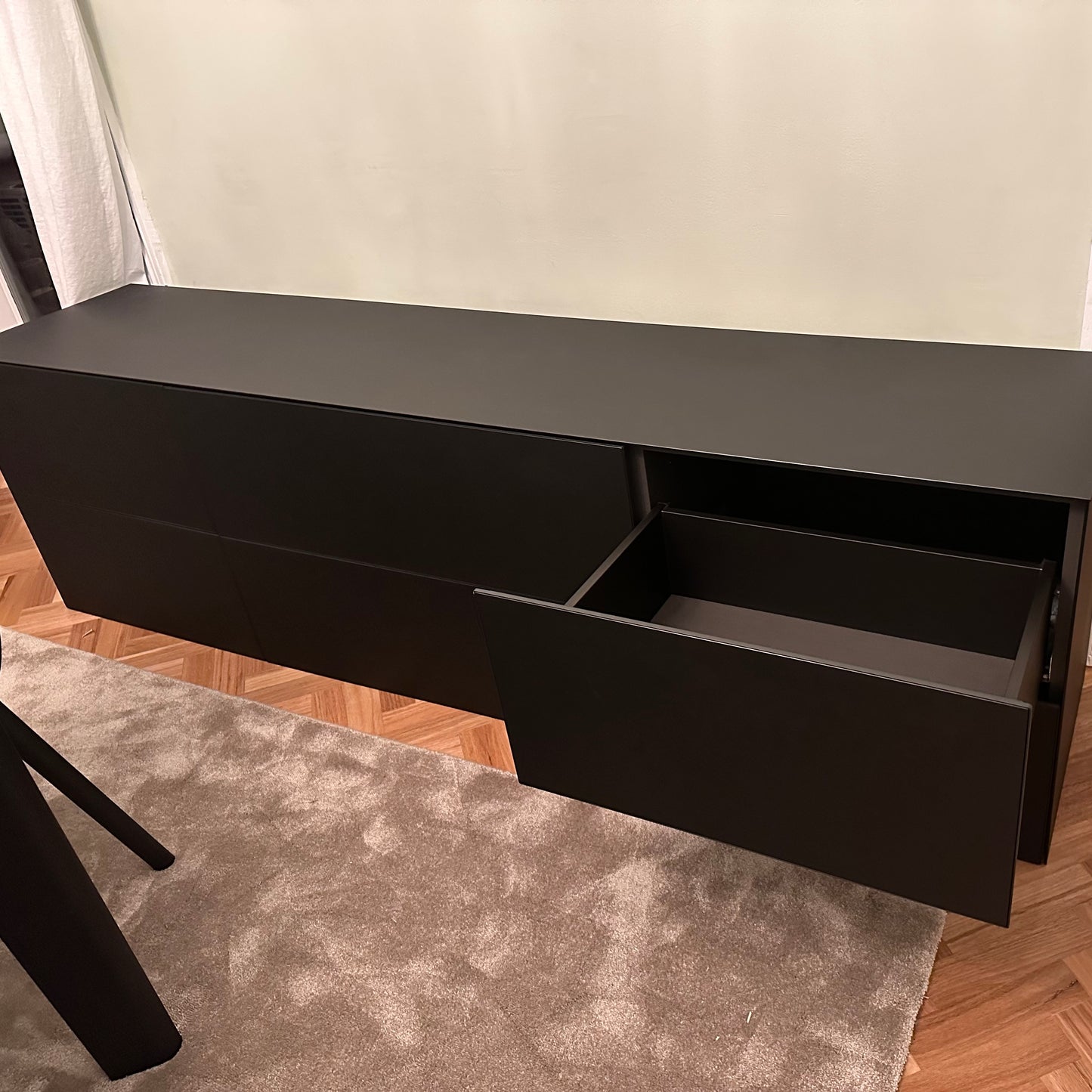 This glass cabinet can be wall hung. The sideboard we have on offer has matte black glass finish.