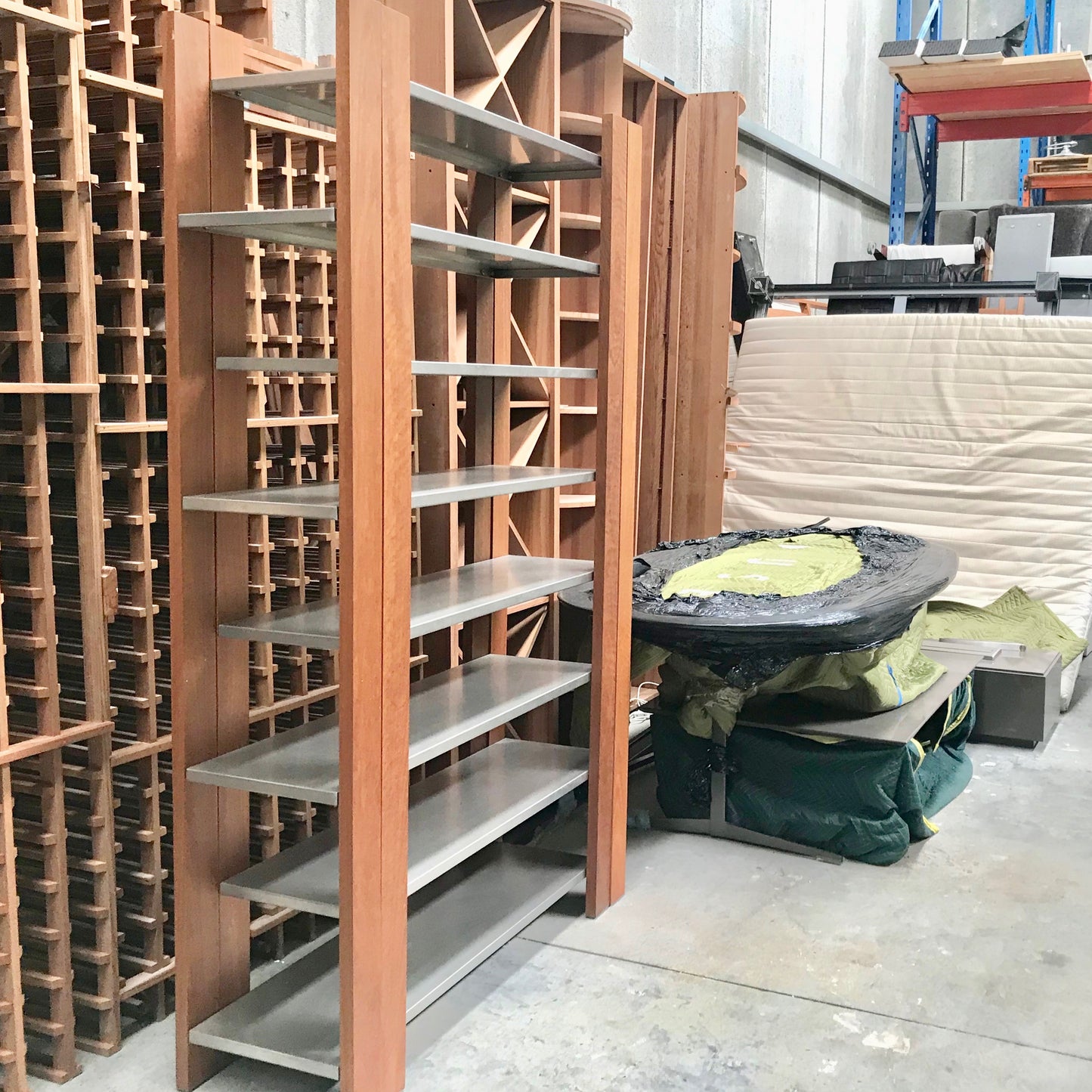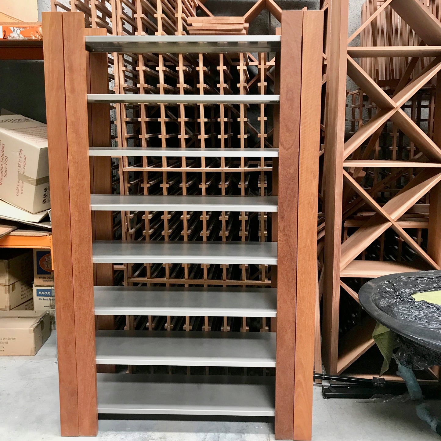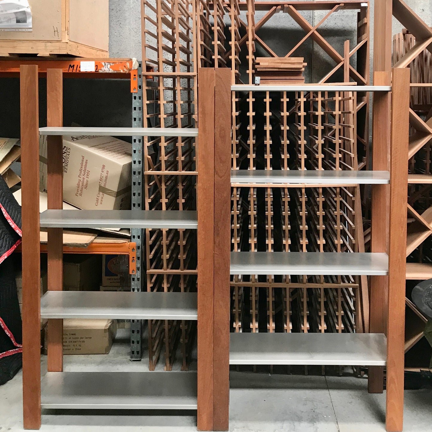 The Intersection Shelving Unit by Planet Furniture is constructed from solid spotted gum. Shelves are stainless steel they will not sag or buckle. Unit contracts and expands for variable width.