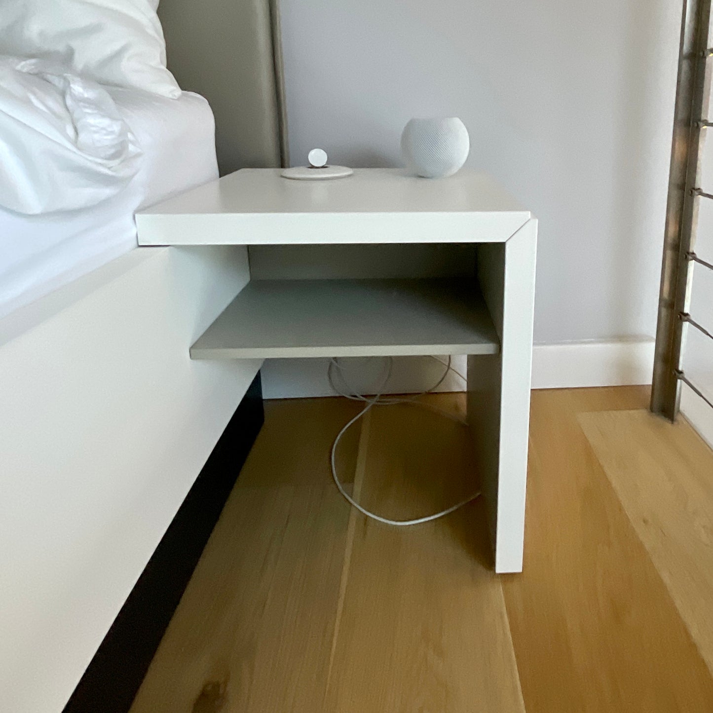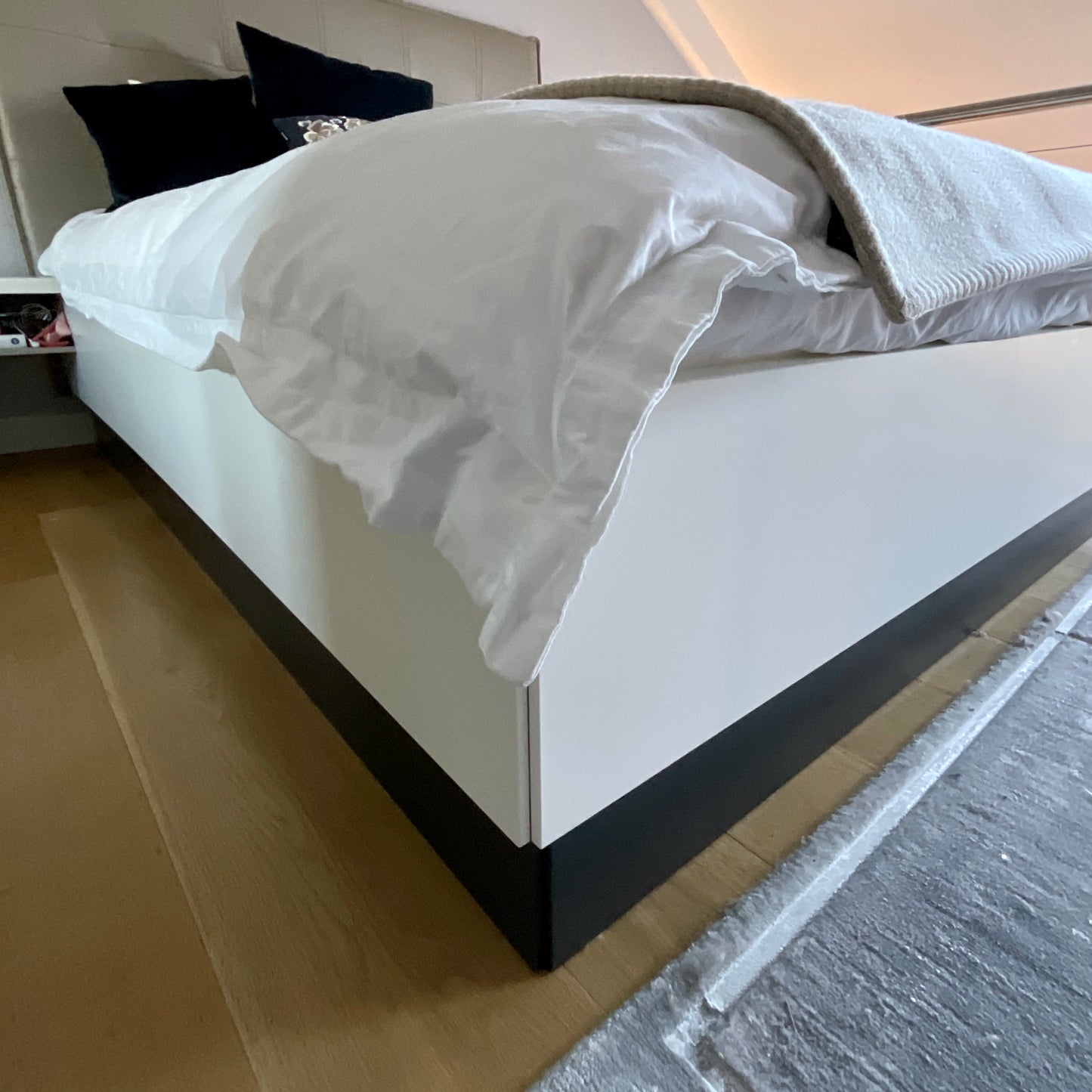 The Lugano collection by Danish Designer Morten Georgsen is a flexible concept perfect to invite comfort and functionality to your bedroom. Your bed should be a sanctuary. A peaceful place for relaxation. A place for sweet dreams and quiet moments. With the Lugano bedroom furniture, designer Morten Georgsen invites you to combine, create and get a personal bedroom that fits your life day and night. The bed we have on offer has a matt white laquered base and nightstands. Headboard is upholstered in Estoril Taupe Leather.