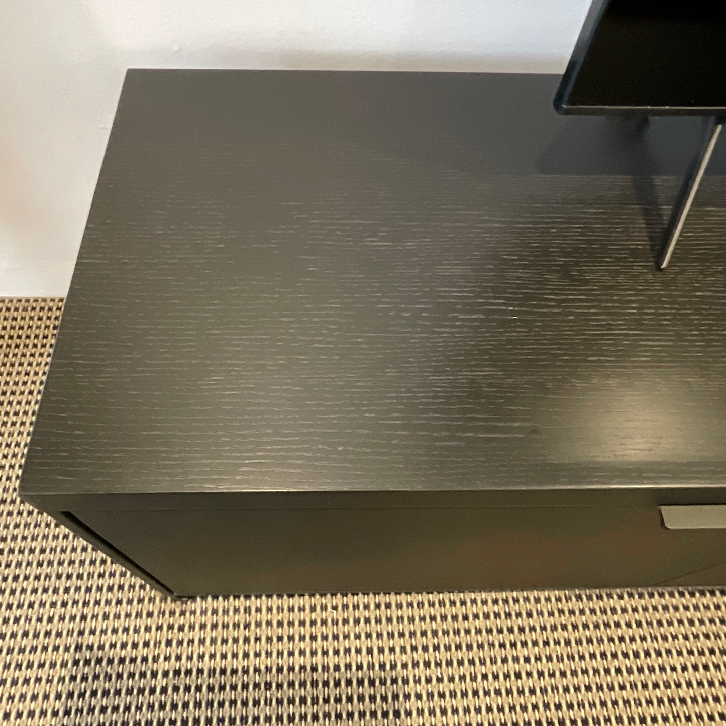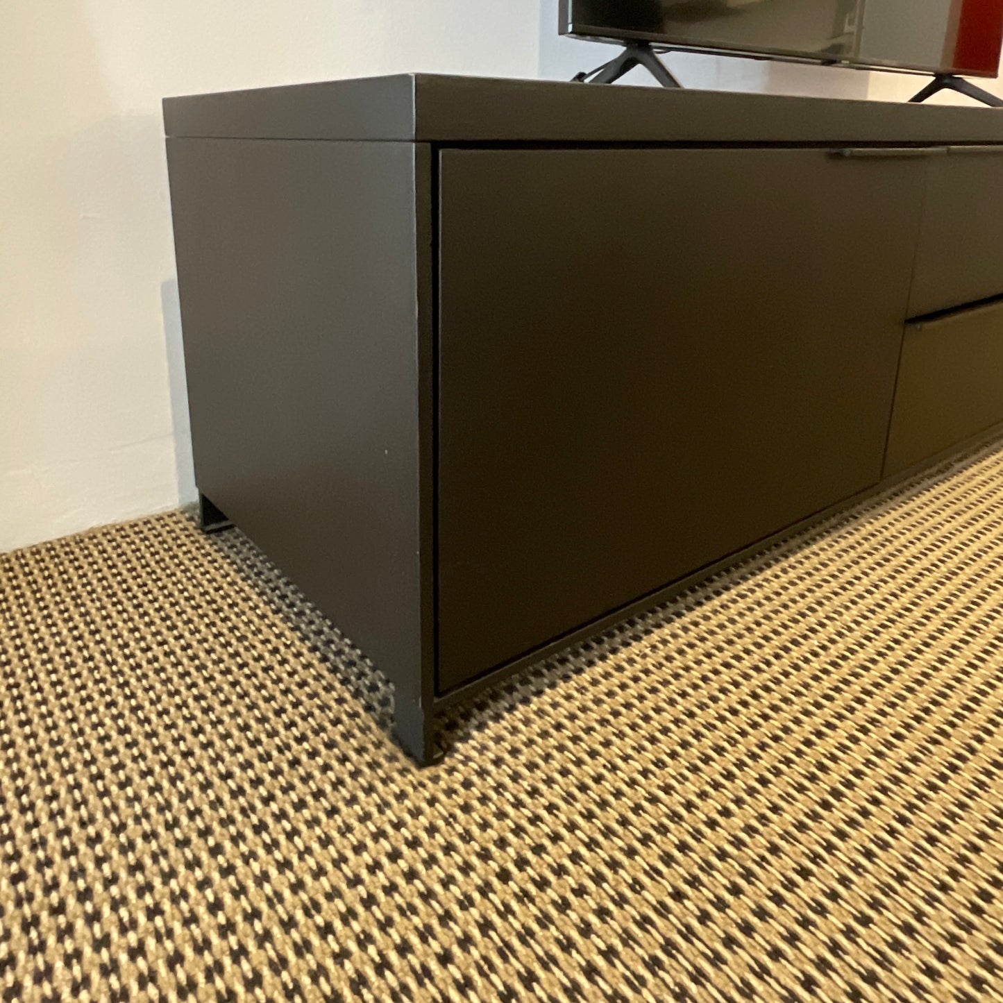 “Streamlined and elegant, the Max TV Unit slides effortlessly into your interiors. Let the Max’s clean lines amplify your space – as well tuck clutter out of sight. The low, contemporary media configuration perfectly accents a modern entryway. Max’s additional configurations offer sophisticated solutions in both petite and generous sizes to suit your needs. Choose from lush tops in veneered wood finishes of your choice – all supported by darkened steel frames and steel handles to match. These options pair perfectly with the full Max cabinet line.” The cabinet we have on offer has two centre drawers and a cabinet on either end.
