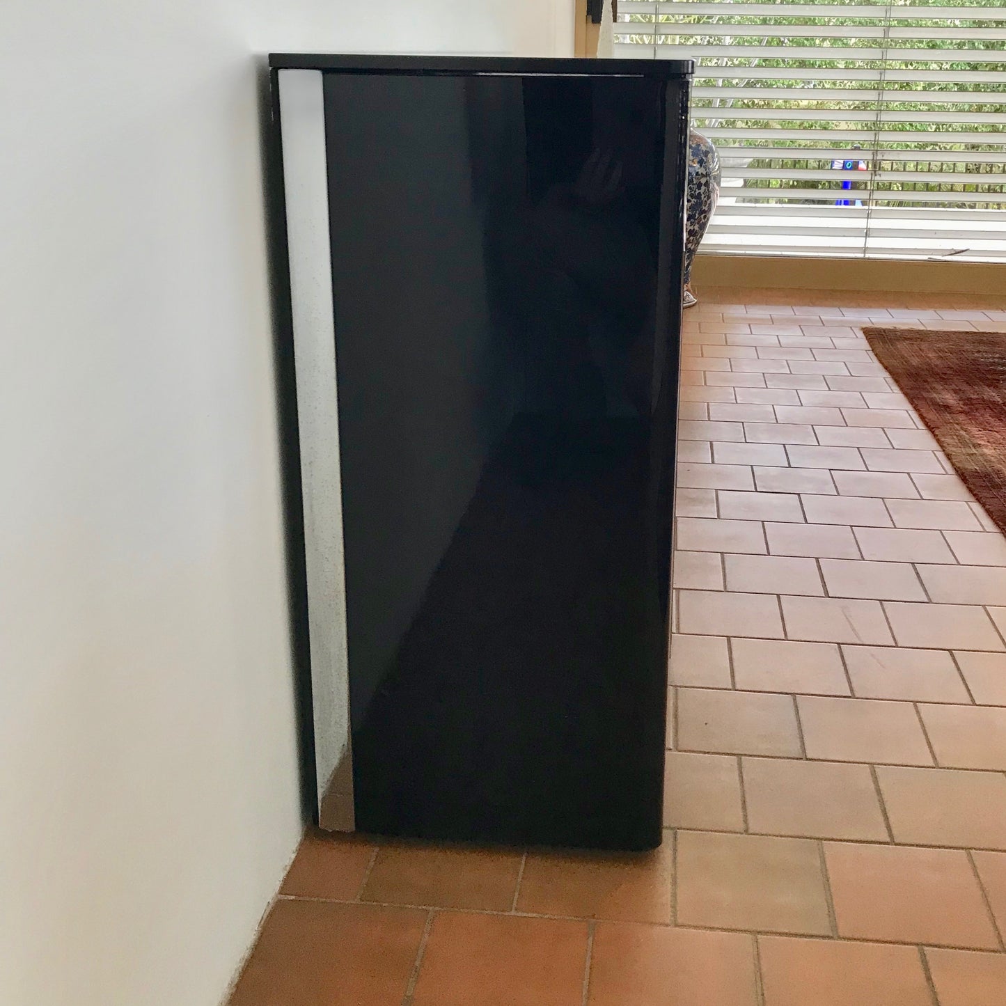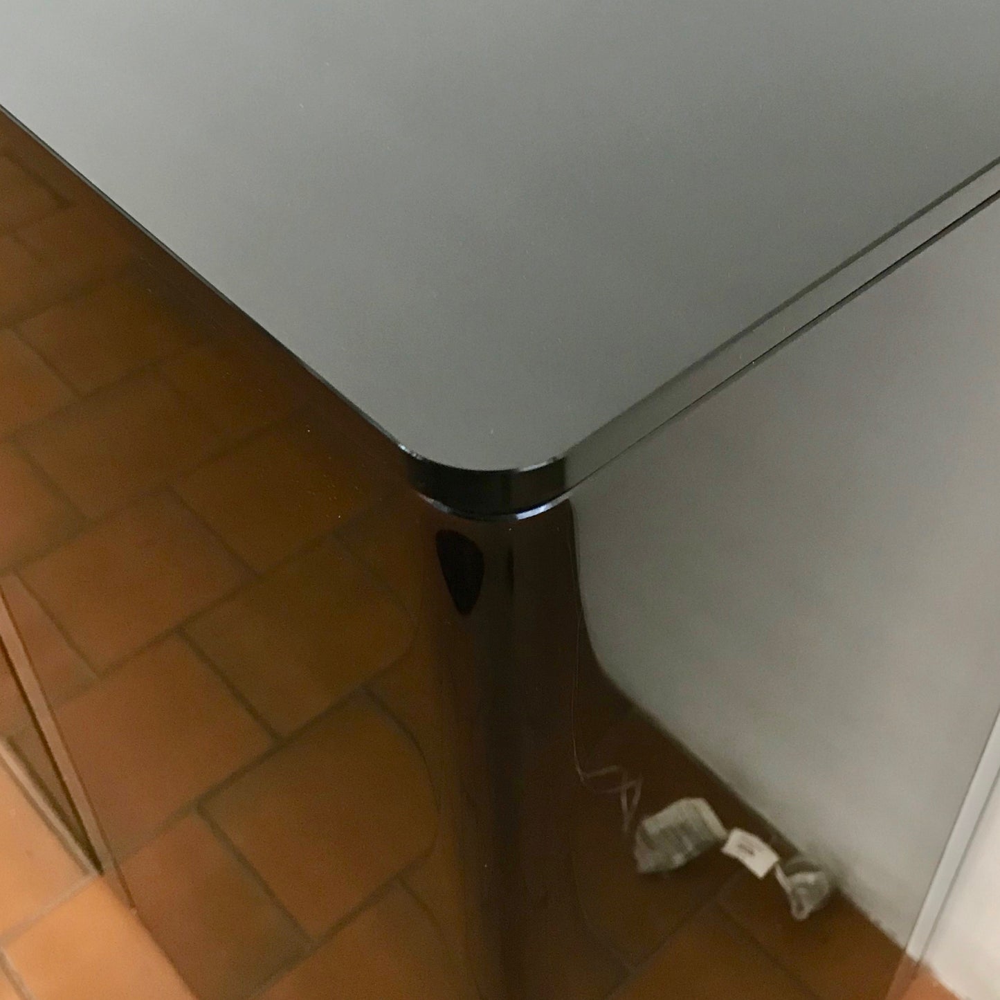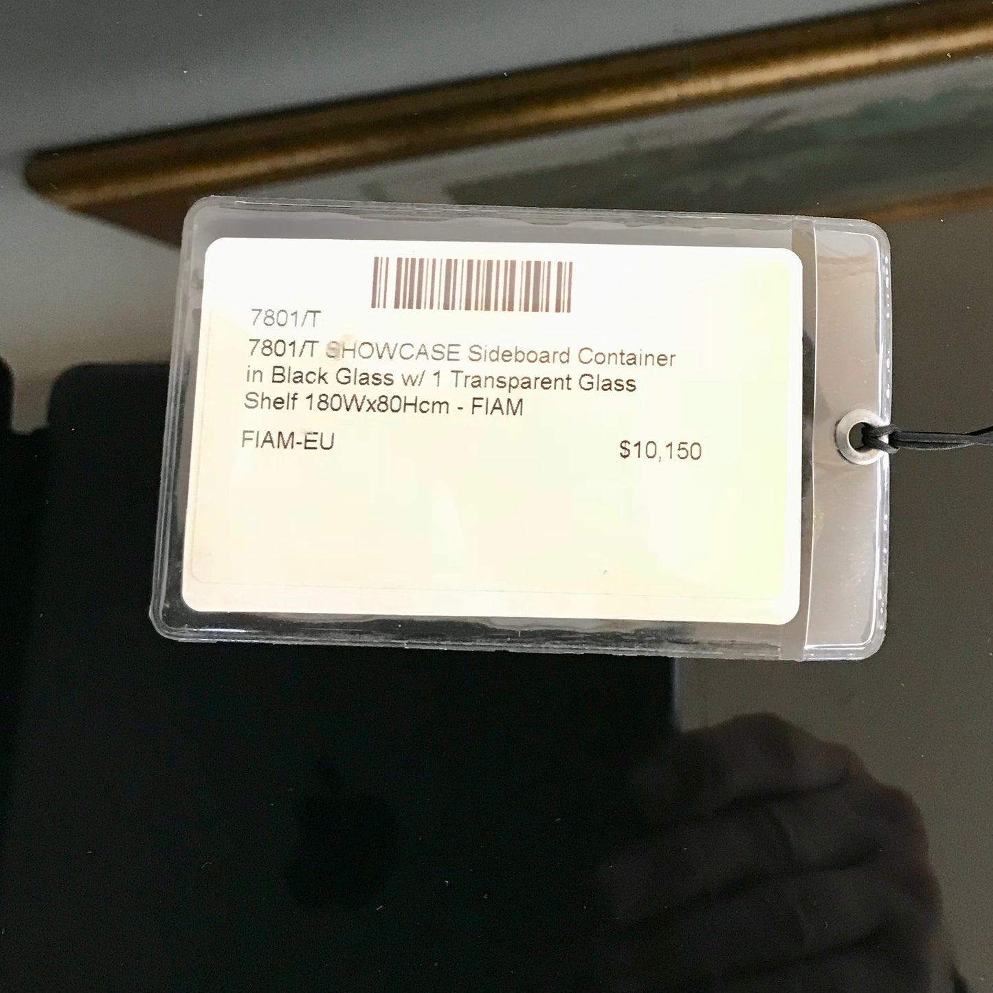 The Milo Sideboard 8 mm-thick curved glass with 10 mm-thick shelves, with brill aluminium and stainless steel metal fittings. The sideboard has central doors in 8 mm straight glass. The sideboard we have on offer is in black glass.
