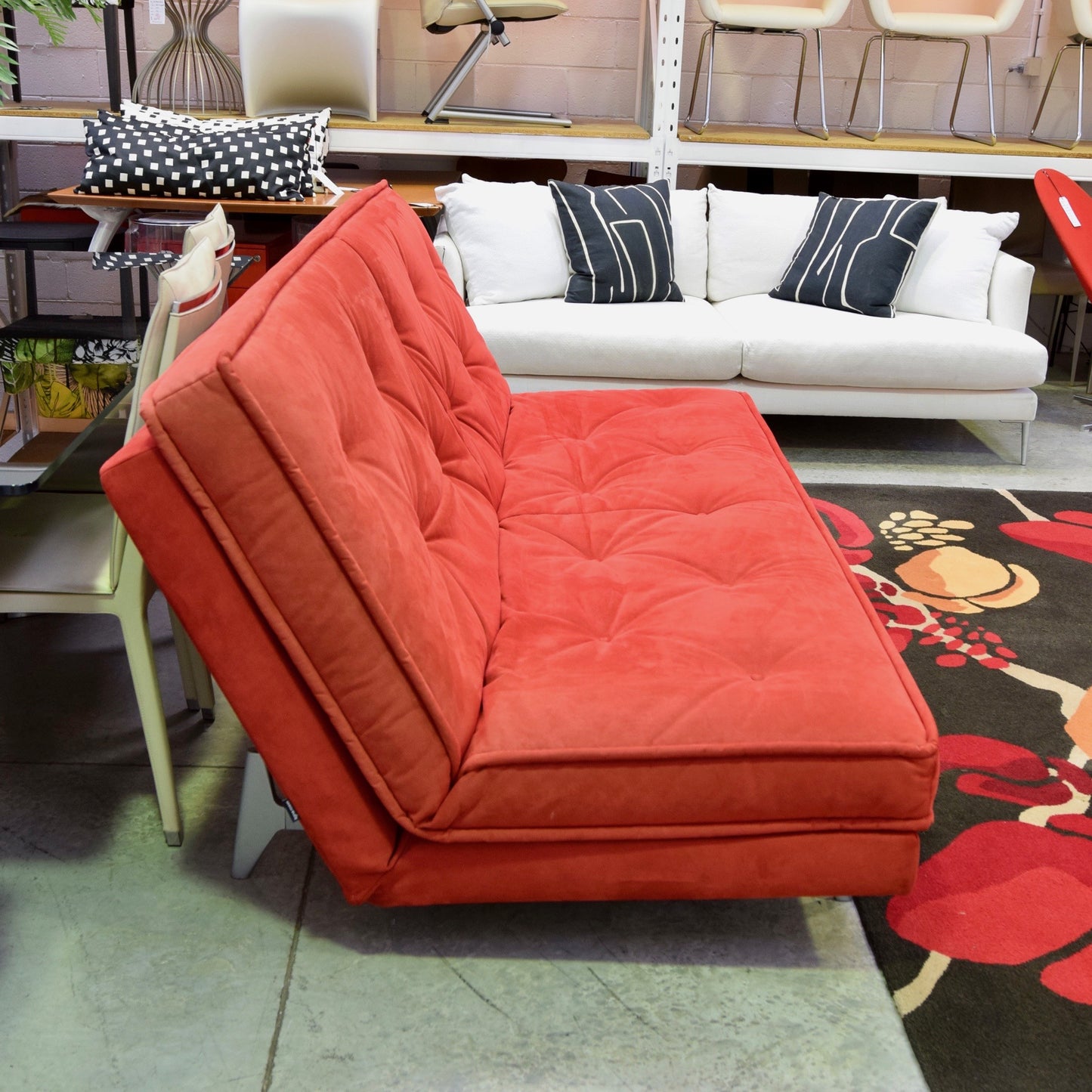 Nomade Express designed by Didier Gomez for Ligne Roset is a sofa-bed. A daily-use bed-settee of deliberately understated elegance. Well-proportioned with moulded aluminium feet and traditional, mattress-style buttoned cushions, it evokes the timeless style of the 1930's. The Nomade we have on offer is in a red microsuede.