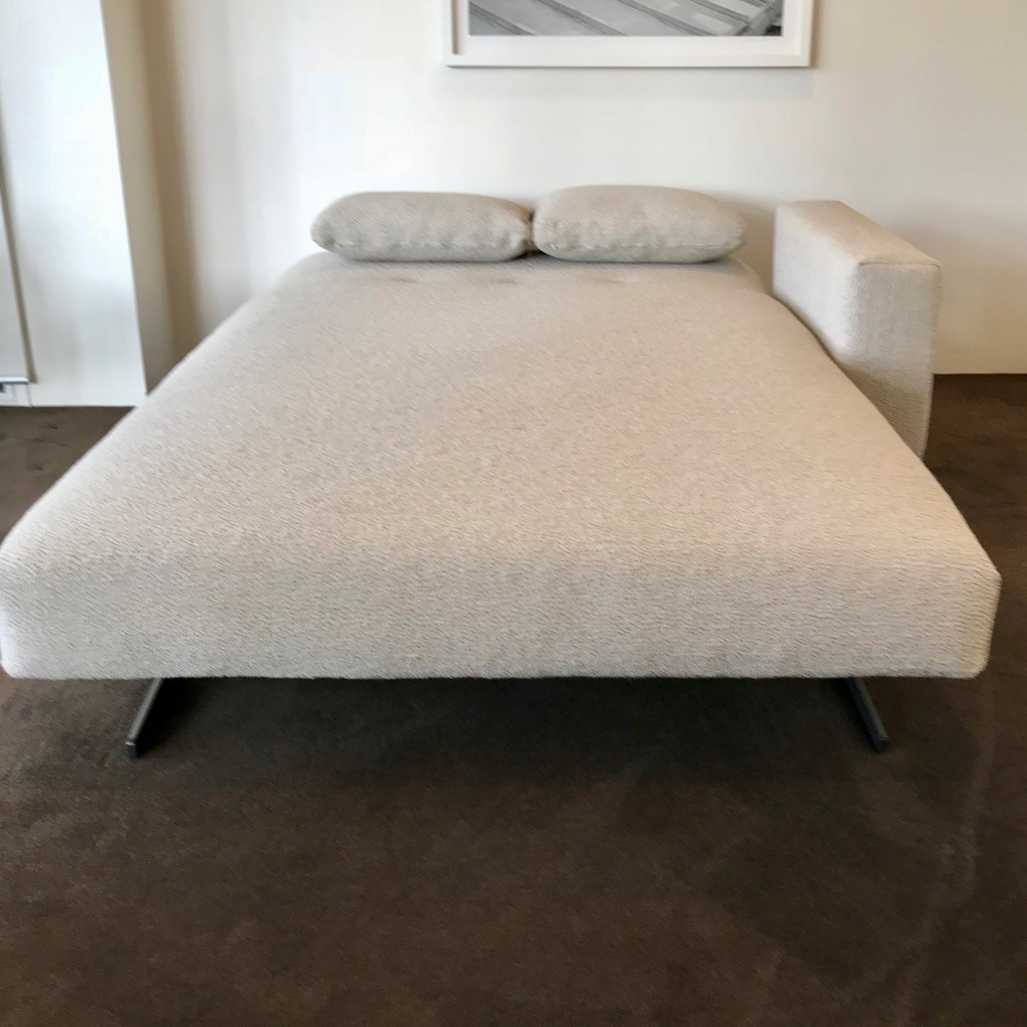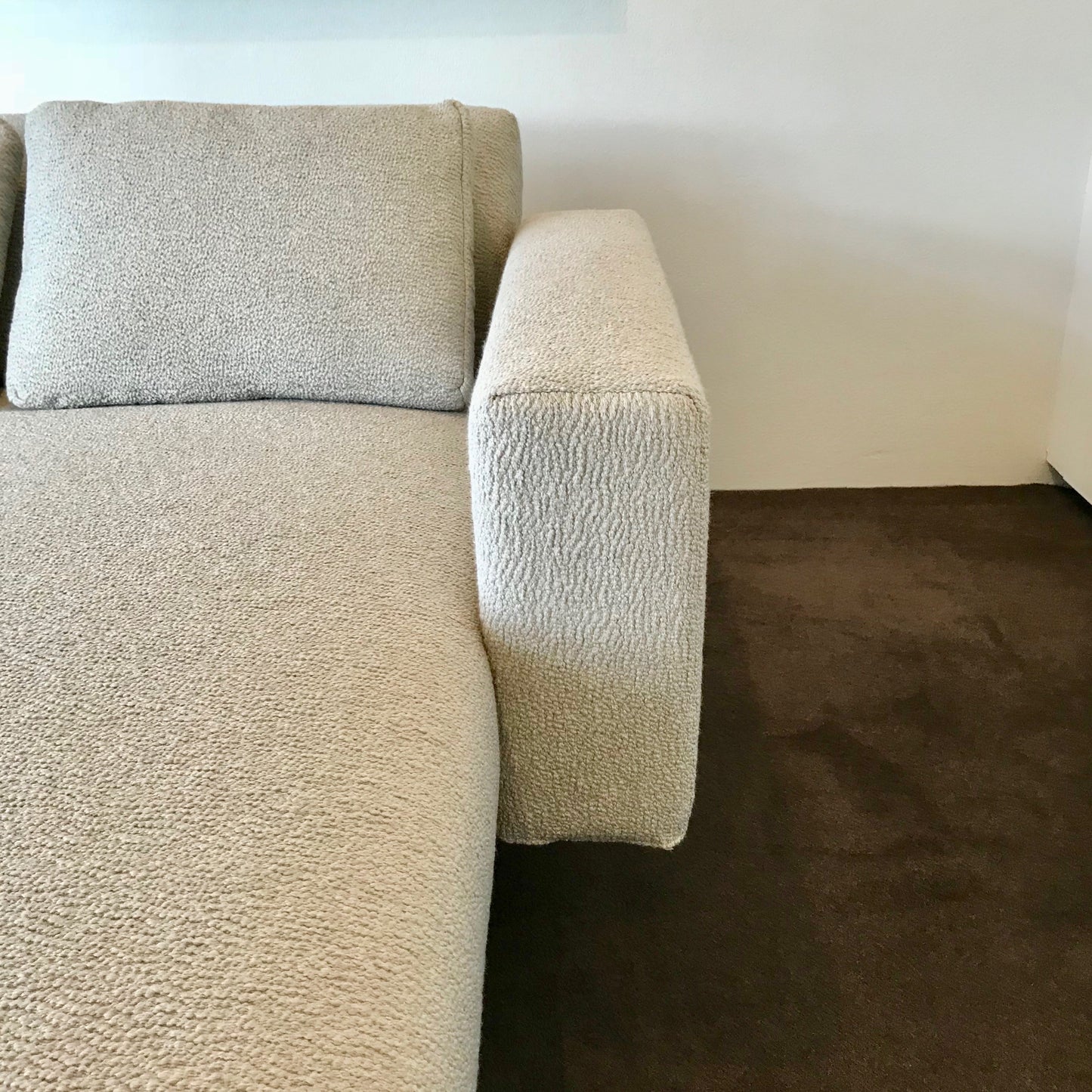 The Record chaise / sofa bed has an adjustable back that adjusts from flat to upright. The chaise we have on offer has a fixed armrest on the left. The chaise has anthracite finish on the feet the upholstery is Extra 11052 colour Siberia.