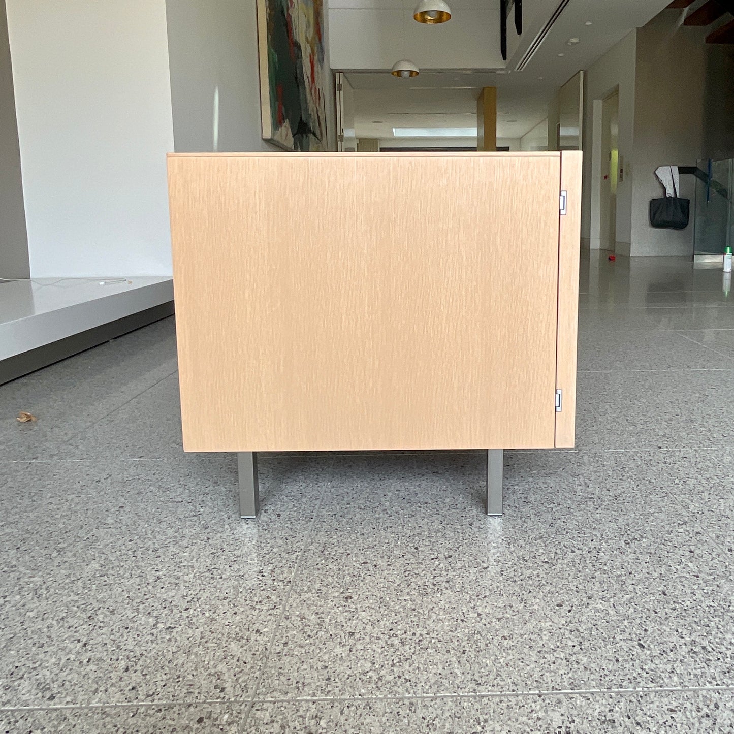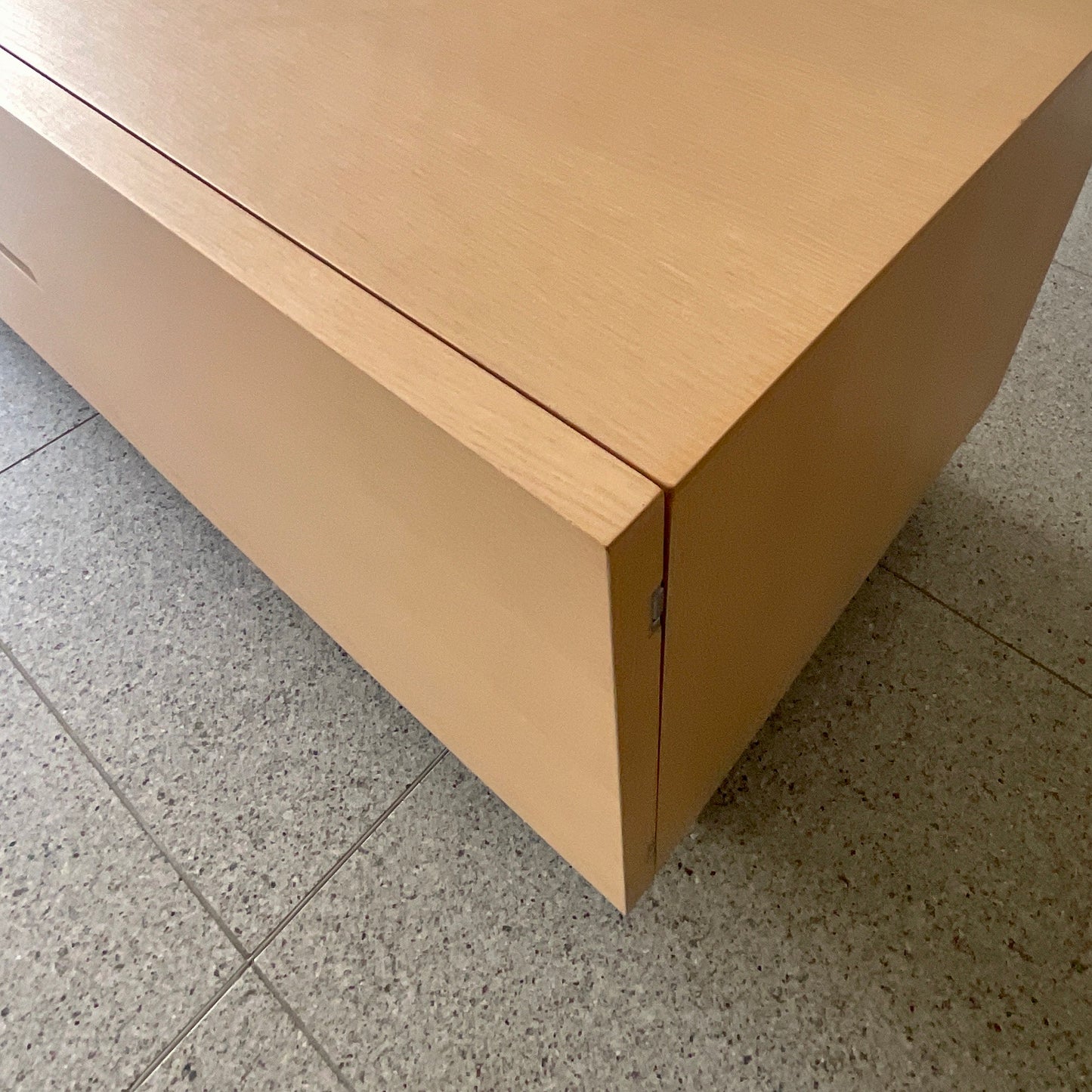 The sideboard by Poliform we have on offer is in American Oak. The cabinet has two pullout central drawers and a door both ends.