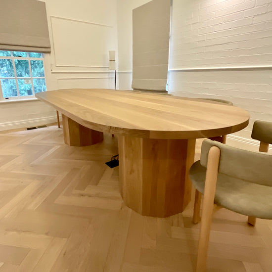 14. Grazia & Co Dining area with a round dark wooden table and beige chairs in a well-lit room.