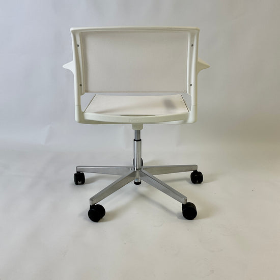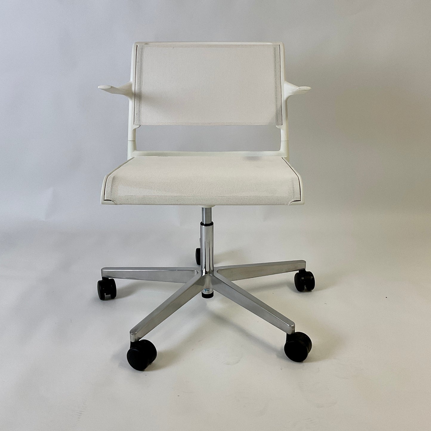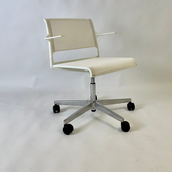 Thanks to its intelligent design and high-quality materials, Aline combines a light, delicate design with high stability and comfort. Ideal for a wide range of applications – from the office to the living room. The chair we have on offer has a chrome base, white polyamide seat and back frame and a white mesh seat and back. The chair is height adjustable.