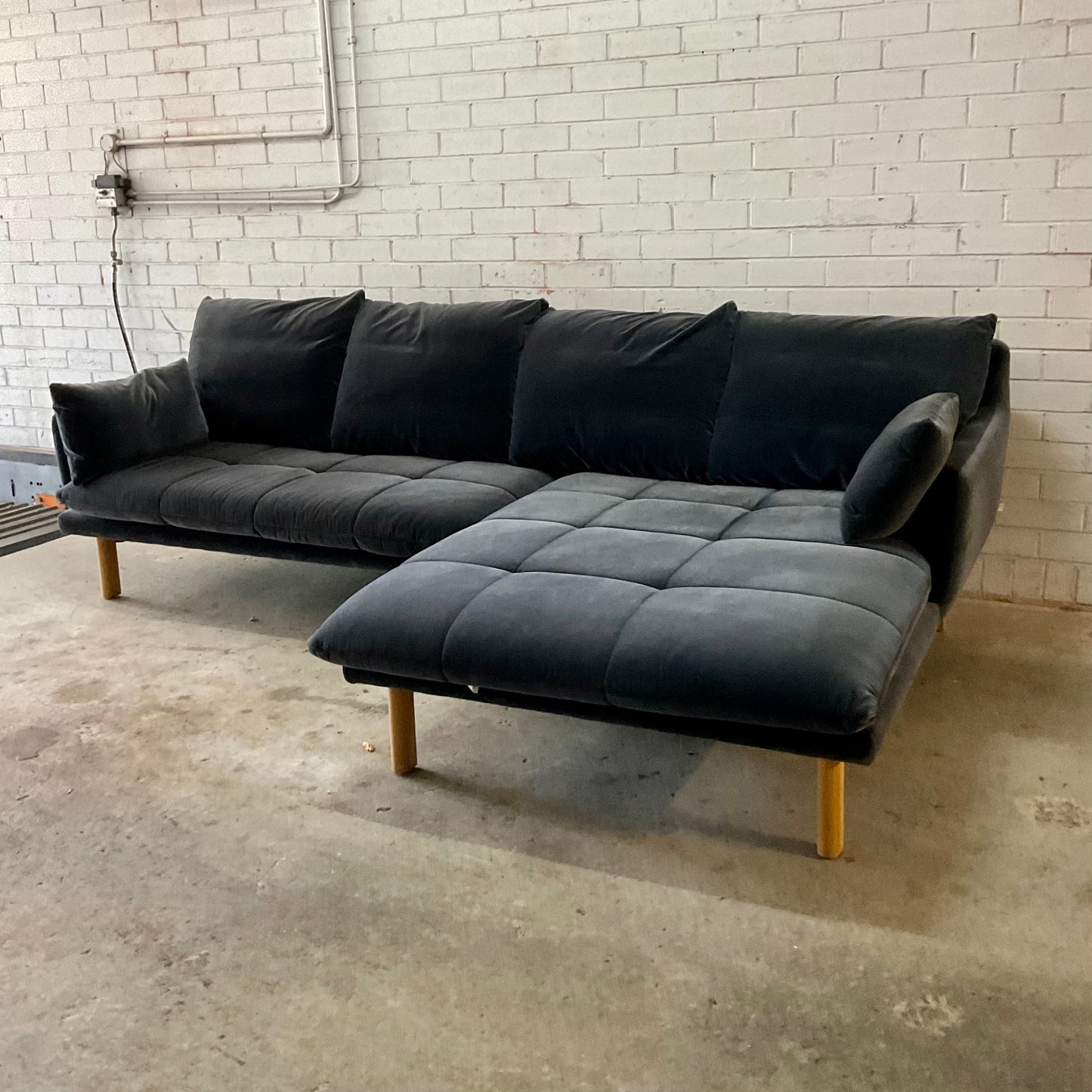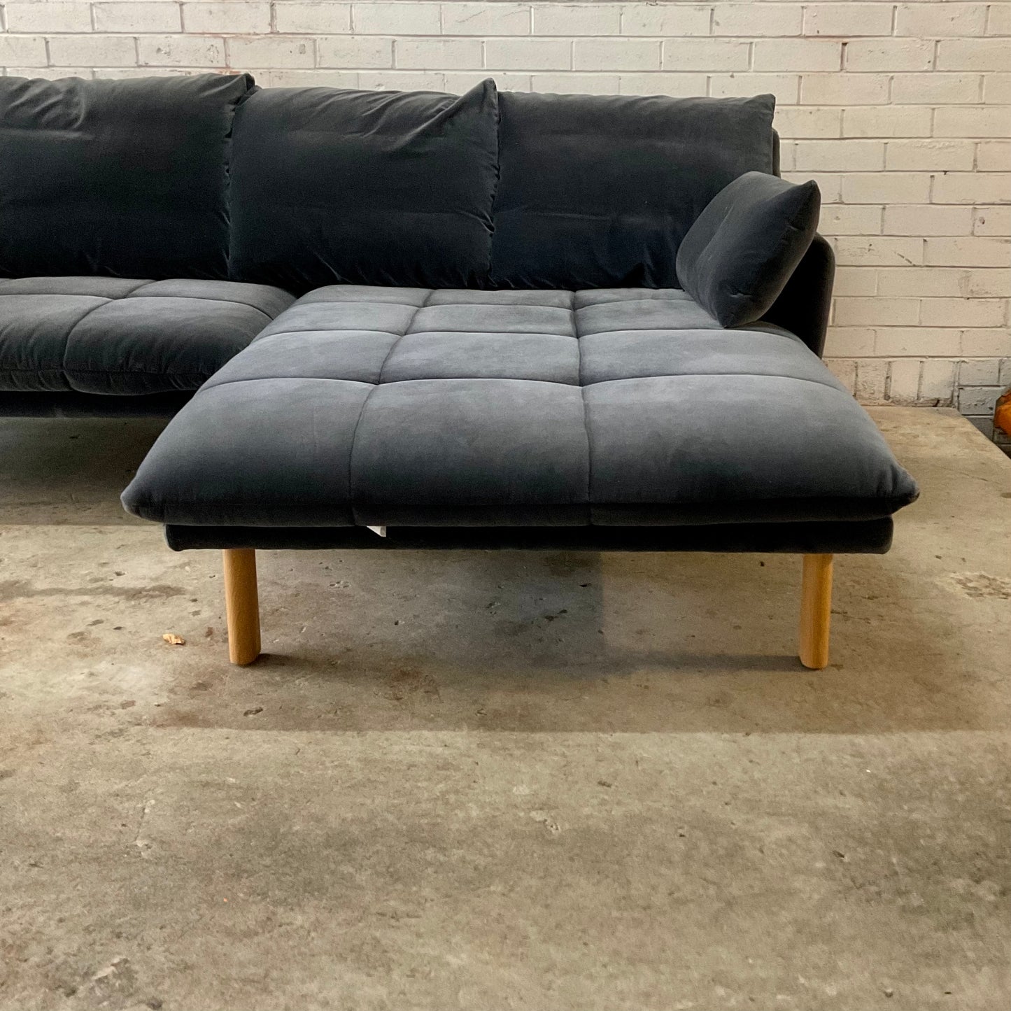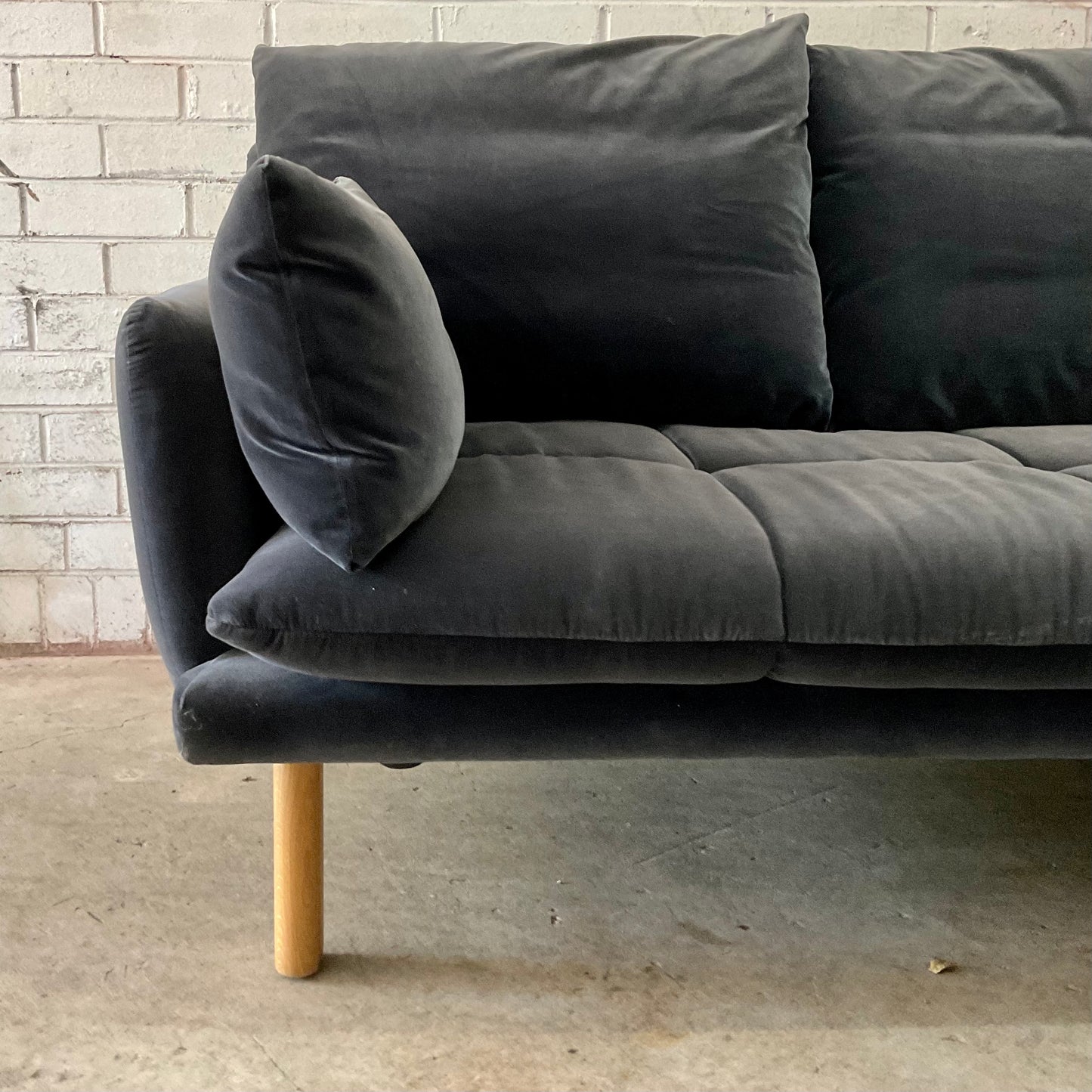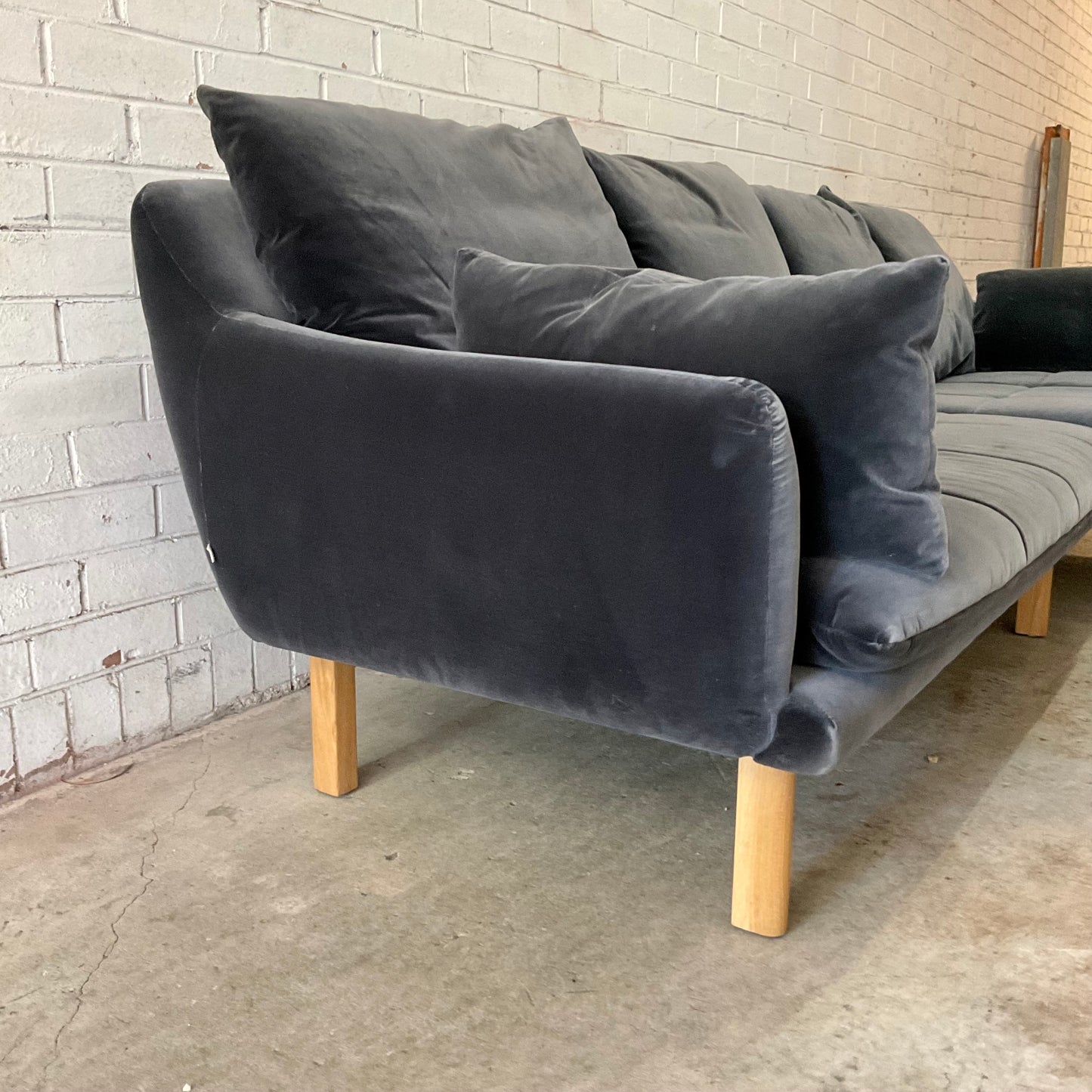With graphic quilting and a slender frame, Andy has a relaxed elegance. Softened with feather down and memory foam cushions, Andy gently shapes to the form of the body. It’s designed to offer more relaxed lounging, ideal for the whole family. The sofa we have on offer is in grey velvet with natural stained legs.