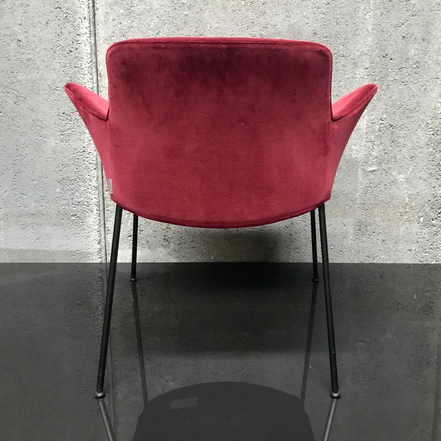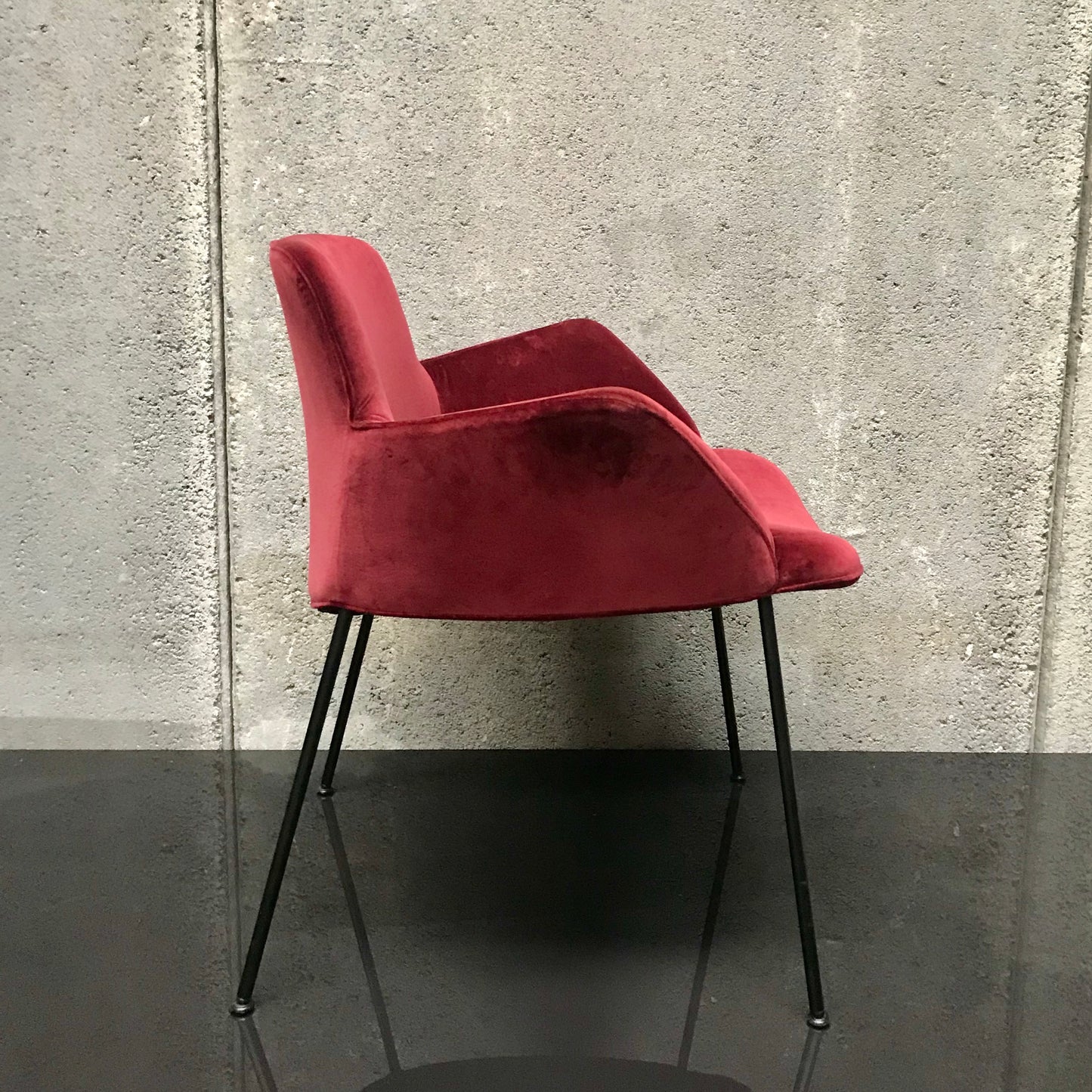 Sometimes treasures are hidden in the archives. The Burgaz Chair by Sadi & Neptune Ozis is such a treasure. In the play of line and surface, lightweight steel tube and comfortable seat. In the original of 1953 made of cable cords now provides the padding for convenience. Consistently modern, elegant, generous. A design of lasting relevance. The chair we have on offer is upholstered in a crimson velvet.