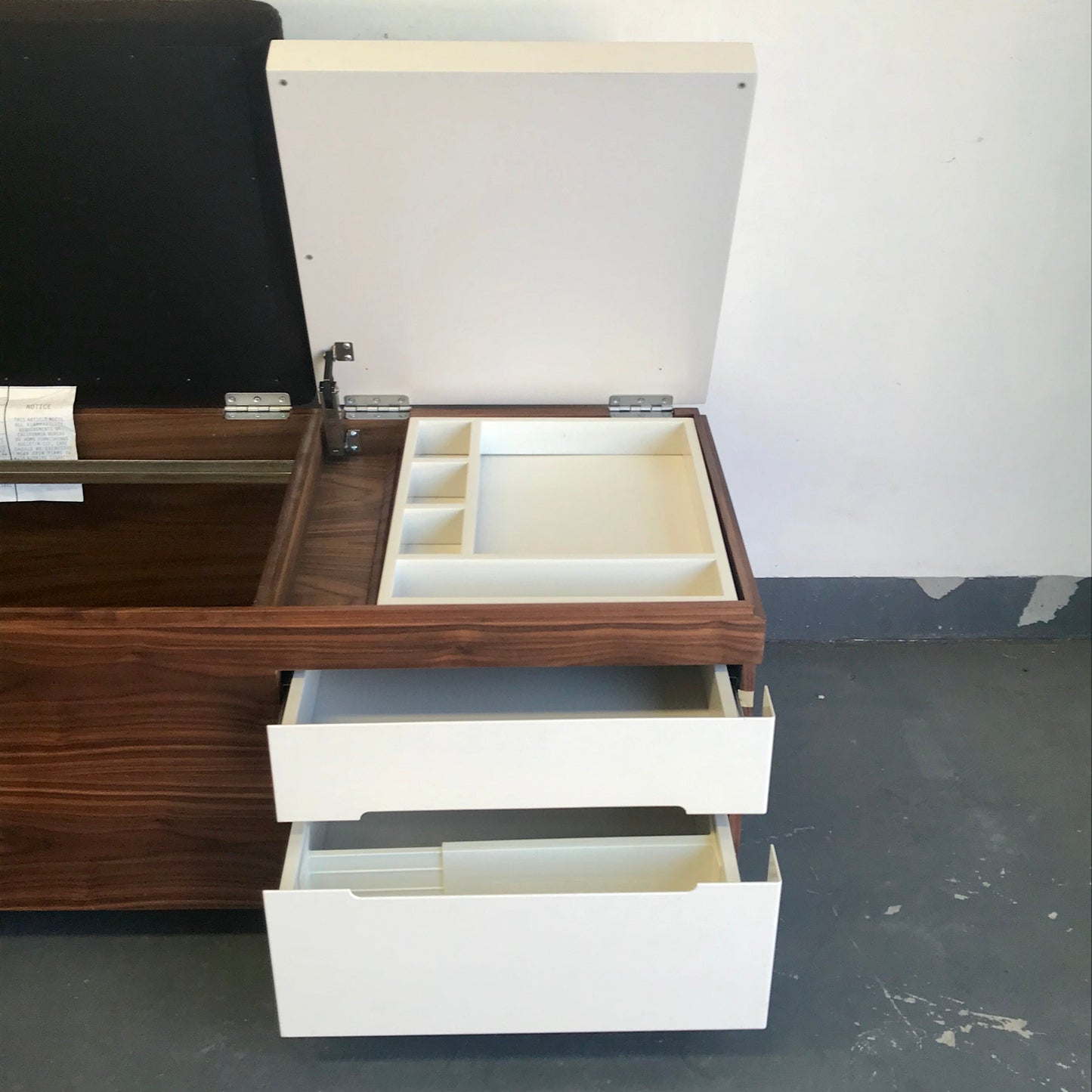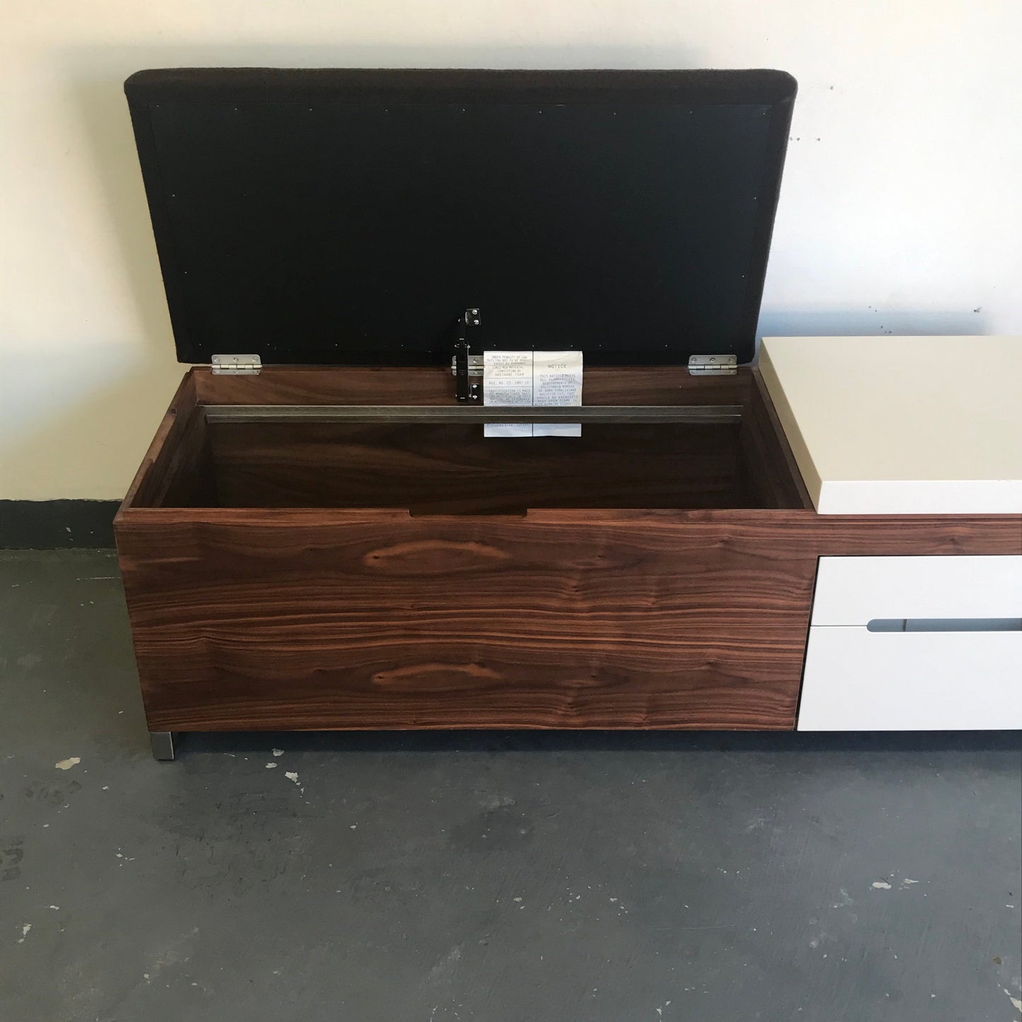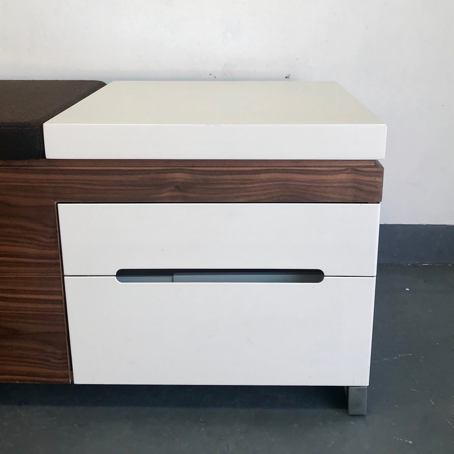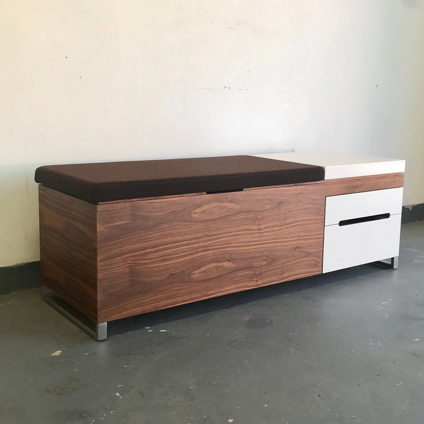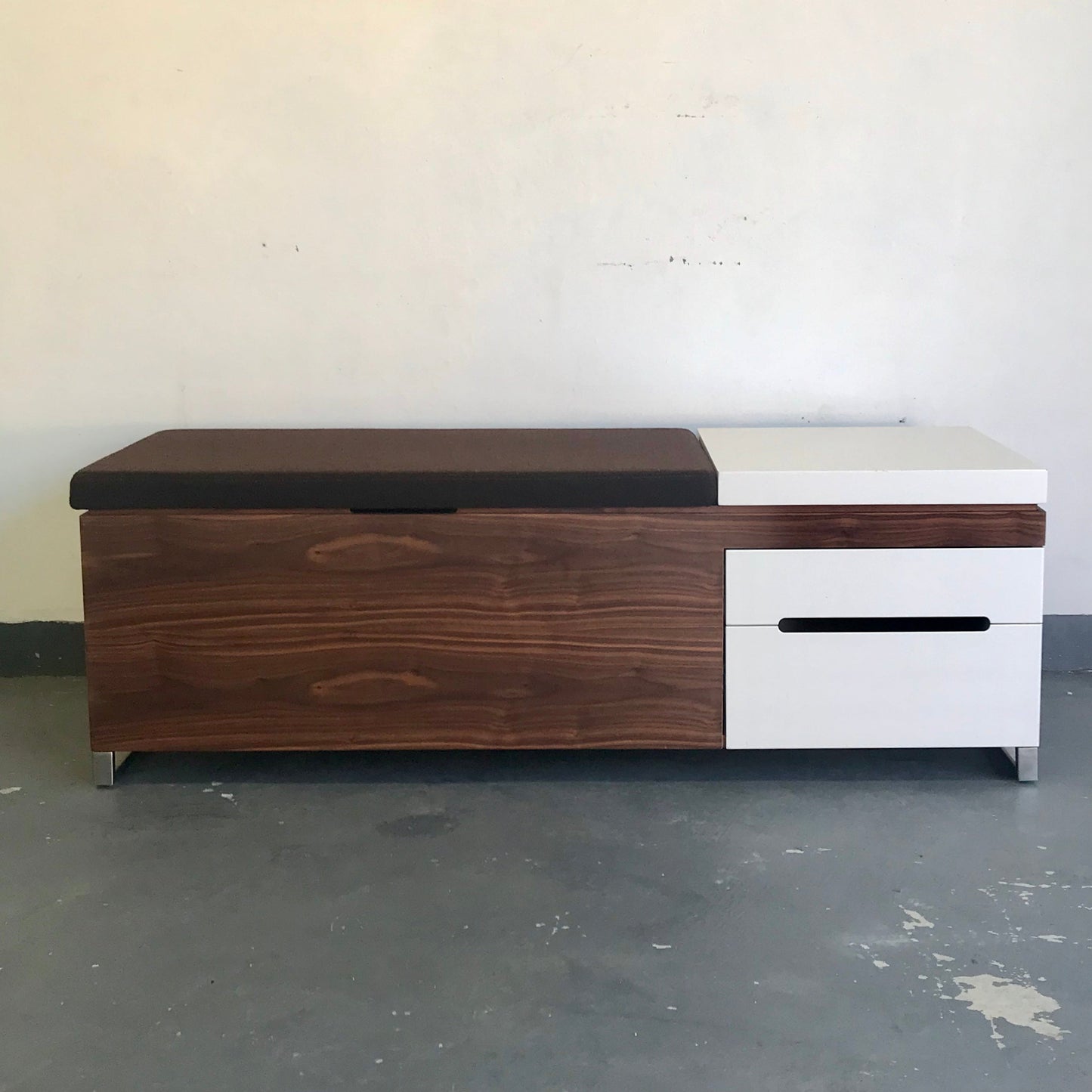This is a great chance as the Herman Miller Store has discontinued the Cognita Storage Bench by renowned design firm Blu Dot! The brown upholstered top offers an extra seat, and the hard surface is good for equipment or display. The versatile storage compartments can hold hanging files, linens, toys, photo albums—you name it. With two drawers and a removable organising tray, you can also store smaller things and find them when you need them. The fabric is a brown wool.
