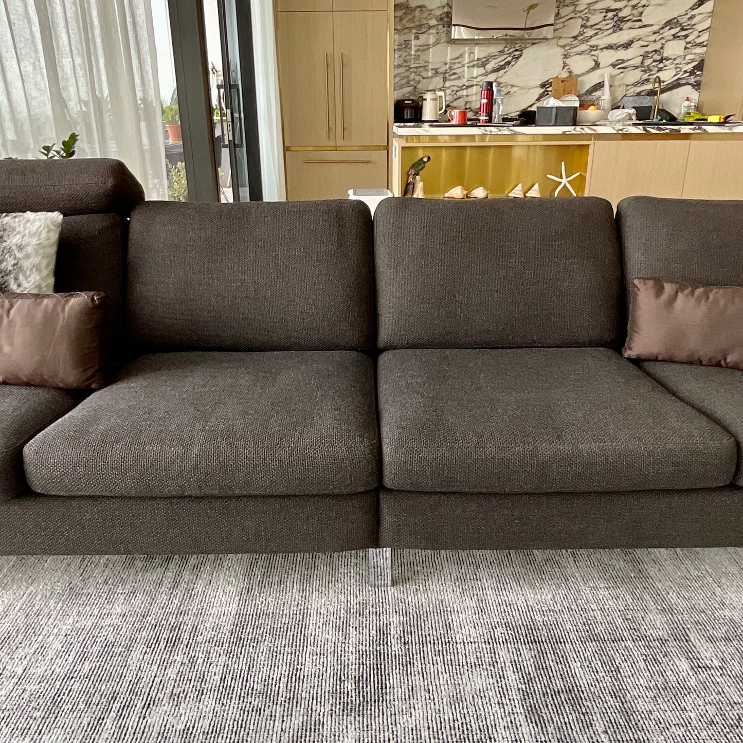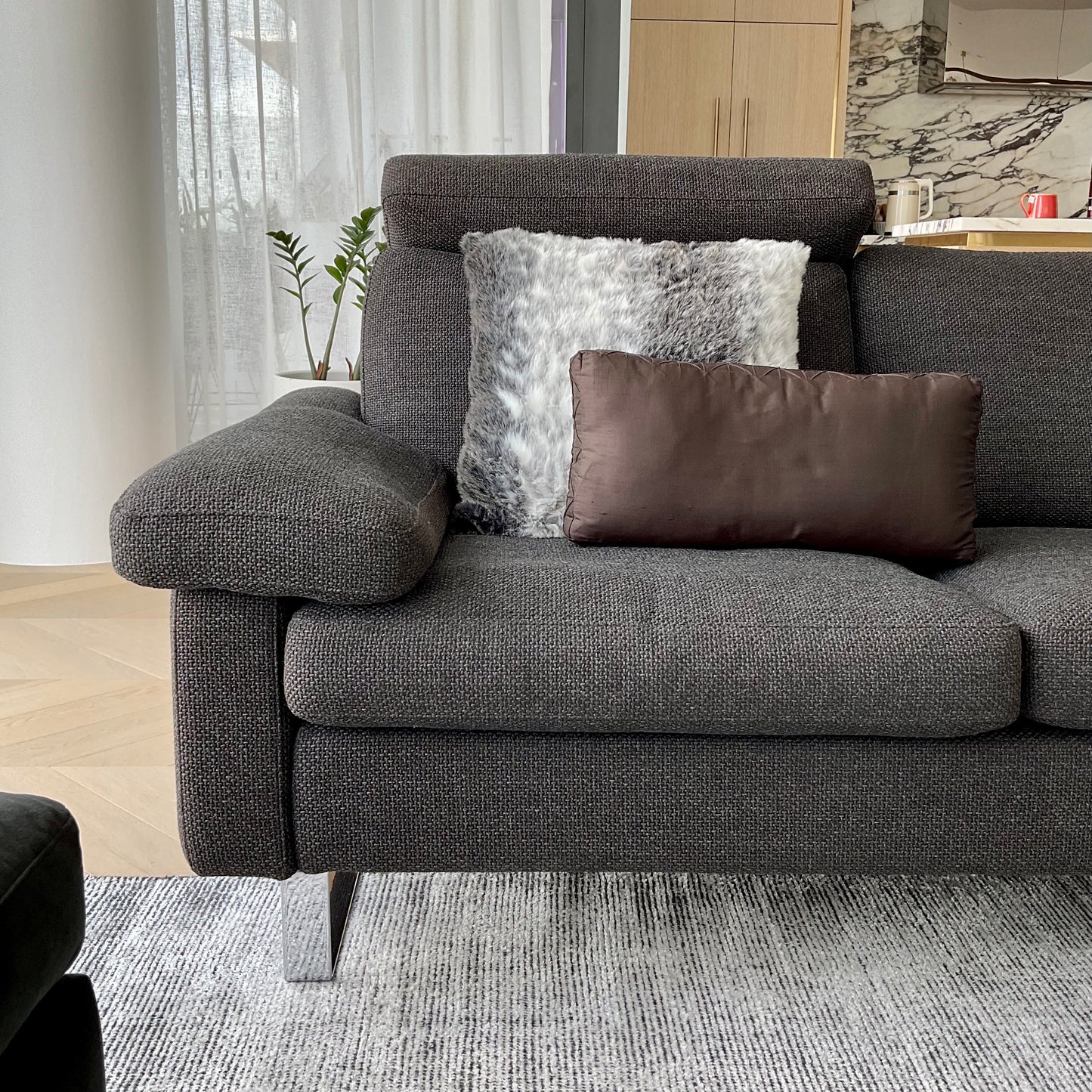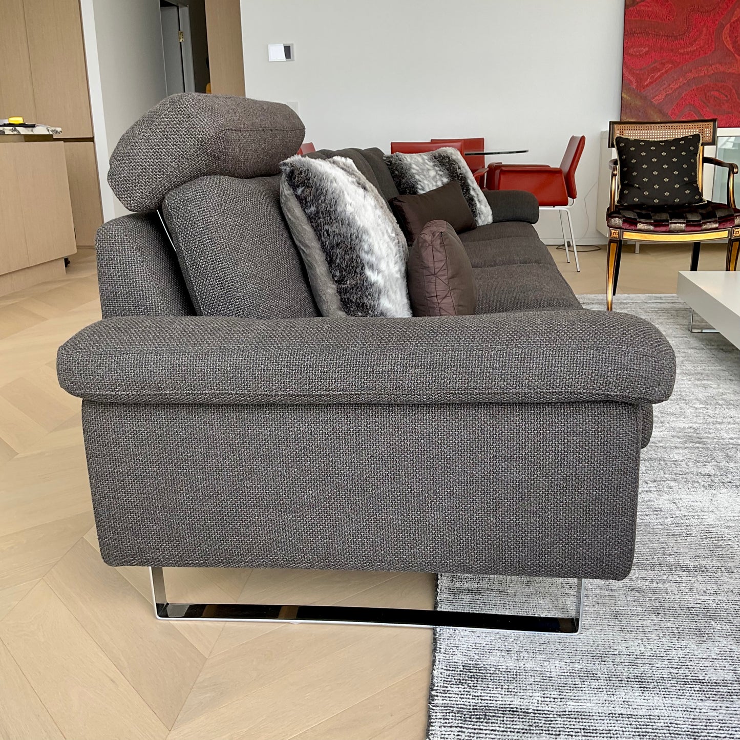 Conseta is not only a sofa programme but also an add-on programme offering countless possibilities. Elements of different shapes and sizes combined with a choice of armrests give plenty of scope to explore configurations to fit every room. Various styles of armrest and of carcass widths and a choice of cushion fillings give birth to a wide range of design solutions. The sofa we have on offer has two modules that could be used separately. The sofa is upholstered in a grey fabric and hass polished chrome supports.