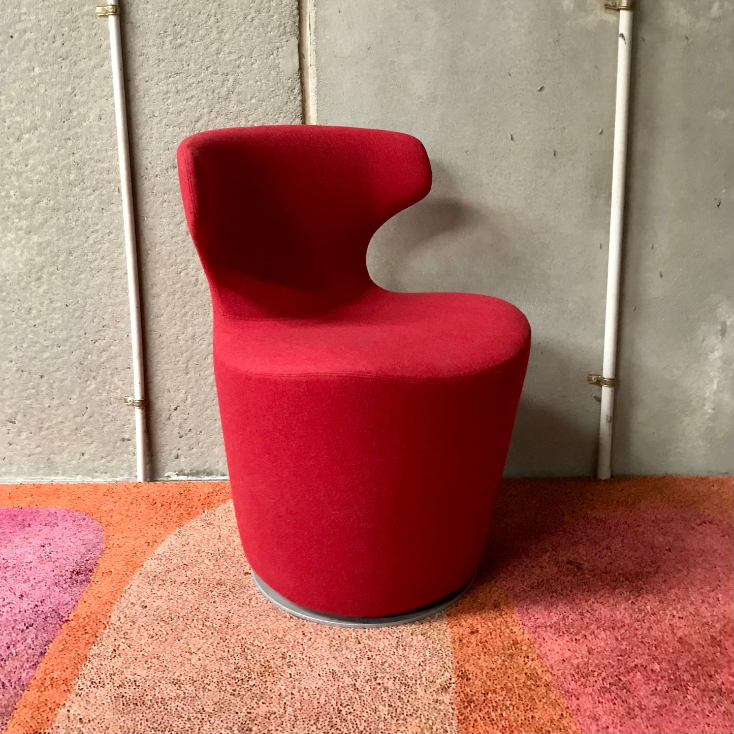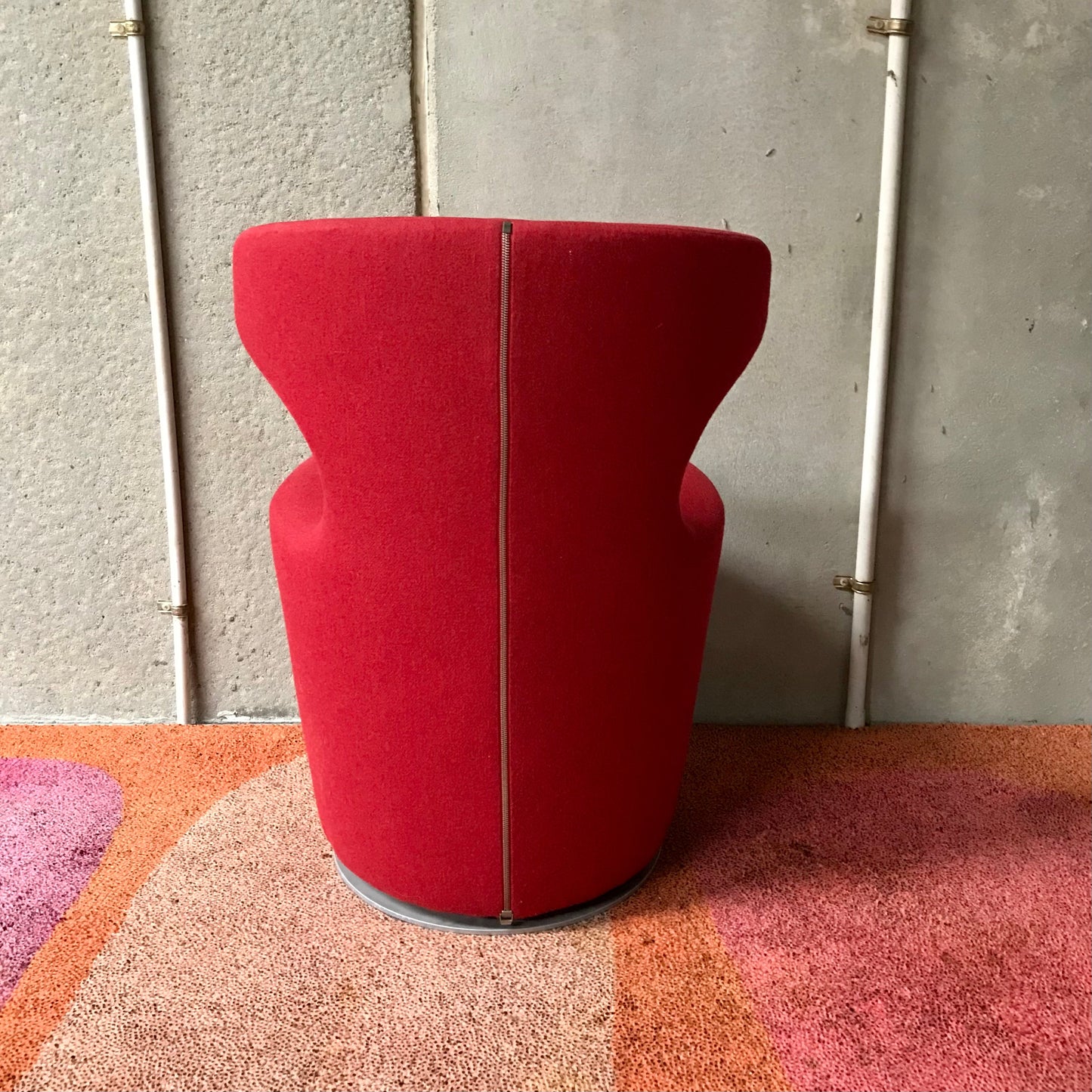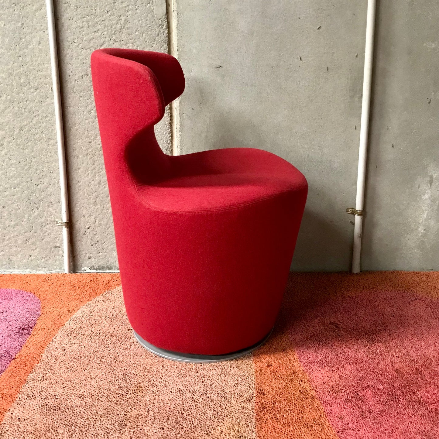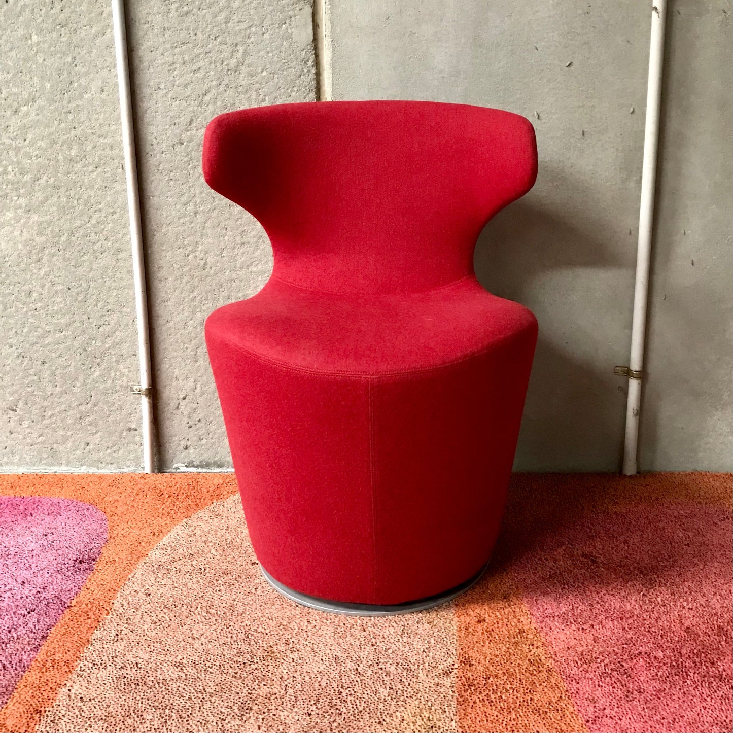 Upholstered either in fabric or leather and suited to both residential and public spaces, Mini Papilio echoes the characteristics of the iconic Grande Papilio armchair, only on a smaller scale. The playful design features a swivel base allowing 360 degree rotation with automatic return to the pre-set position. The image is that of a chair that welcomes you gracefully – with the graceful movement of a butterfly, or “papilio” in Latin. Fluidly designed around an upside-down truncated cone, the welcoming and sinuous shape of the seat and back ensures utmost comfort to the user. The wings that extend beyond the sides of the chair emphasise the feeling of comfort by supporting the hips and back. The chair we have on offer is upholstered in a red wool fabric.