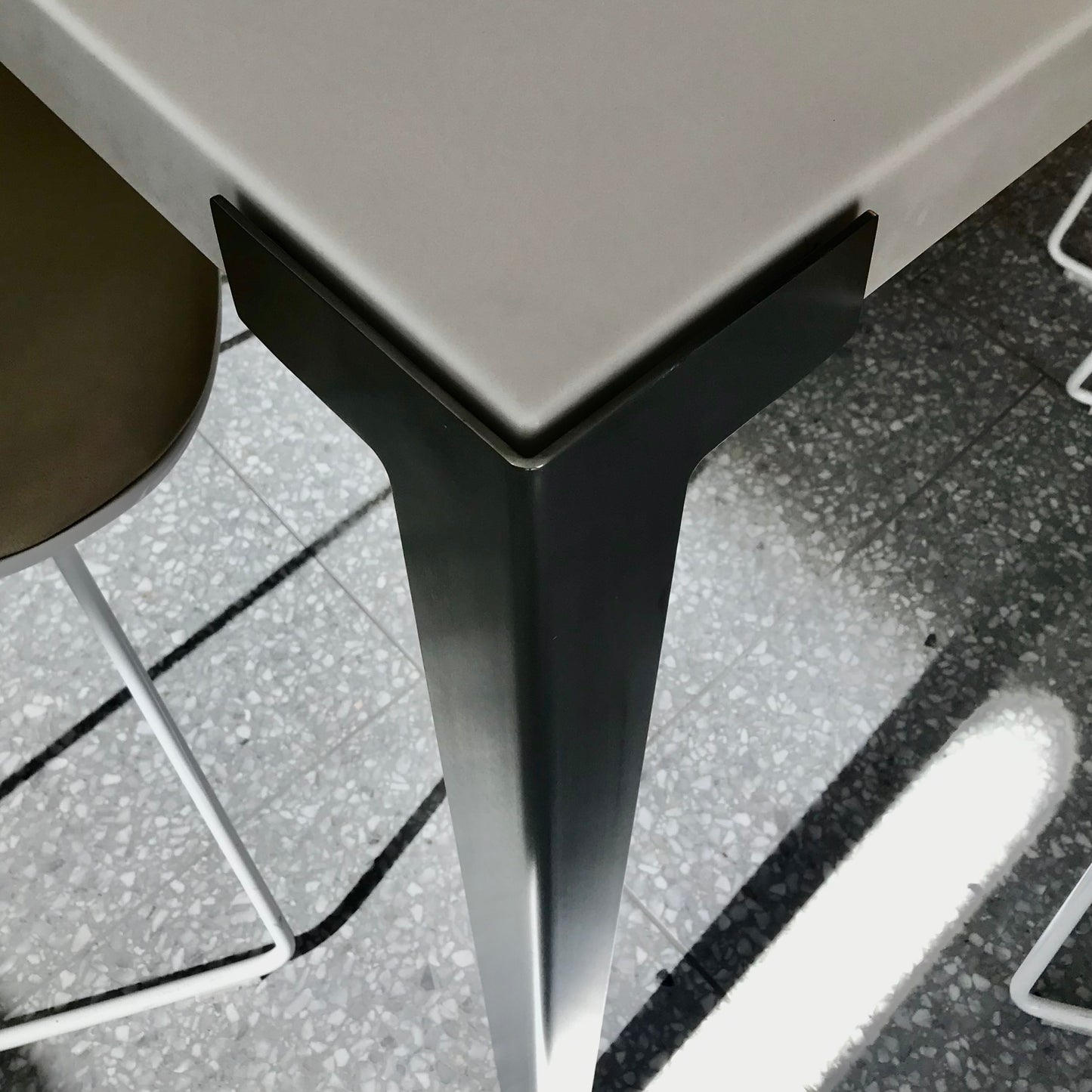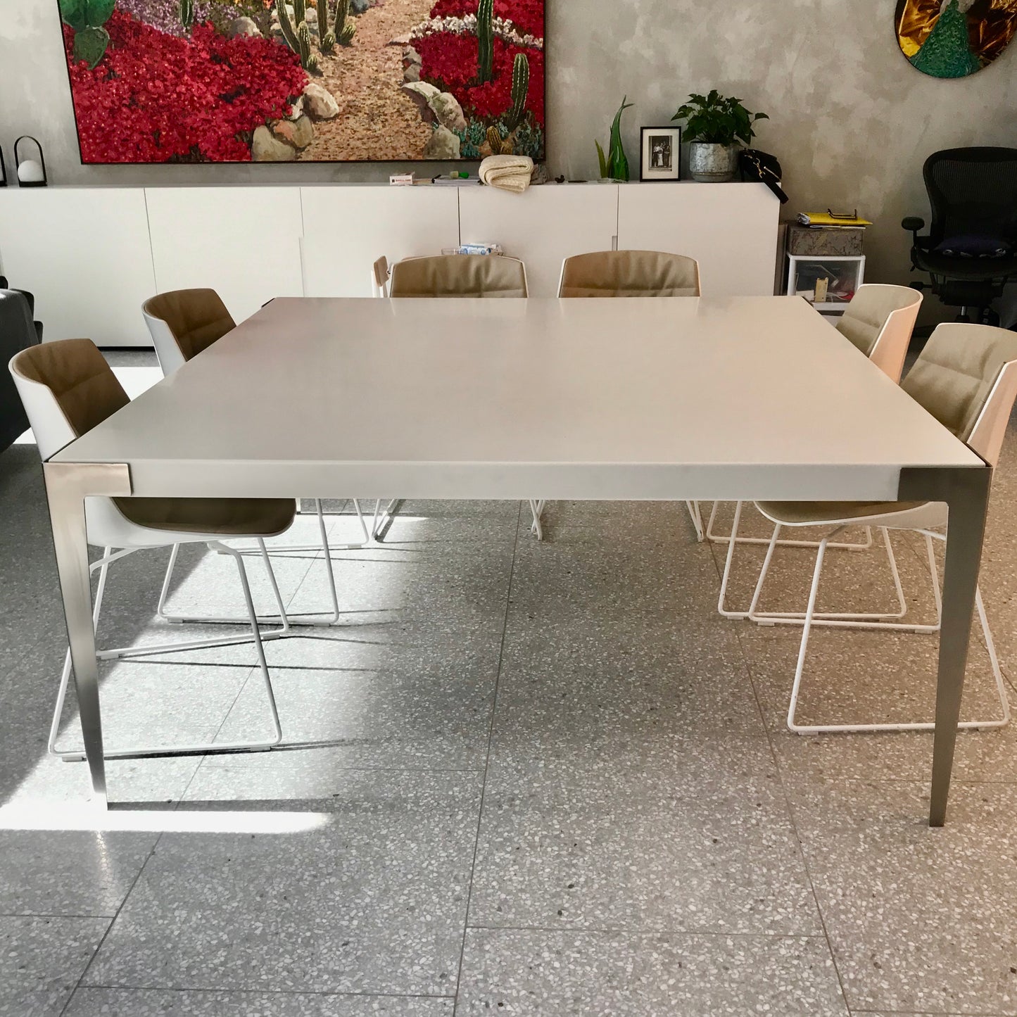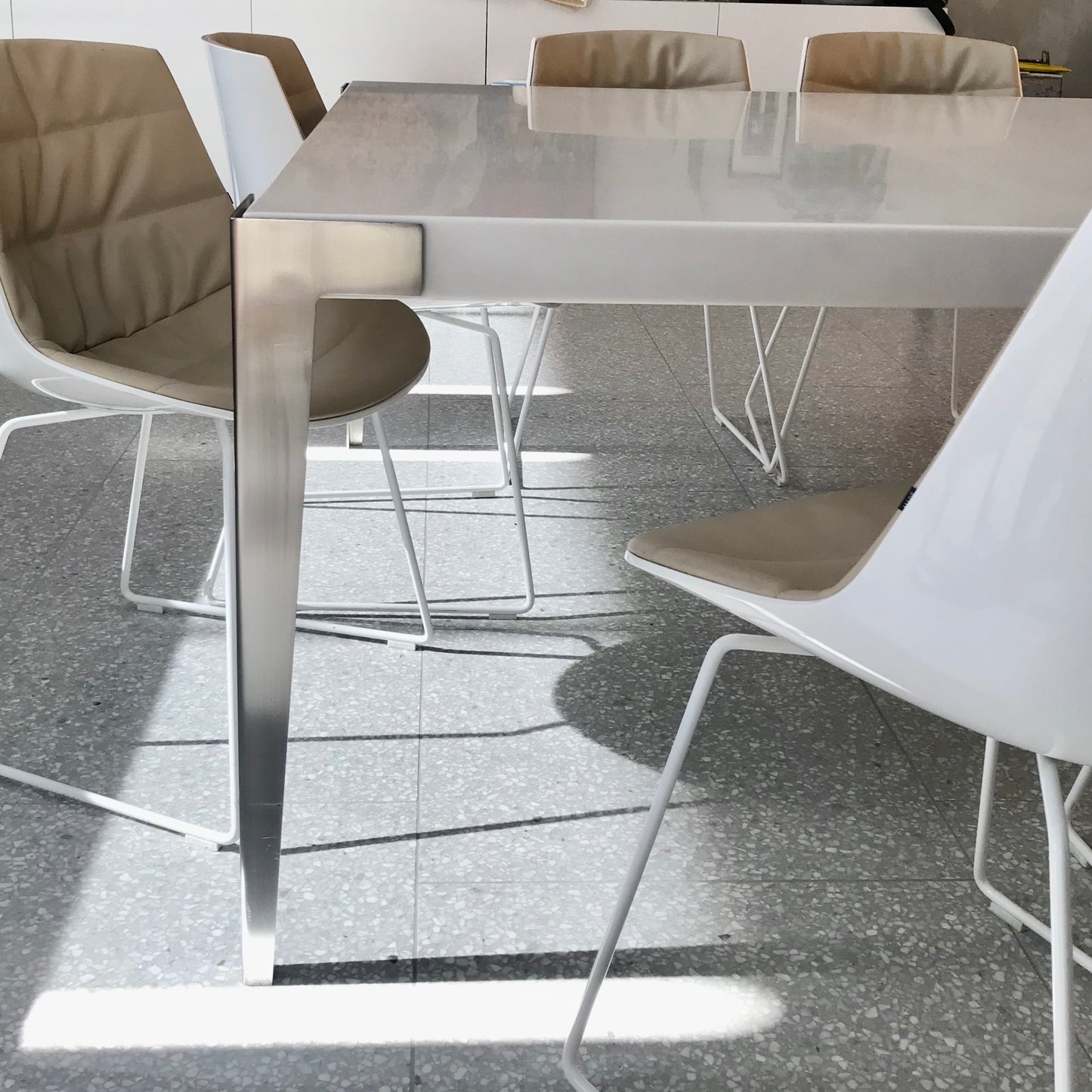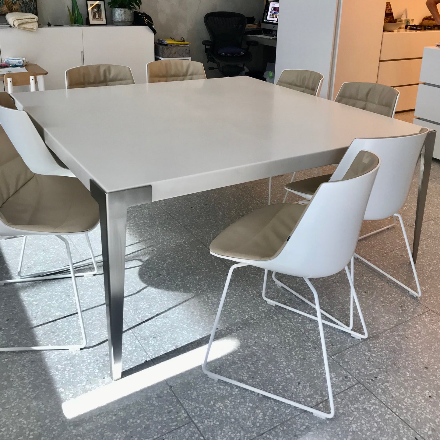 The dining table we have on offer has a white corian top with brushed stainless stell legs. Seats eight.