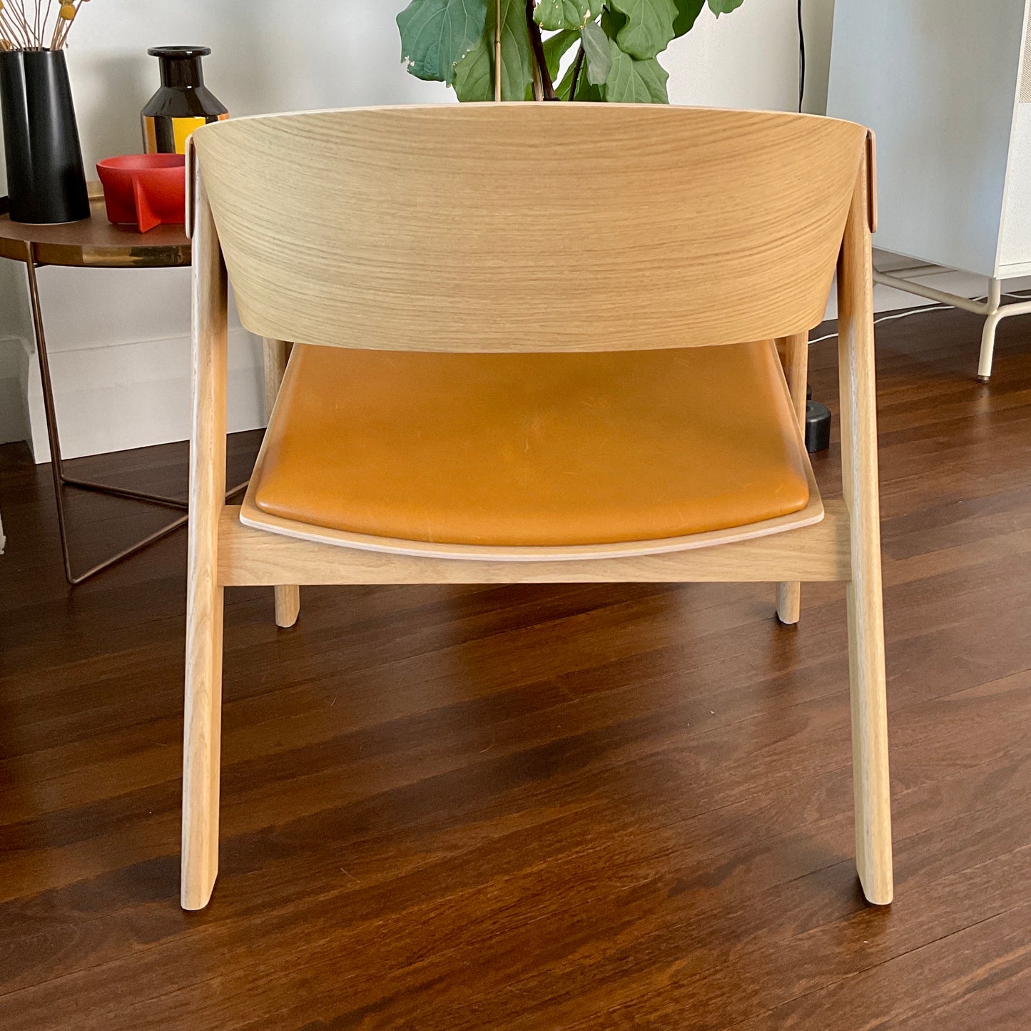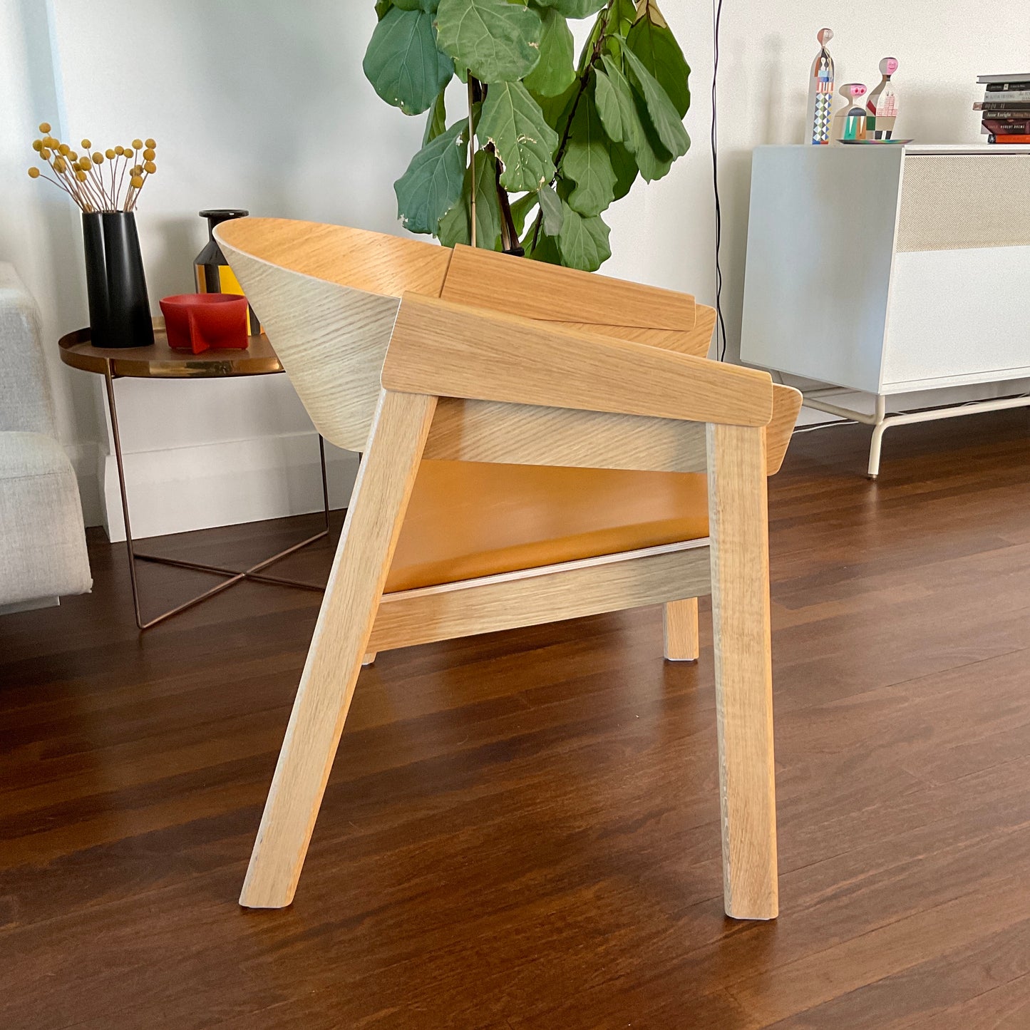 By combining the ideals of Scandinavian craftsmanship with a modern design language, the Cover Lounge Chair has a simple yet refined expression. The design features a grand seat while taking up little space in the room, complemented by its unique details of curved back, wooden armrest covers and slightly curved seat for any private or professional space. The chair we have on offer is in natural oak with leather cognac seat.