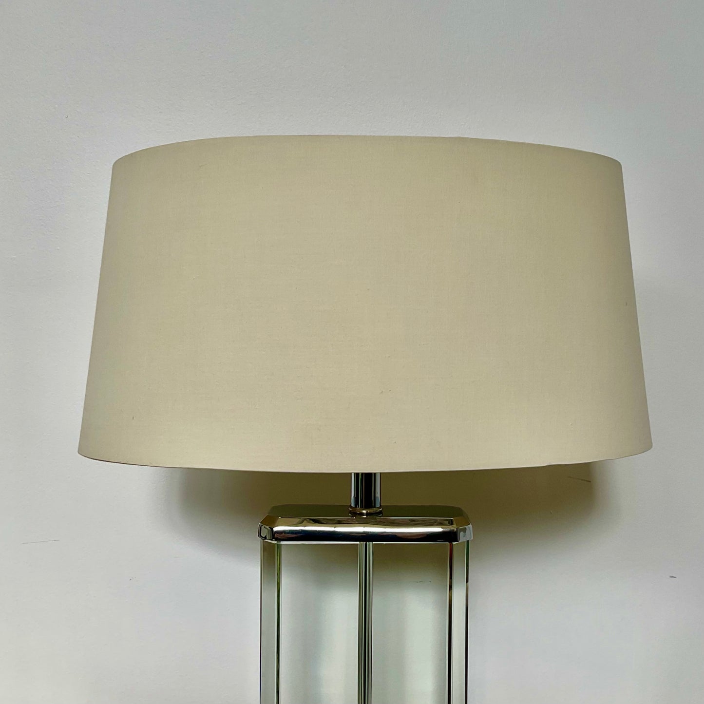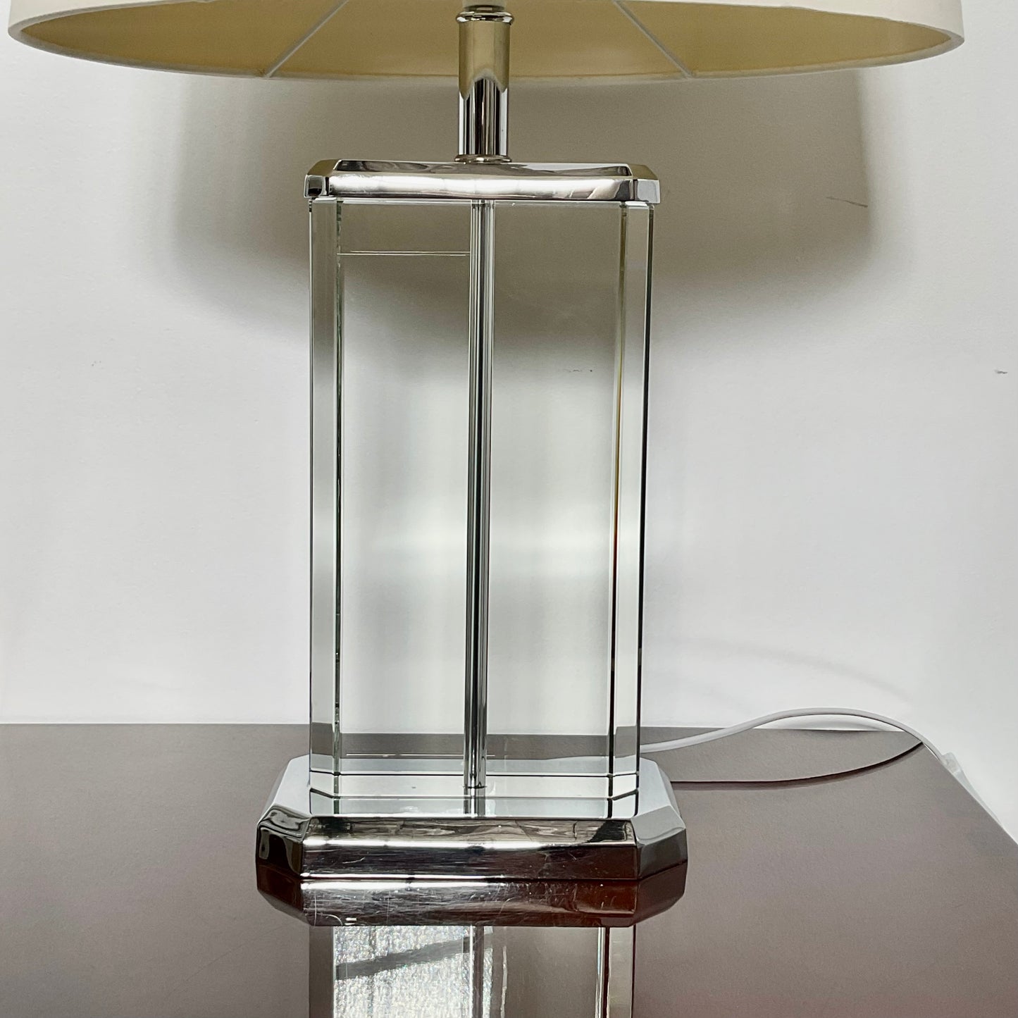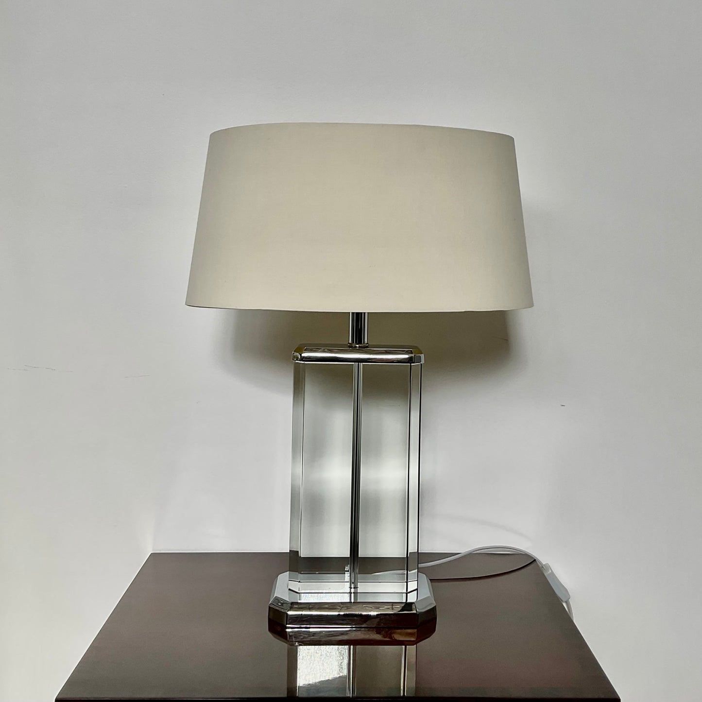 The lamp we have on offer has a crystal base with polished metal trim. The shade is oval in shape in silk.