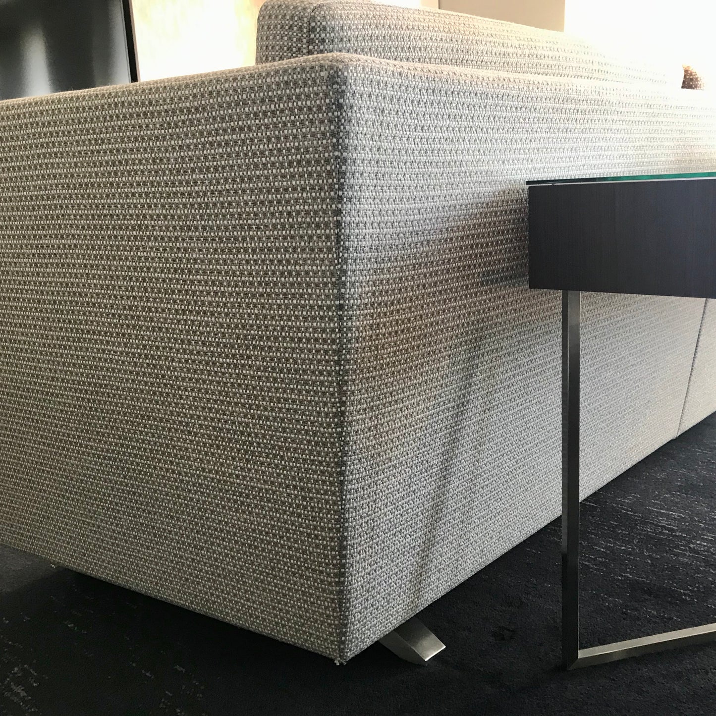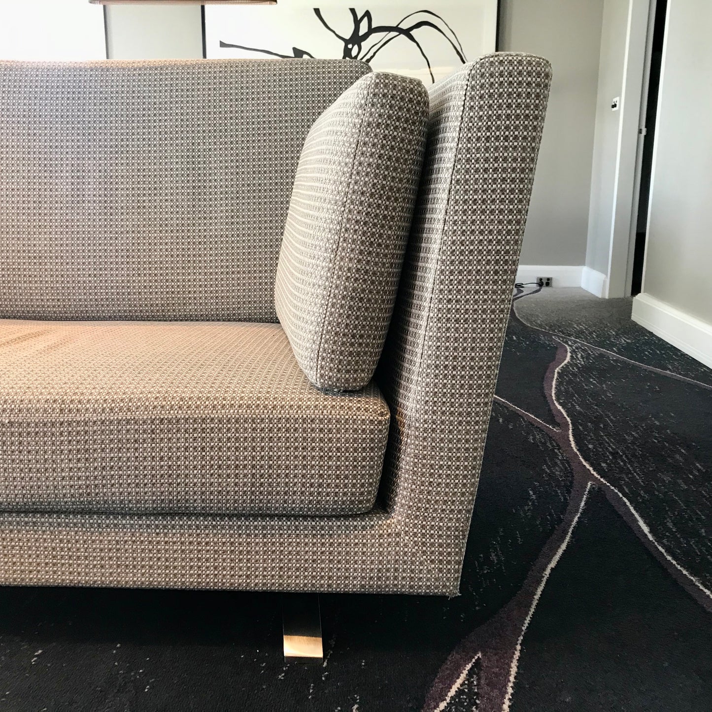 This custom made sofa is in 2 pieces. The sofa is upholstered in a Mokum Esplanade fabric colour Driftwood.
