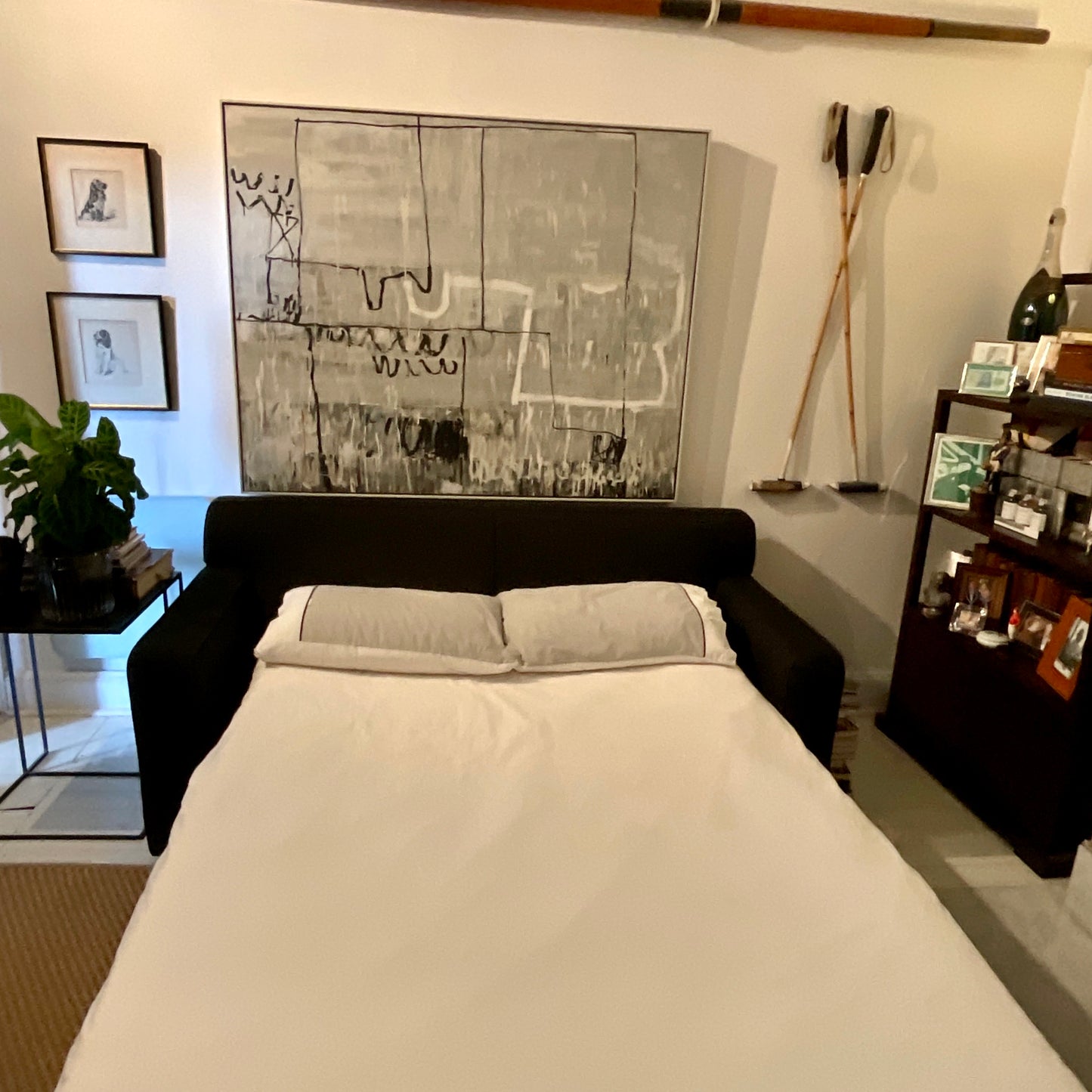 Good quality sofas are hard to come by. This custom made sleeper sofa is perfect for home office / guest room. the sofa has a hardwood frame with a pullout sleeper mattress. The sofa is fully upholstered with two loose seat cushions that are reversible. The cushions are foam with a dacron wrap. The sofa we have on offer is upholstered in a charcoal grey fabric.