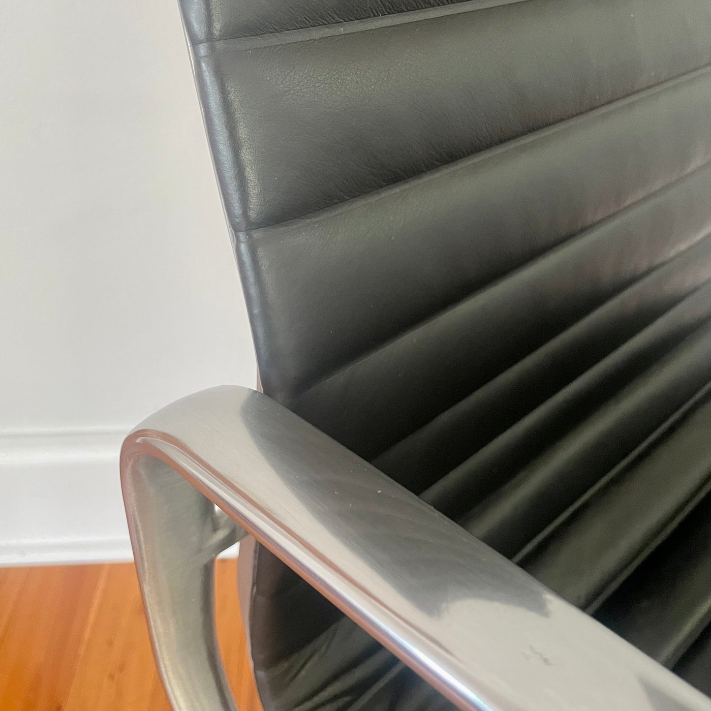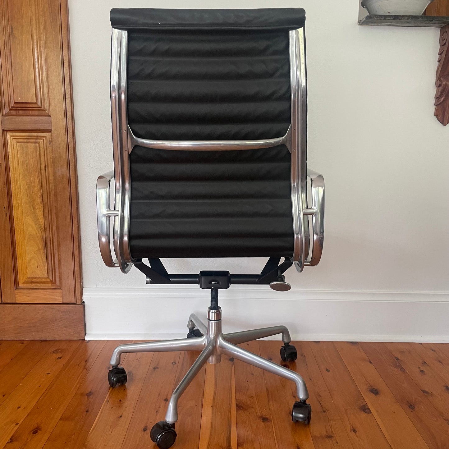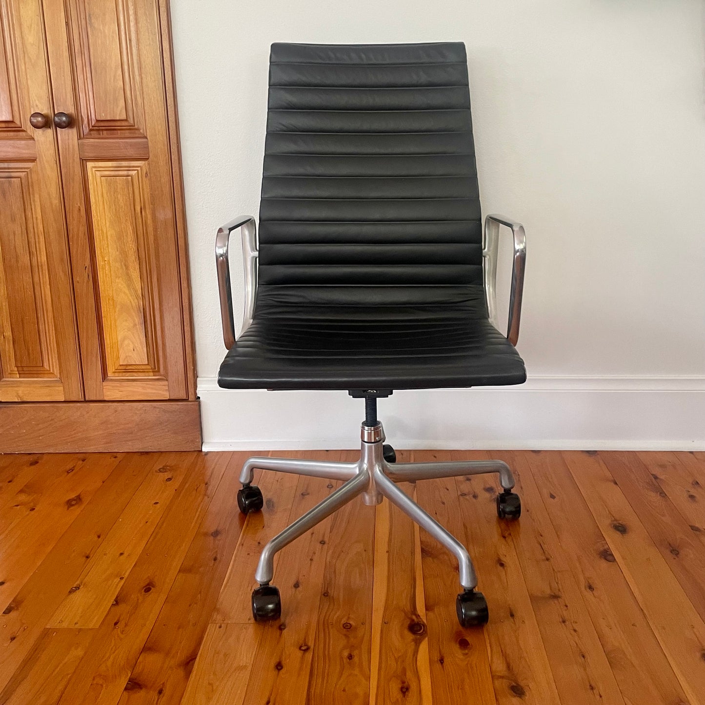 The lithe chairs of the Aluminium Group have been a popular design since there introduction in 1958. And no wonder. The executive chair we have on offer has a high back in ribbed black leather with manual height adjustment.