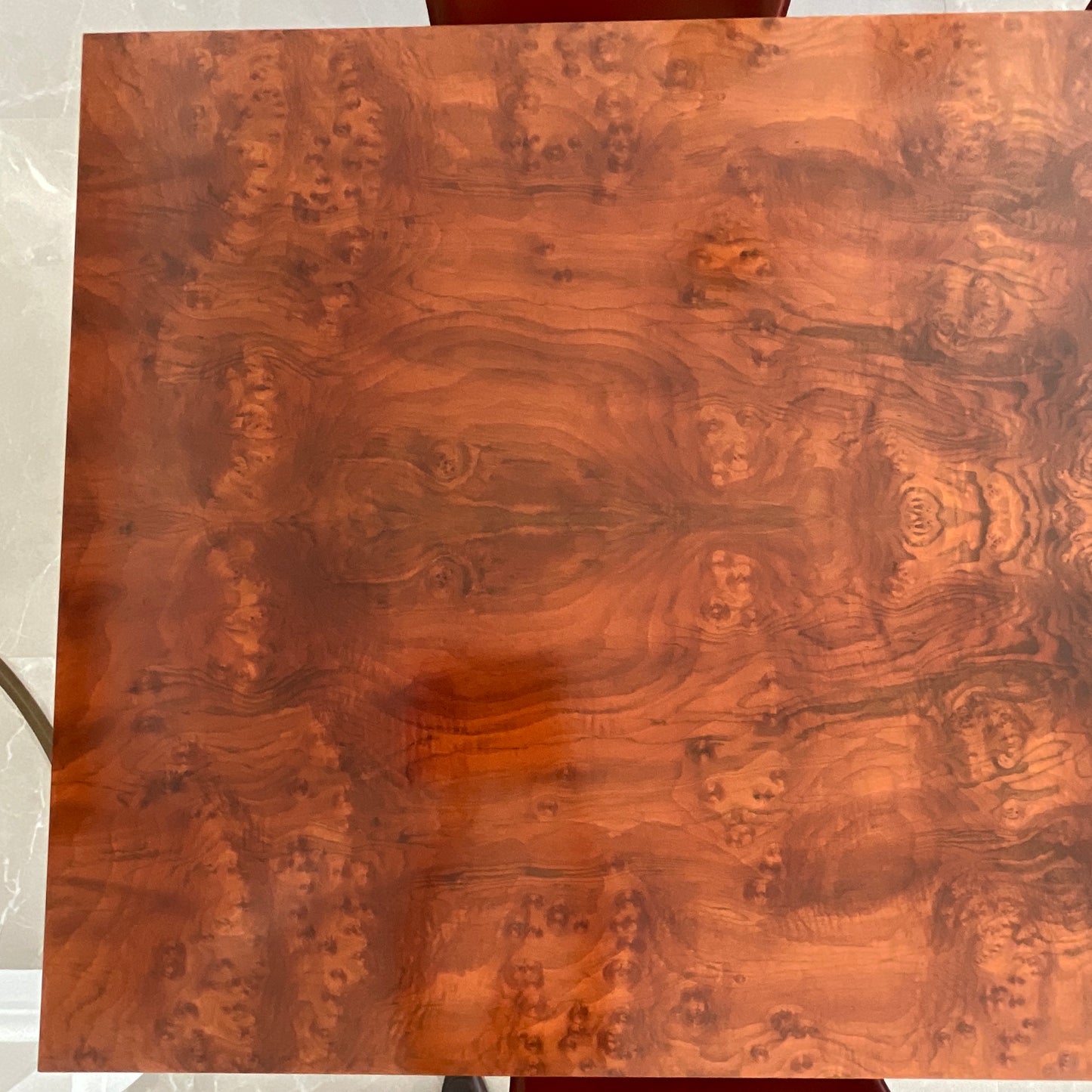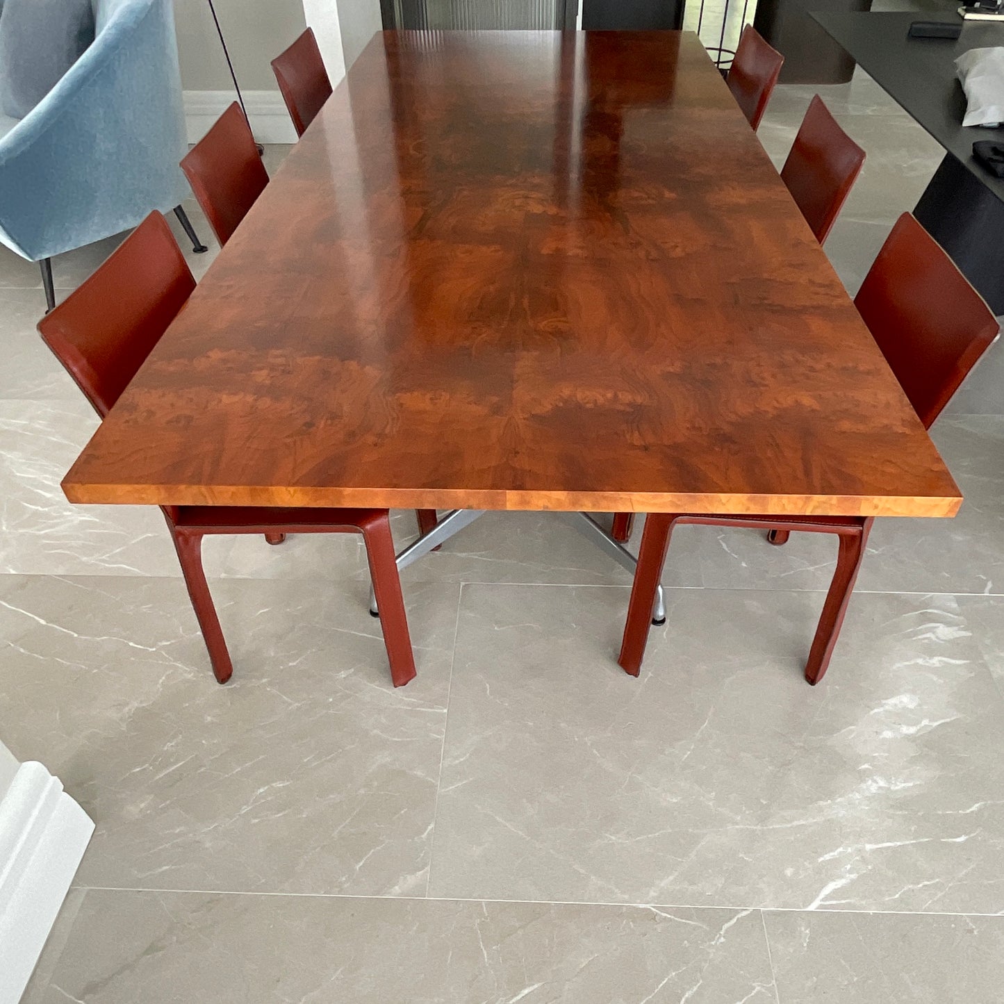 This stunning table we have on offer has an original Eames segmented base with a magnificent custom top in a rare Circassian Walnut Burr and solid walnut edge.