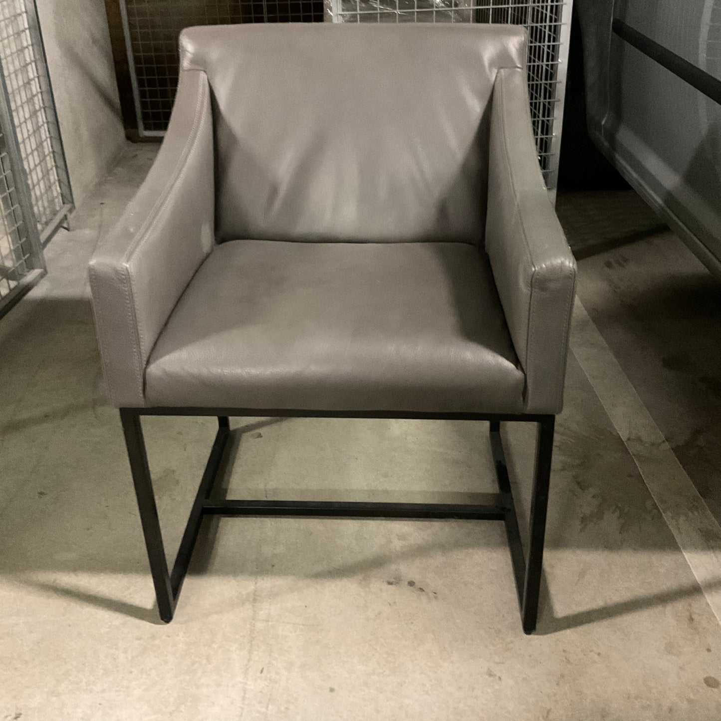 A tubular steel base gives our postmodern armchair a machine-age reference. Its slender legs support the impeccably upholstered seat and back for a crisp and geometric silhouette. Plush foam cushions provide the perfect combination of comfort and enduring support. The chair we have on offer has Italian Turin leather in Pewter, with bronze legs.