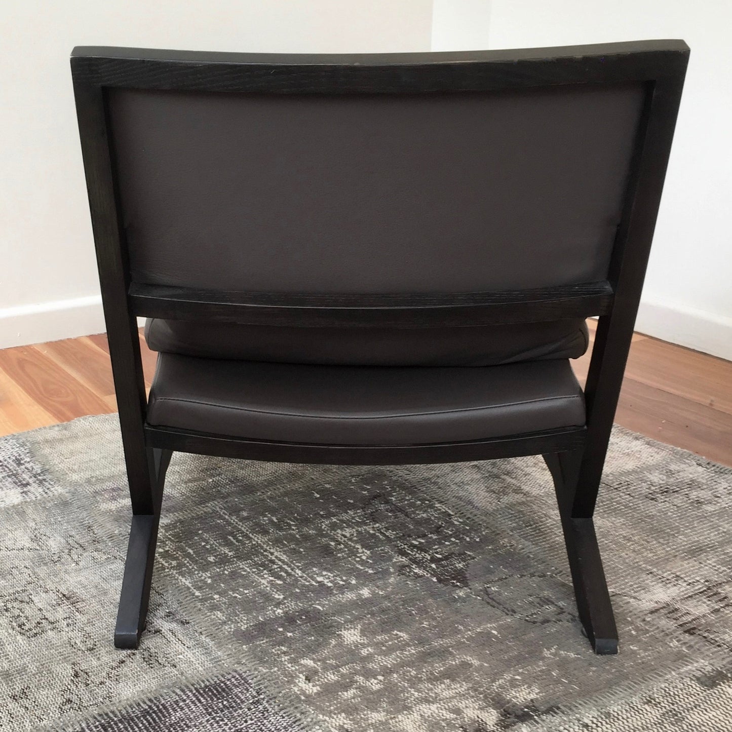Solid ash wood frame with plywood reinforcement, available in grey oak finish. Cushion filled with feather down. Legs come with Teflon glides. The chairs we have on offer are in brown leather.