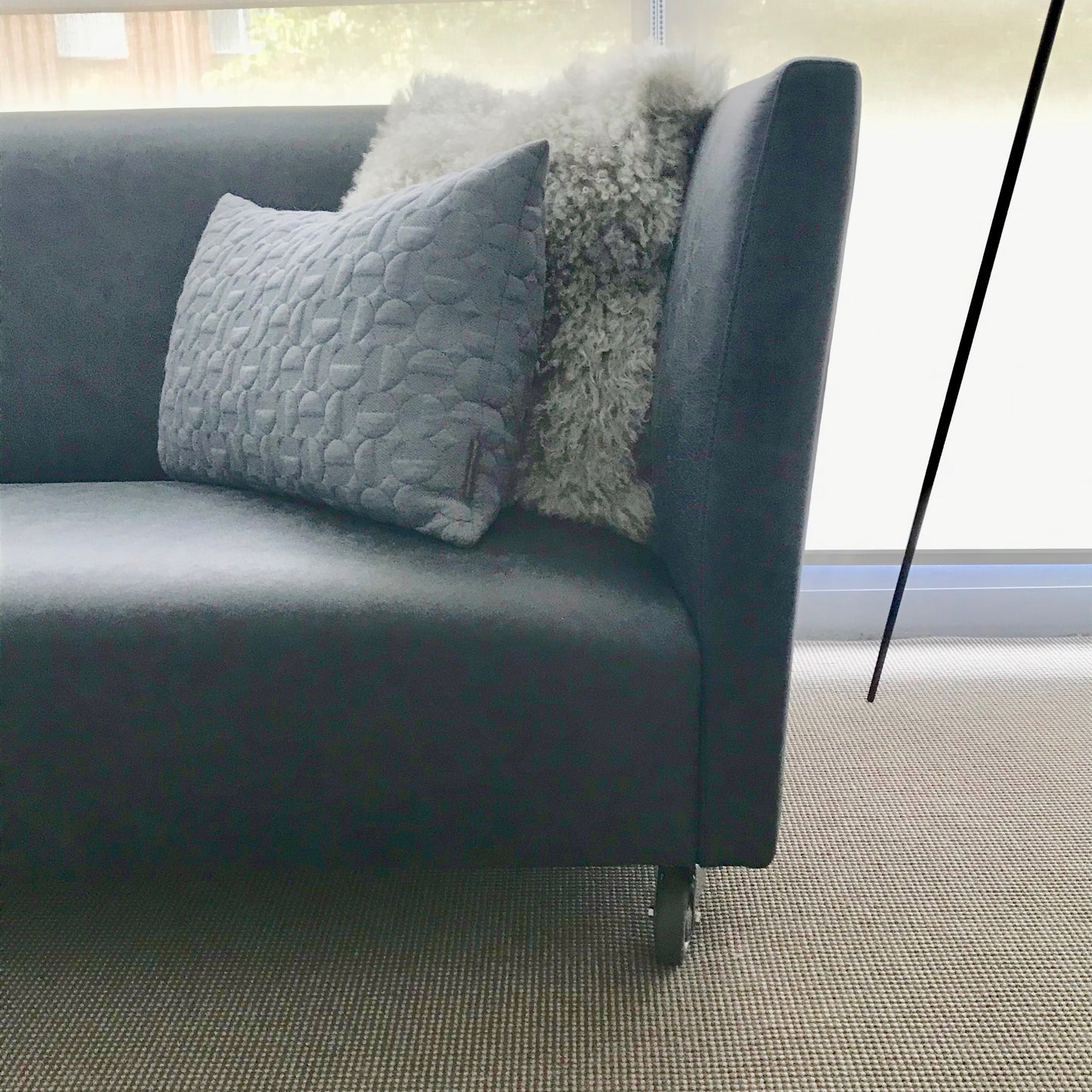 The Filiberto Sofa by Antonio Citterio for Flexform is no longer in production. The decorative sofas Filiberto are equipped with two lockable wheels in the front foot area. The rear legs are stained cherry wood. The sofa has been upholstered in a deep blue leather.