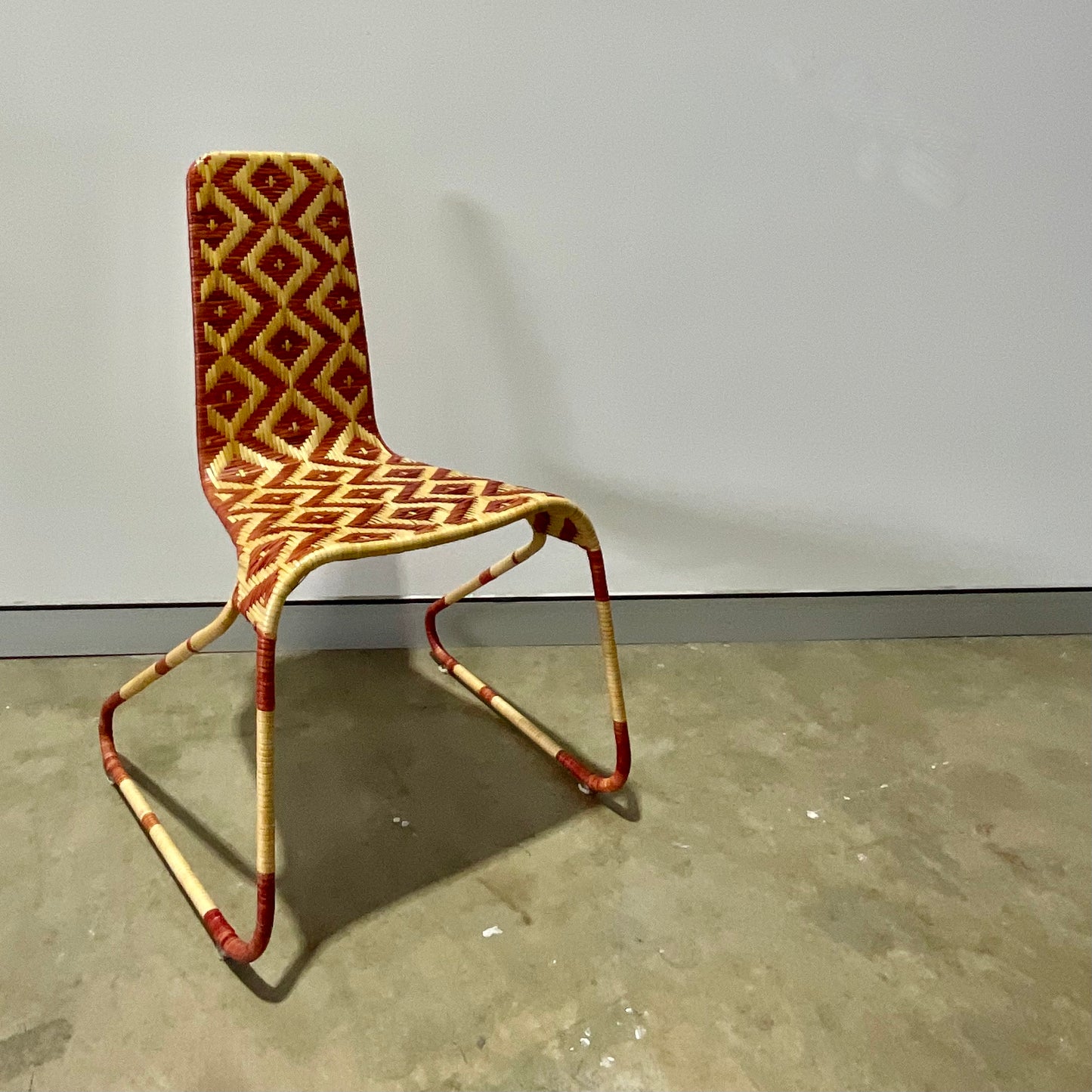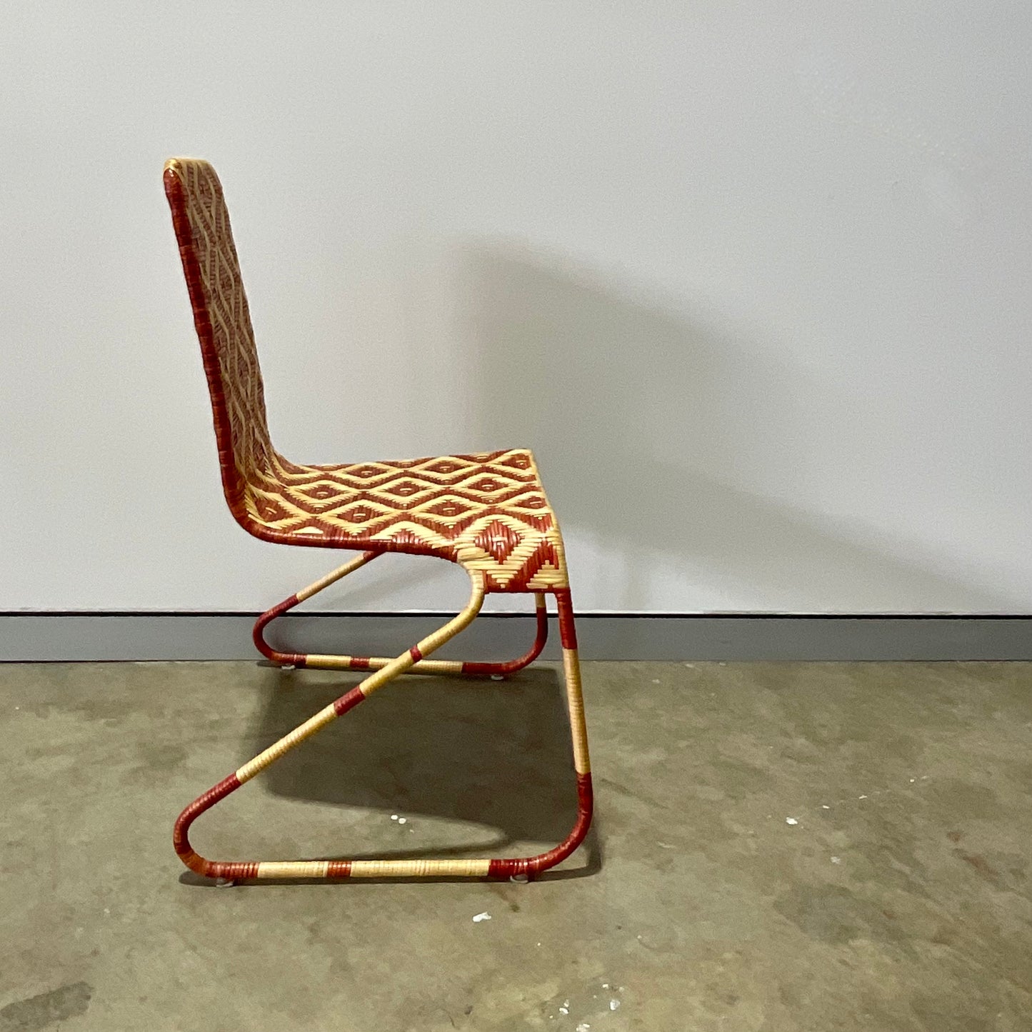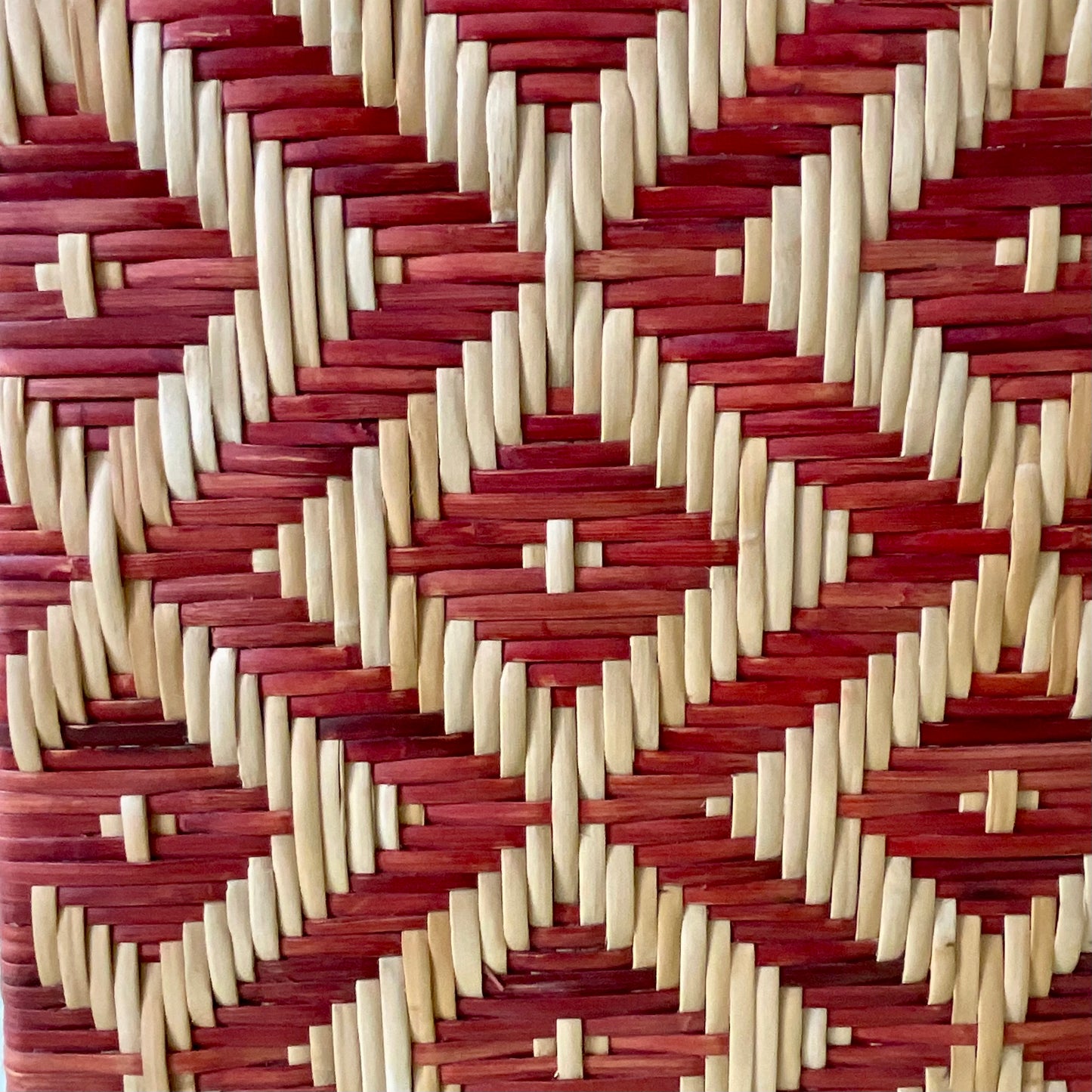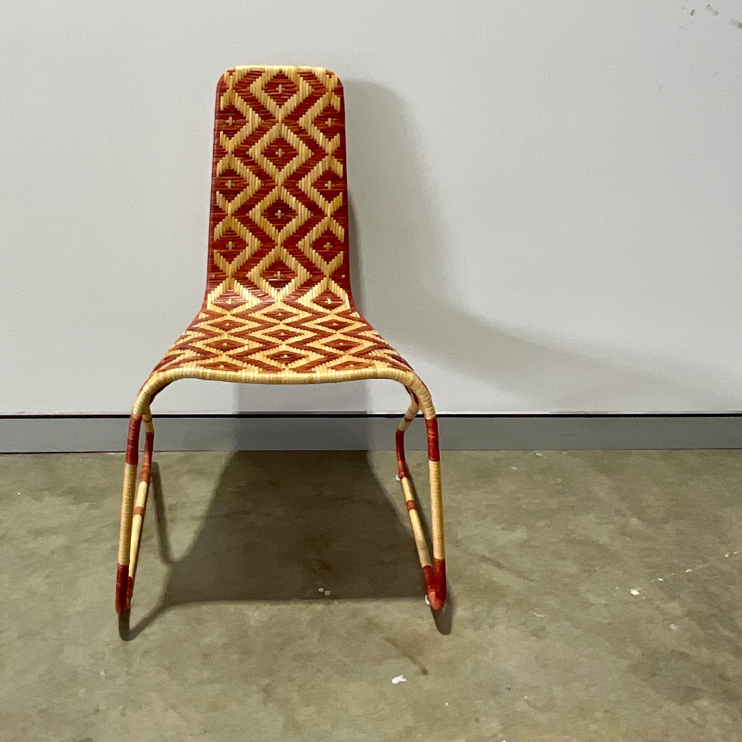 Stool with painted steel structure covered of wicker with a lozenge pattern in whiter and red or brown colour versions. Indoor use only.