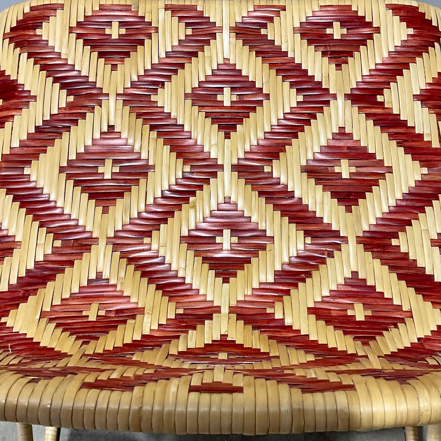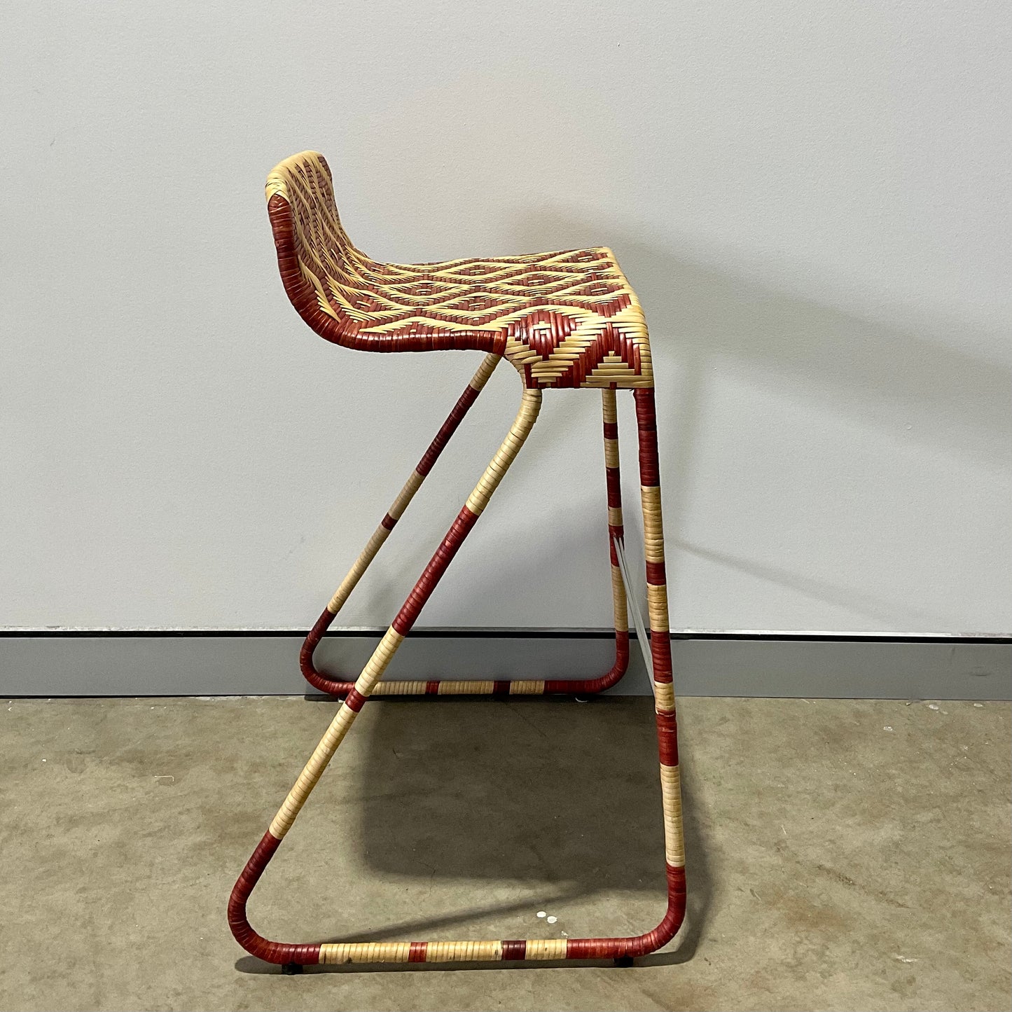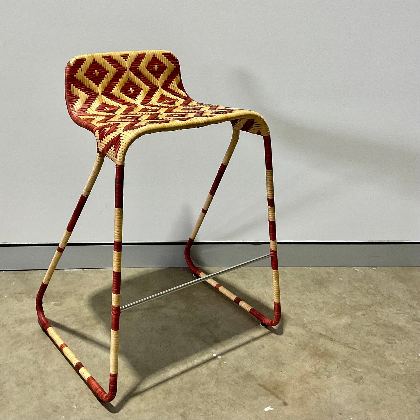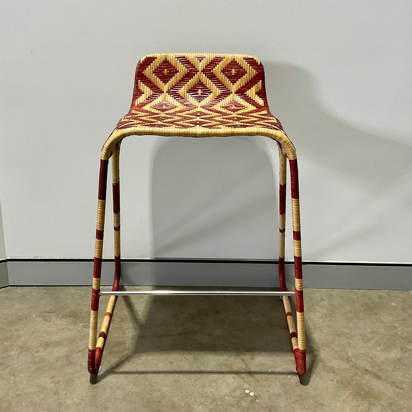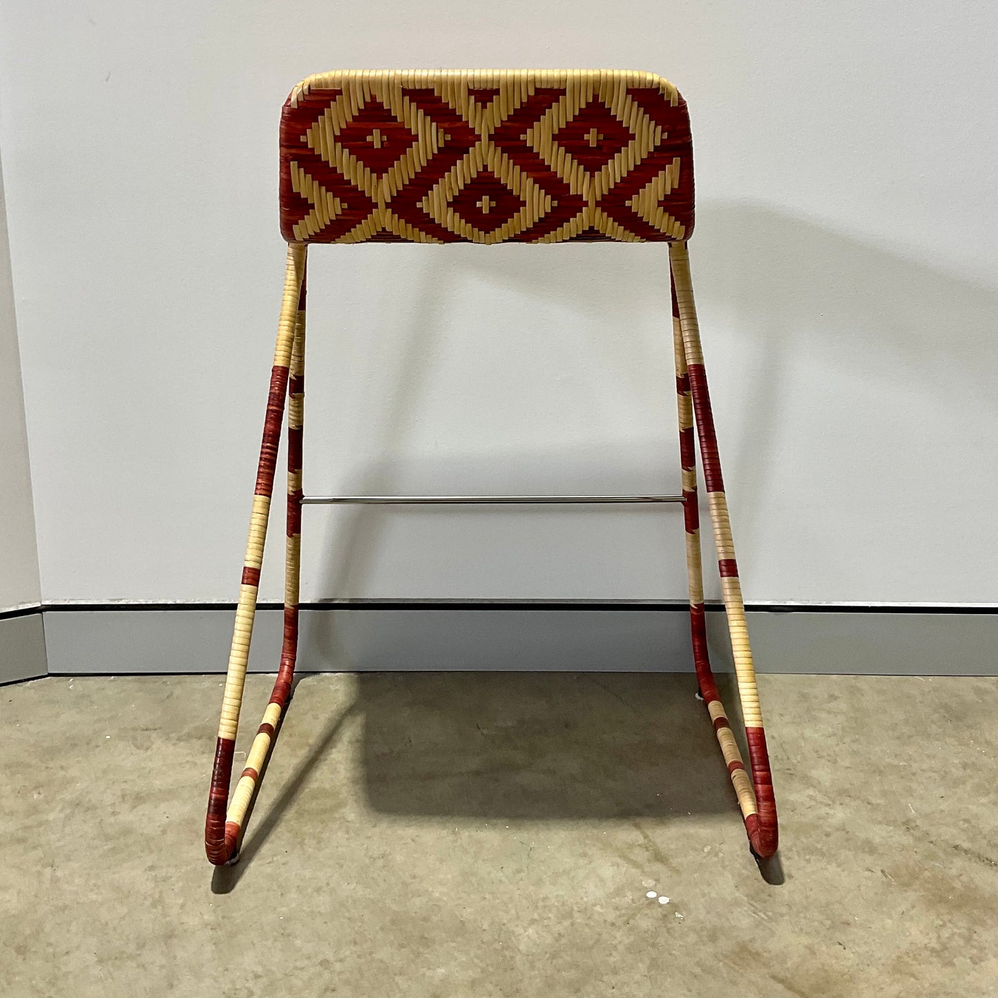 Stool with painted steel structure covered of wicker with a lozenge pattern in whiter and red or brown colour versions. Indoor use only.