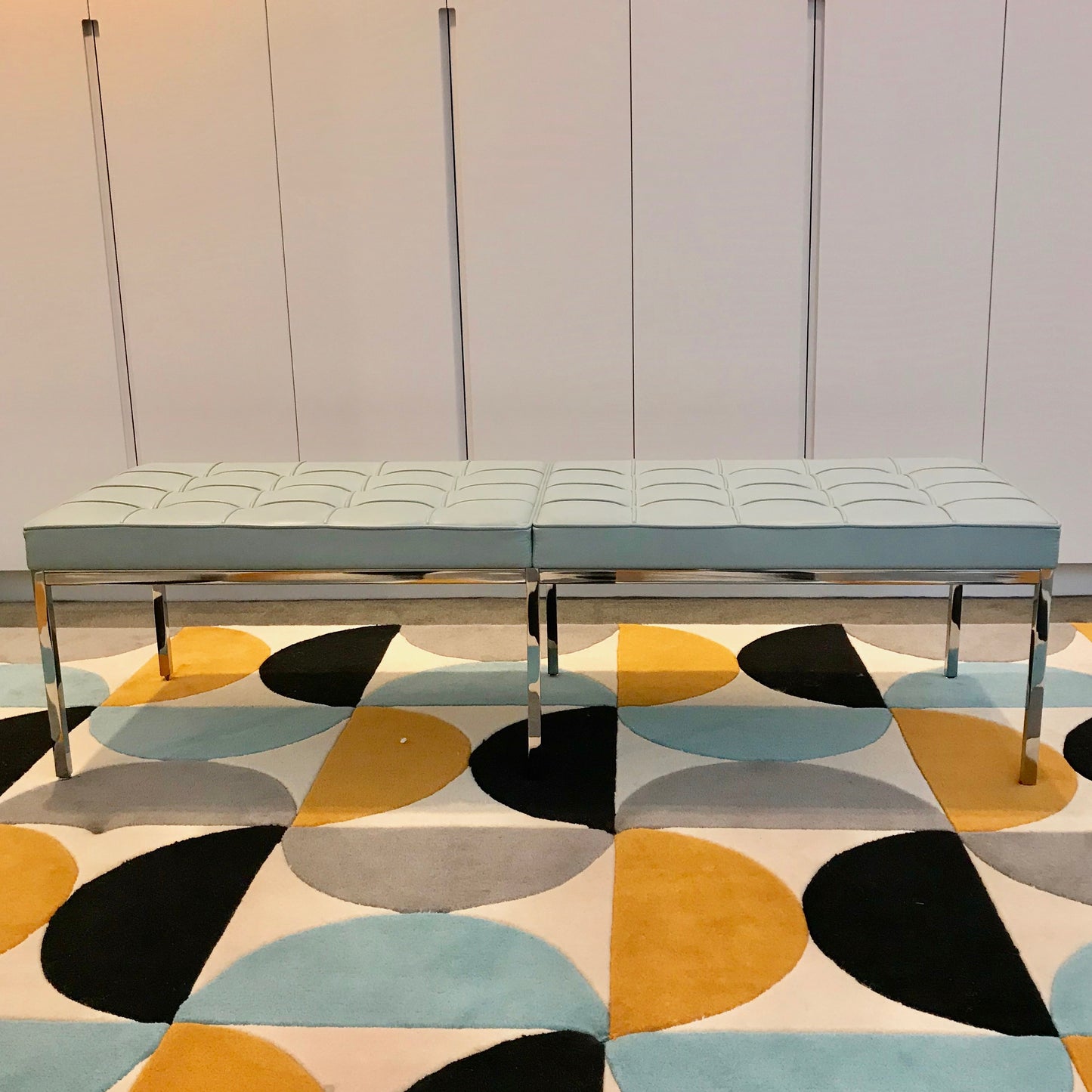 The bench has a metal frame and legs in heavy gauge square-section steel, finished in polished chrome. Seat cushions in multi-density foam core may be upholstered in fabric or leather. The bench we have on offer is upholstered in pale blue leather.