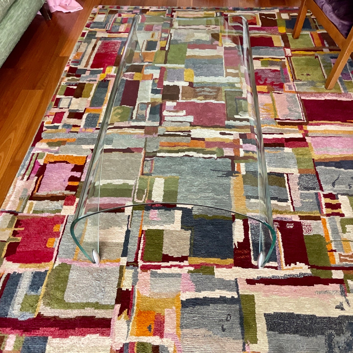 Modernist vintage coffee table or sofa table from glass waterfall like named Genio designed by Massimo Iosa Ghini, Italy, 20th century. Through the clear curved waterfall shape the coffee table appears lightweight and floating. Only through the supported metal feet it makes feel, that the table is grounded. Very beautiful design by the famed designer Massimo Iosa Ghini, who is also a member of the Avant Garde design movement Memphis Group by Ettore Sottsass and is responsible for many installations from chains of stores and hotels.