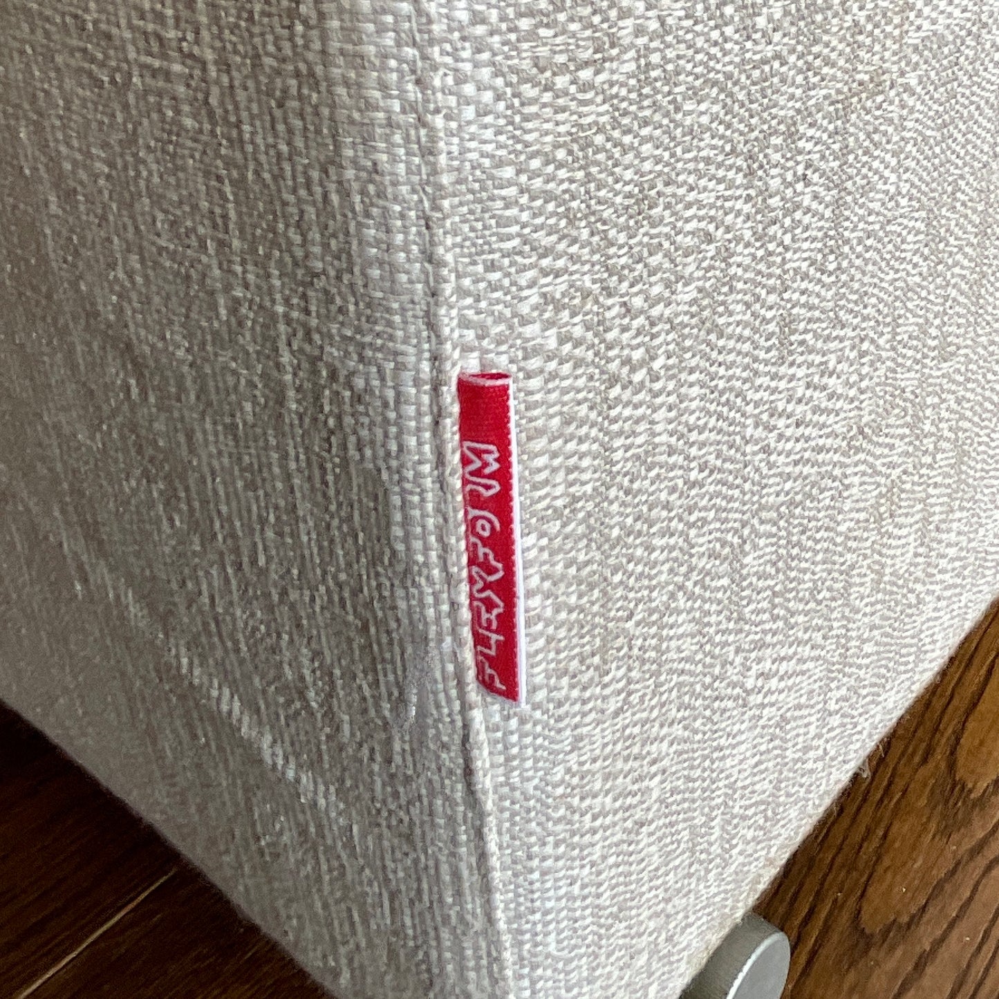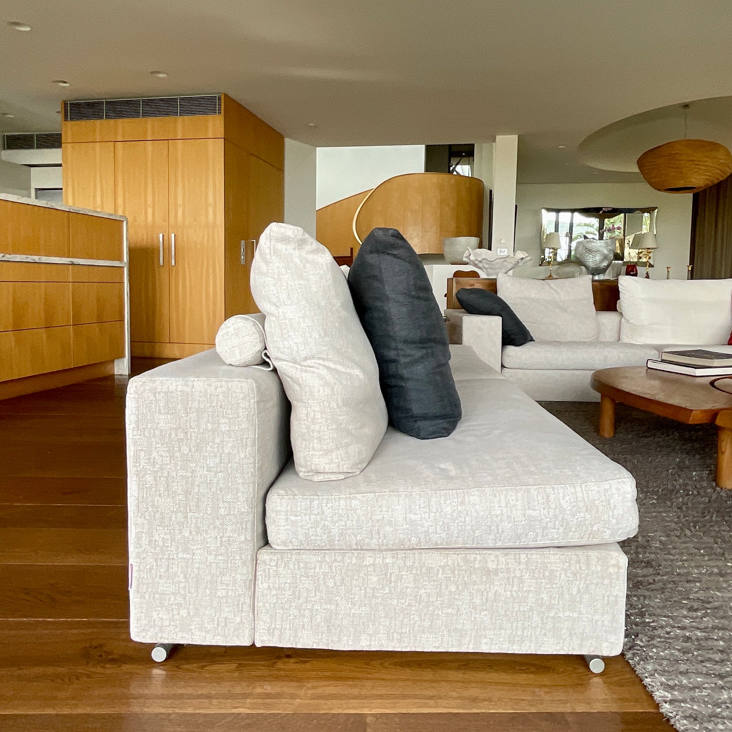 The sofa we have on offer is in a neutral taupe textured fabric with two black linen cushions included. There is also a arm piece (not shown) included in the price.