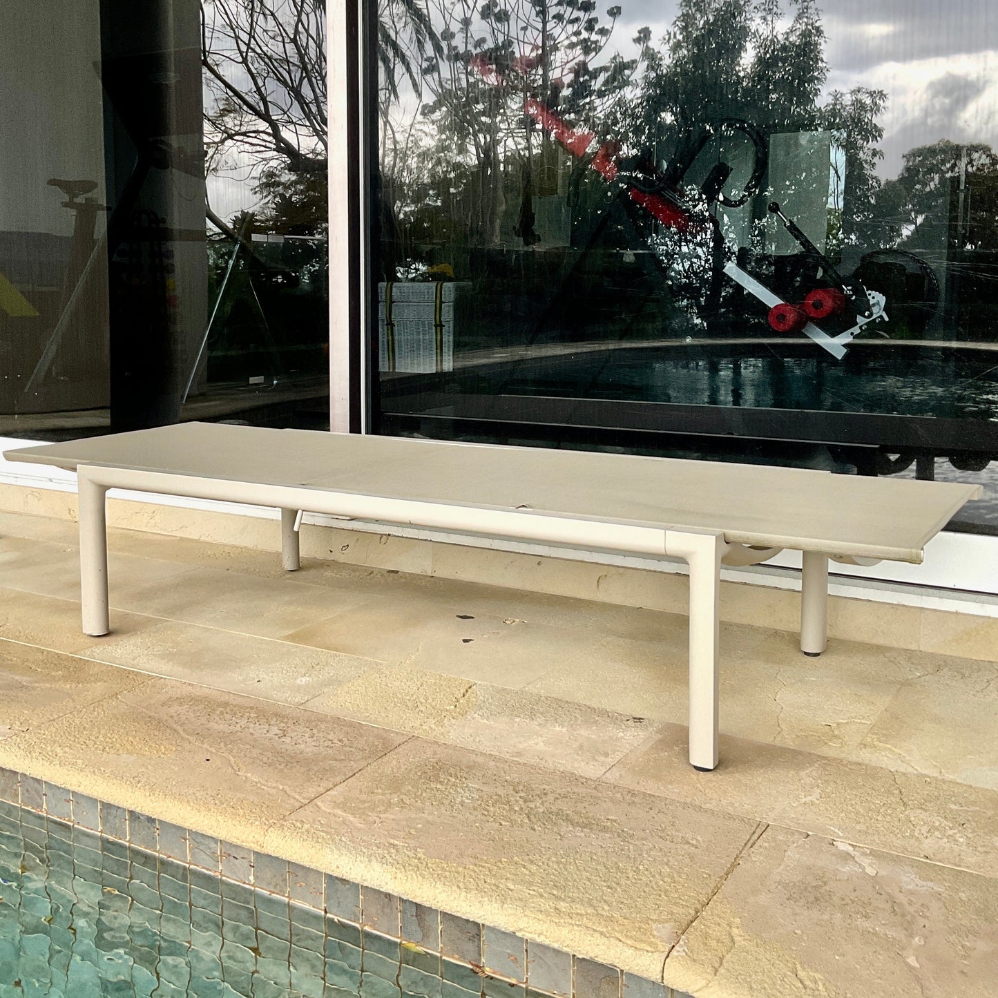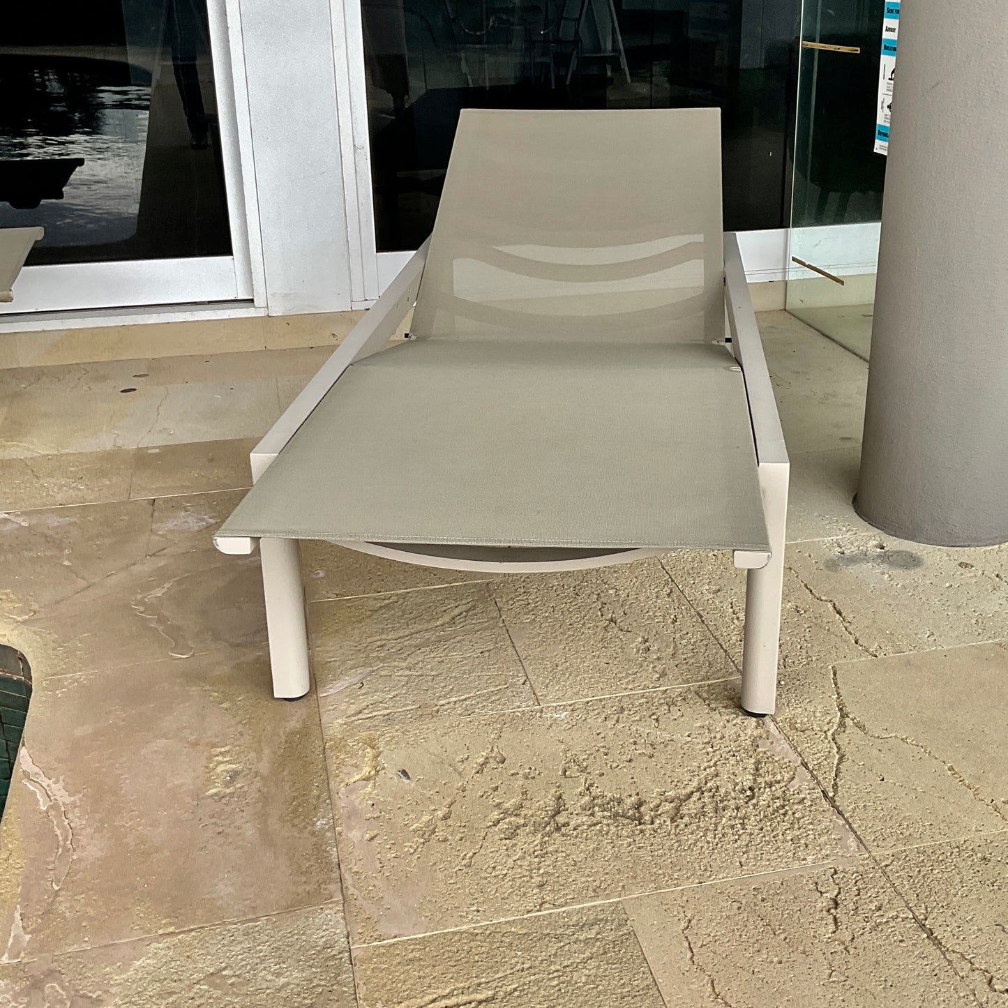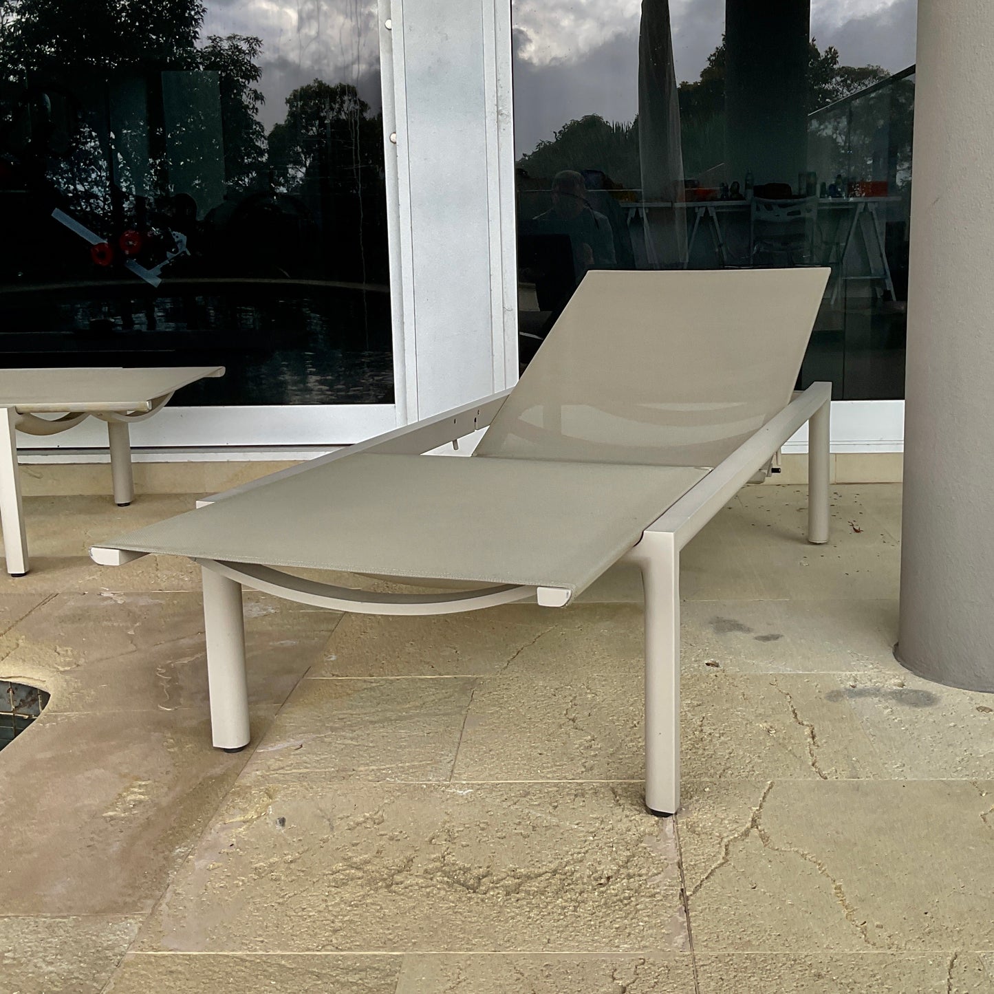Functionality is key for Illum without compromising style and most importantly, comfort. The lounger is provided with a knee bend section and can easily be put in any position by means of a patented pump system. Materials: Powder coated aluminium with batyline seat. The sun lounge we have on offer is in colour linen.