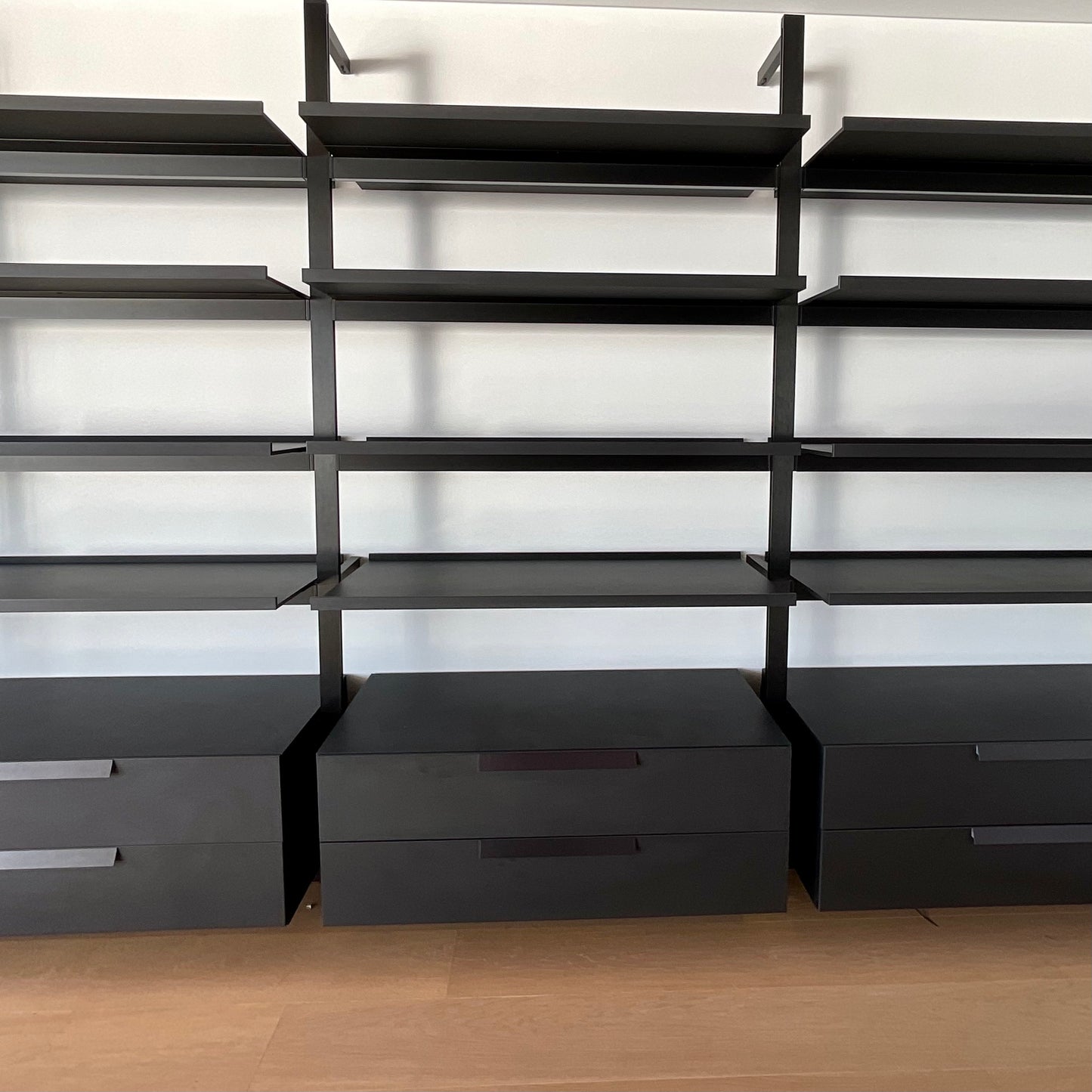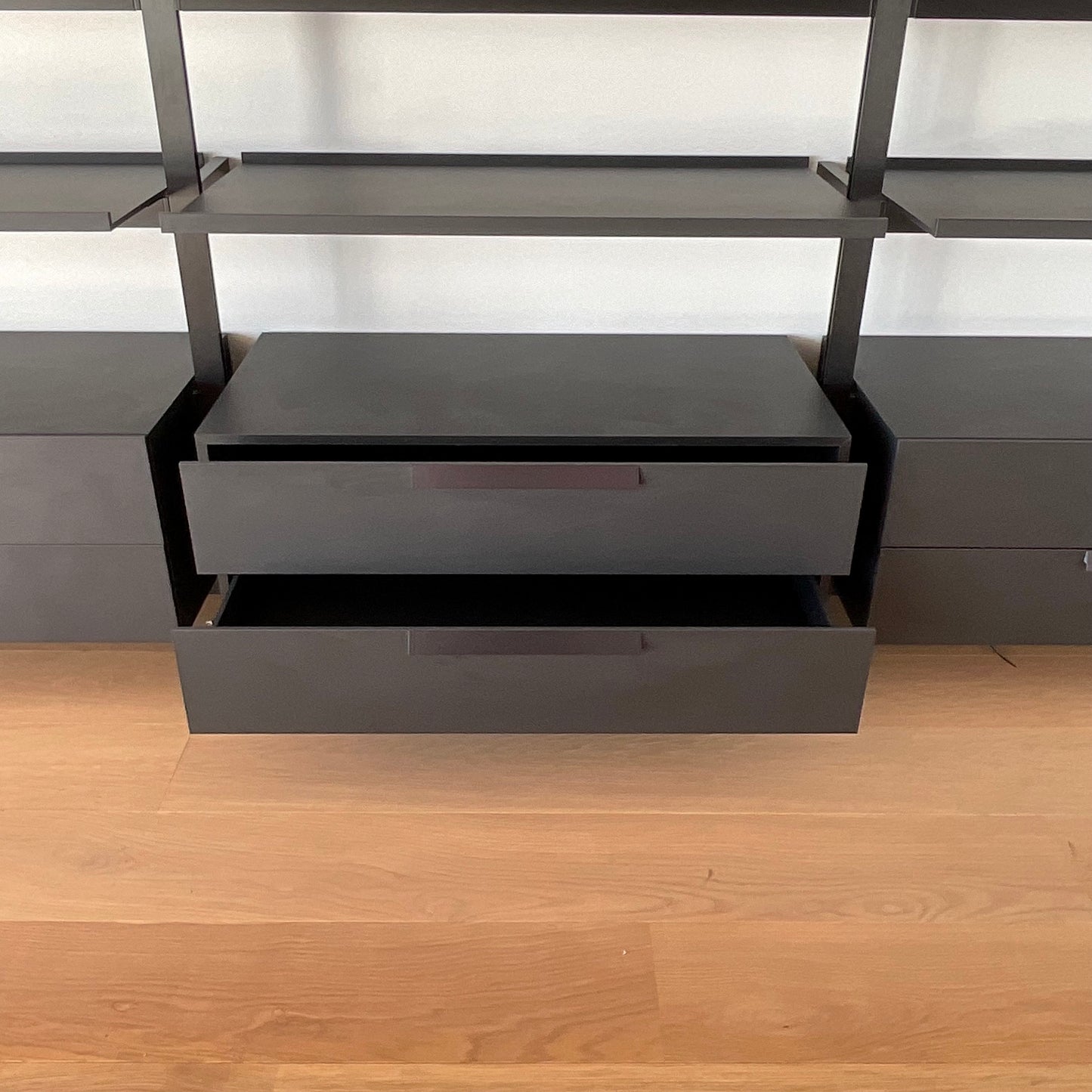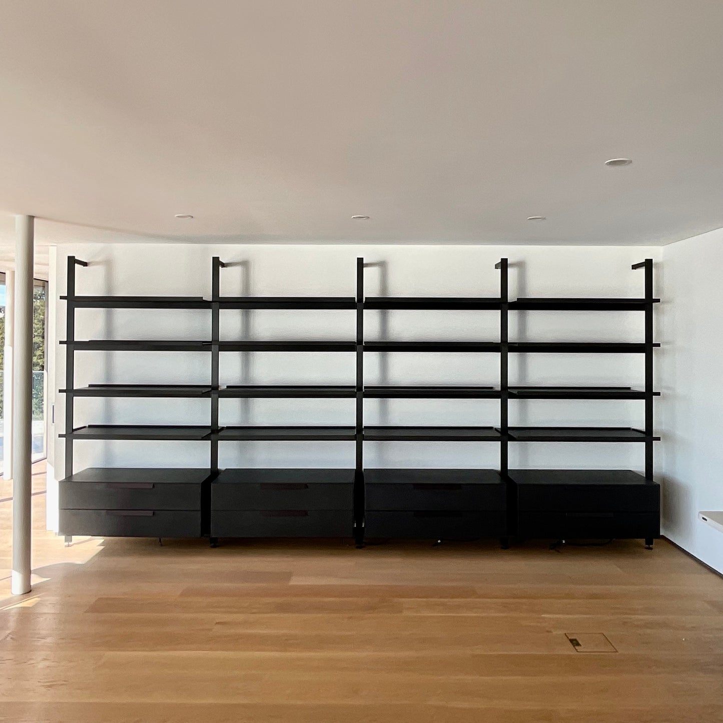 Classic yet contemporary, essential yet extremely flexible, the Jack wall system is offered in two versions: with vertical floor to ceiling uprights, or with rods to be fixed to the wall. The modularity and discrete technical solutions underlying the project make it possible to create compositions for every room and furnishing context. The system features numerous elements which can be combined to increase the system’s functionality. These include new, deeper shelves, storage elements such as drawers, and flap doors. From an aesthetic point of view, all the elements of the Jack wall system are available in two colours, to which Canaletto walnut and four oak finishes are added as an option for the shelves and storage units. The storage unit we have on offer has four vertical section 1200 W on centre. Each unit has two drawers below and four shelves above. The finish is brushed black oak on the uprights and satin black on the shelves and drawers.