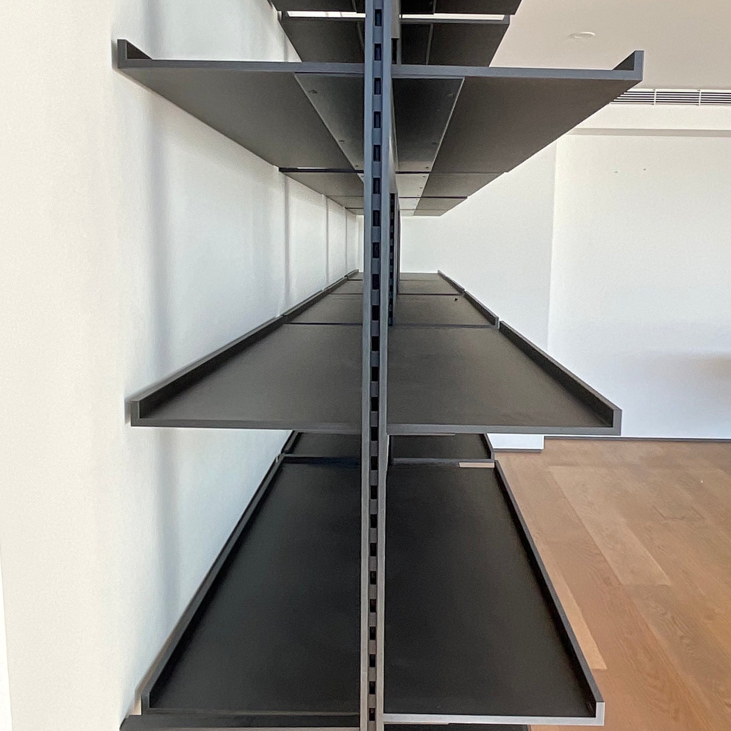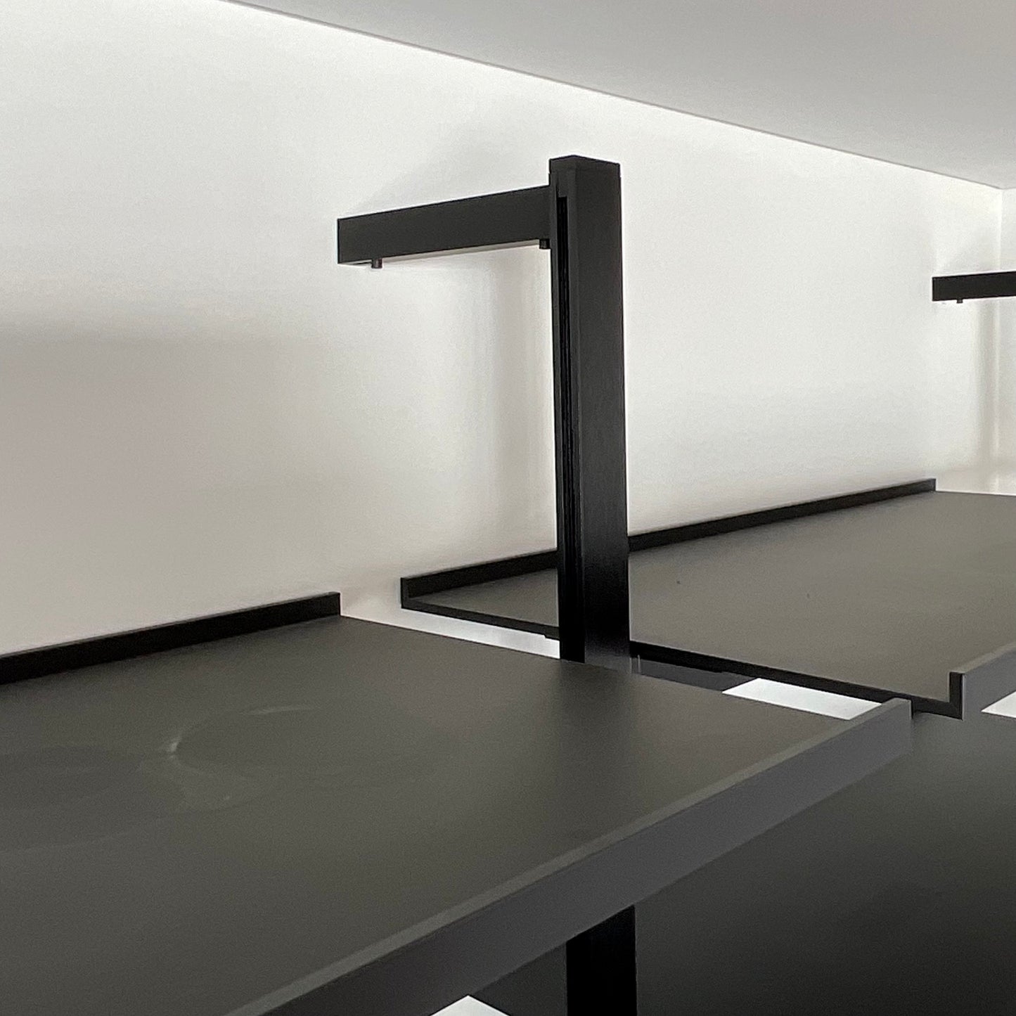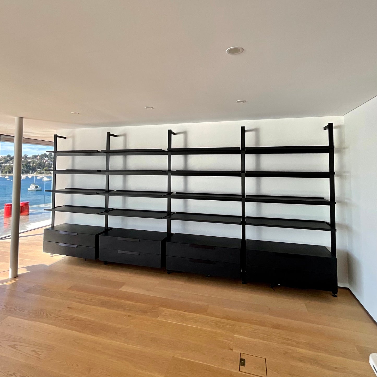 Classic yet contemporary, essential yet extremely flexible, the Jack wall system is offered in two versions: with vertical floor to ceiling uprights, or with rods to be fixed to the wall. The modularity and discrete technical solutions underlying the project make it possible to create compositions for every room and furnishing context. The system features numerous elements which can be combined to increase the system’s functionality. These include new, deeper shelves, storage elements such as drawers, and flap doors. From an aesthetic point of view, all the elements of the Jack wall system are available in two colours, to which Canaletto walnut and four oak finishes are added as an option for the shelves and storage units. The storage unit we have on offer has four vertical section 1200 W on centre. Each unit has two drawers below and four shelves above. The finish is brushed black oak on the uprights and satin black on the shelves and drawers.