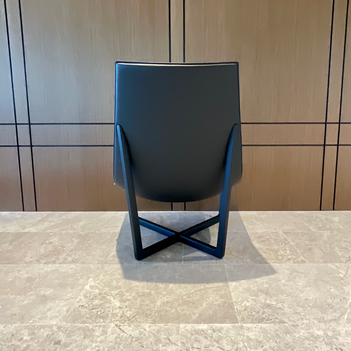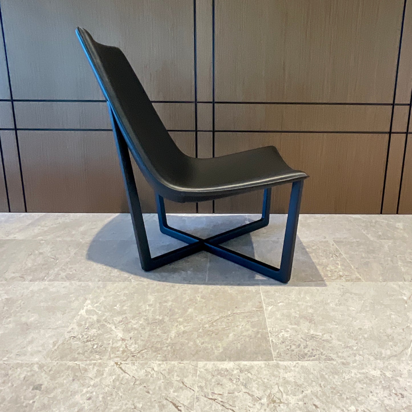 Harmonious lines and relaxed seating position distinguish the Jade lounge armchair, available in leather or eco-leather, which appears to be suspended on the new cross base in Canaletto walnut, supported at four points. Severe design and formal harmony together for a highly versatile piece, which can live in the environments of the home and in offices and luxury hotels, demonstrating how the company is increasingly moving across various territories. The chair we have on offer has a frame in black natural ash frame and upholstered in black leather.