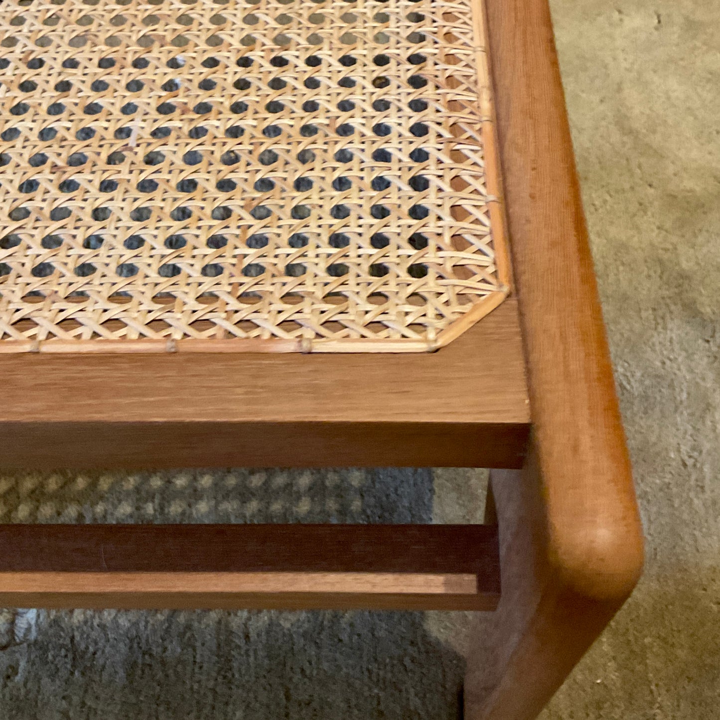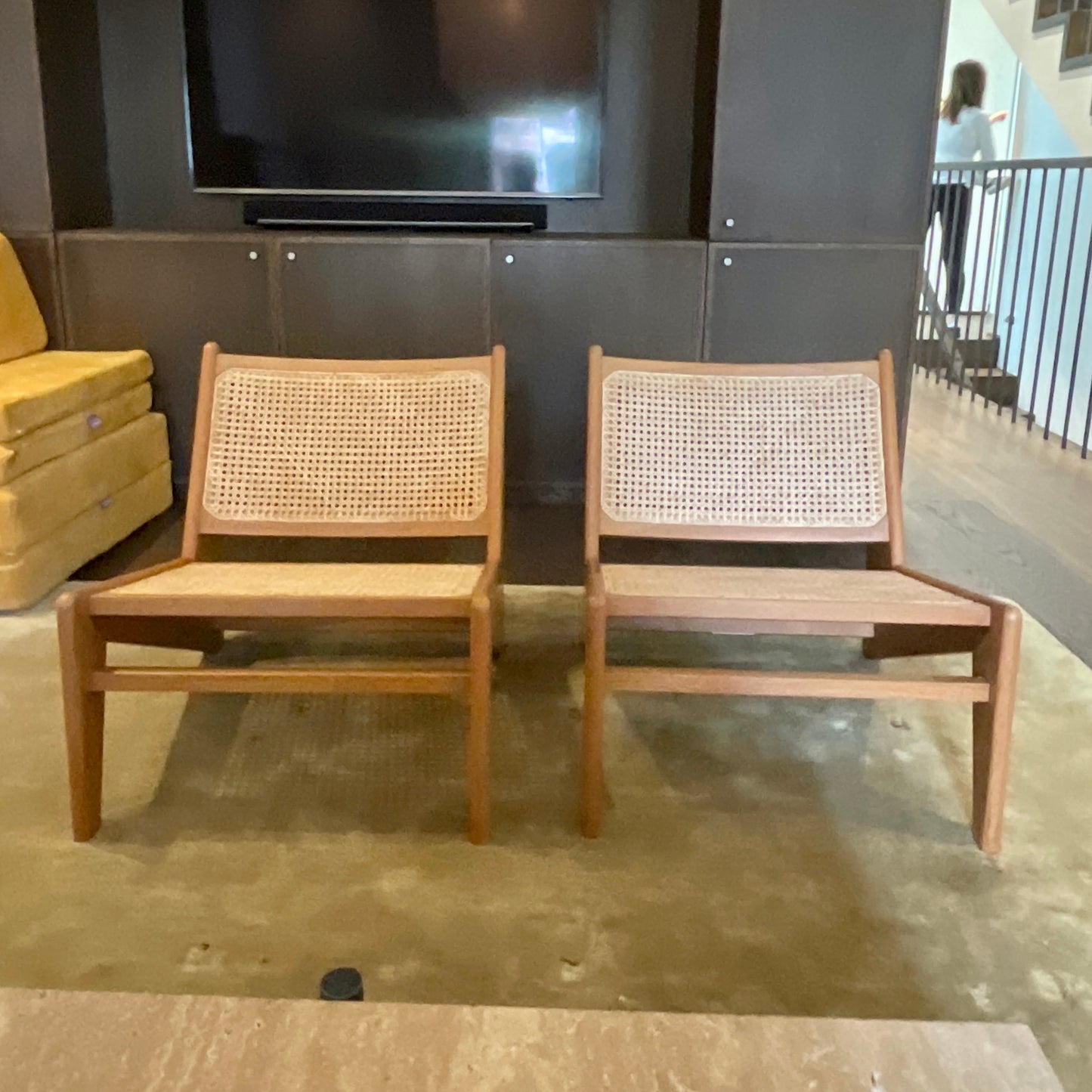 The Kangaroo Chair is a low chair comprising two parallel flowing Z shaped assemblies that form the leg and back frame. The back of the chair is gently bowed to provide seating comfort. Our re-edition of the Kangaroo Chair is true to the proportions and dimensions of the chairs made for Chandigarh, but reinforced with stronger joineries. The natural rattan cane is peeled and woven meticulously by hand. The chairs we have on offer are in teak with diamond weave cane.