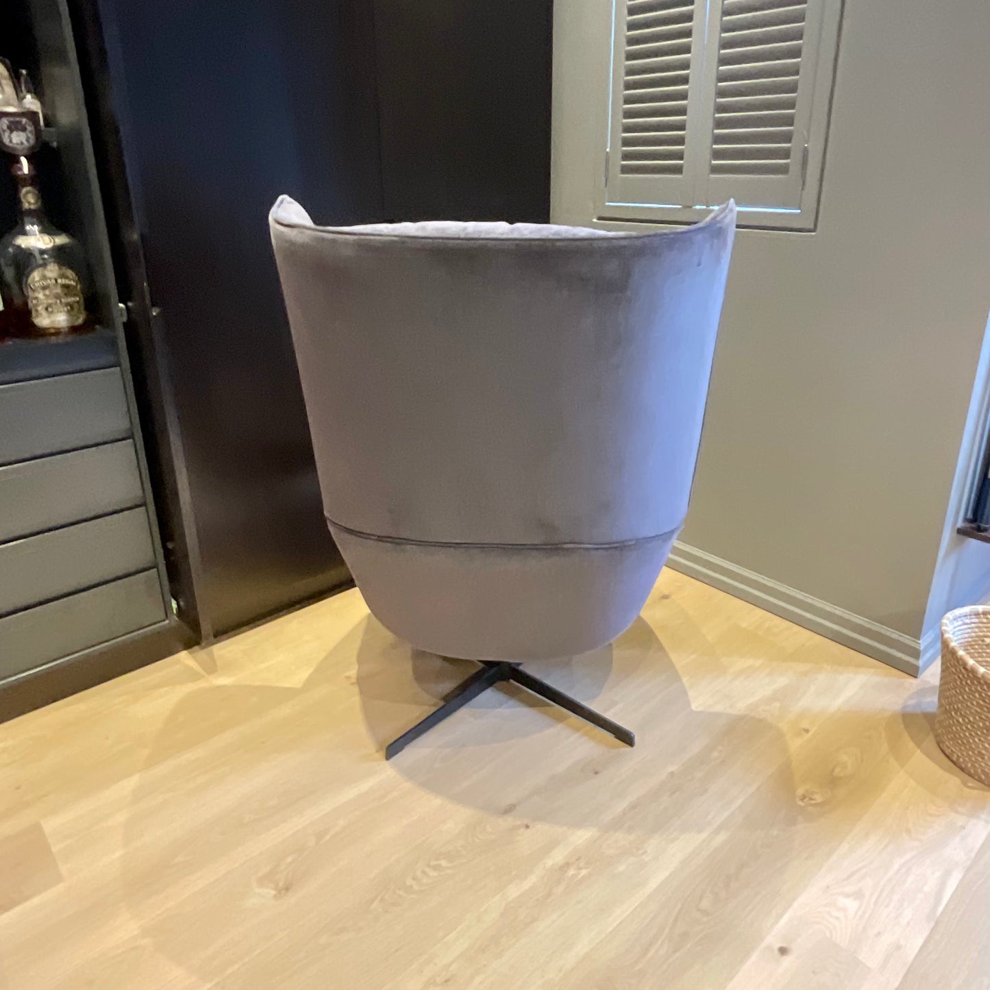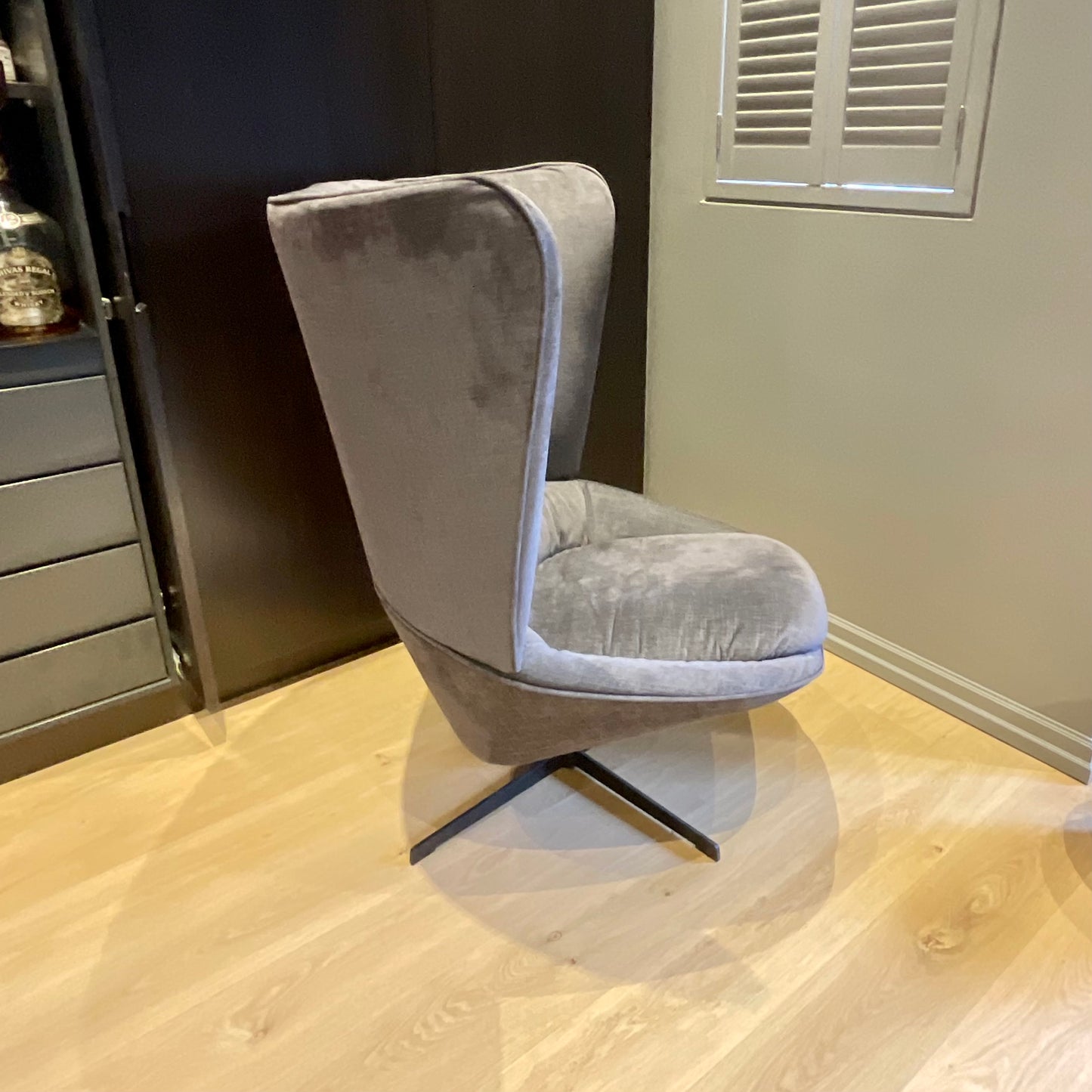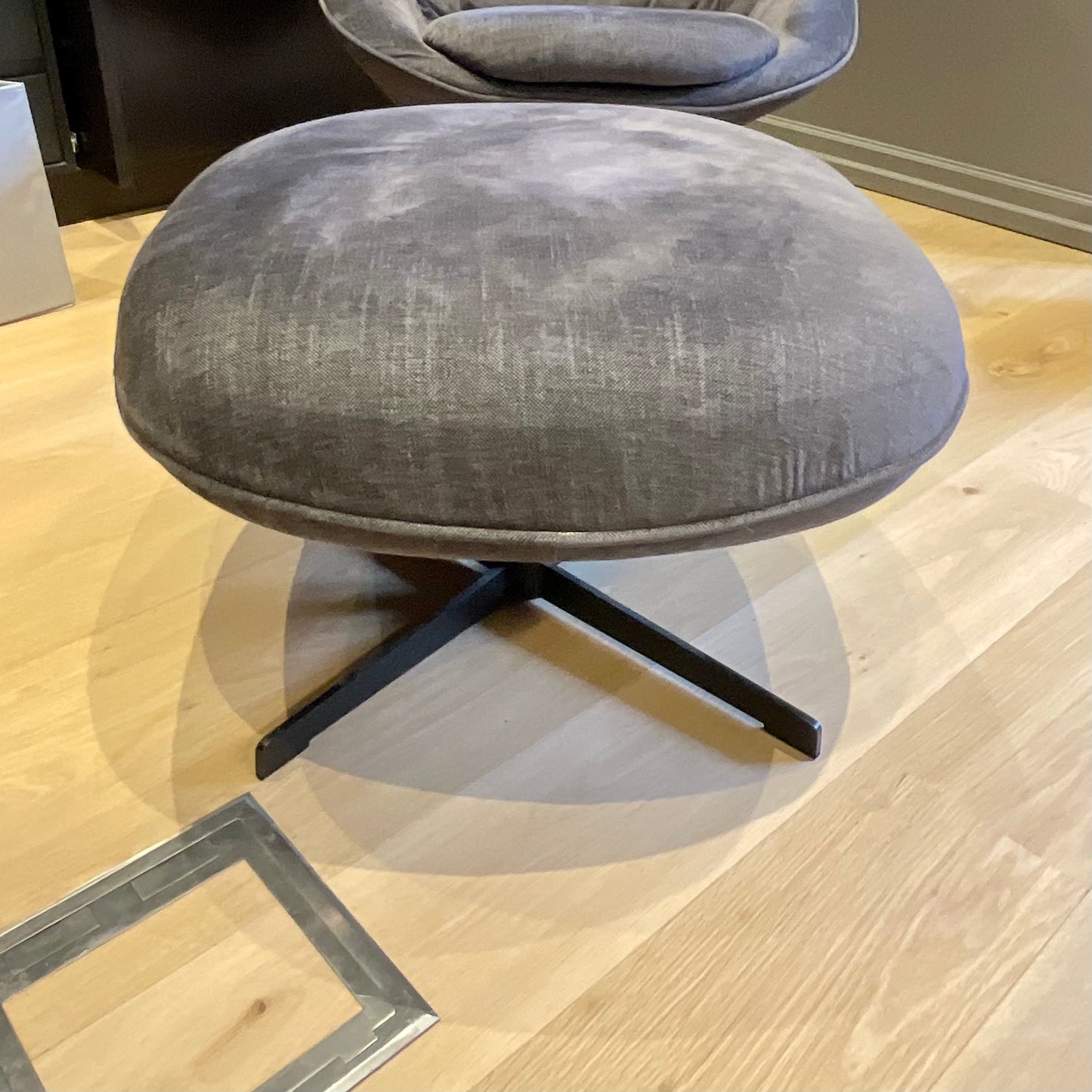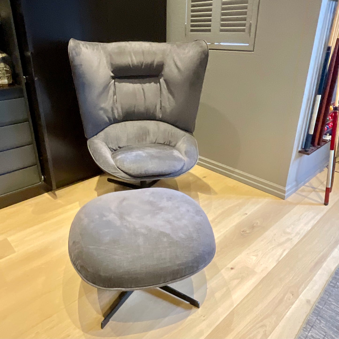 It is possible to create a very large possibility of proposals with a personal character, maintaining the aesthetical and functional point of view, that place themselves individually in very different spaces and atmospheres. Armchair 81 & footstool with spoke base - Medium version. The chair and footstool we have on offer is upholstered in a grey fabric.