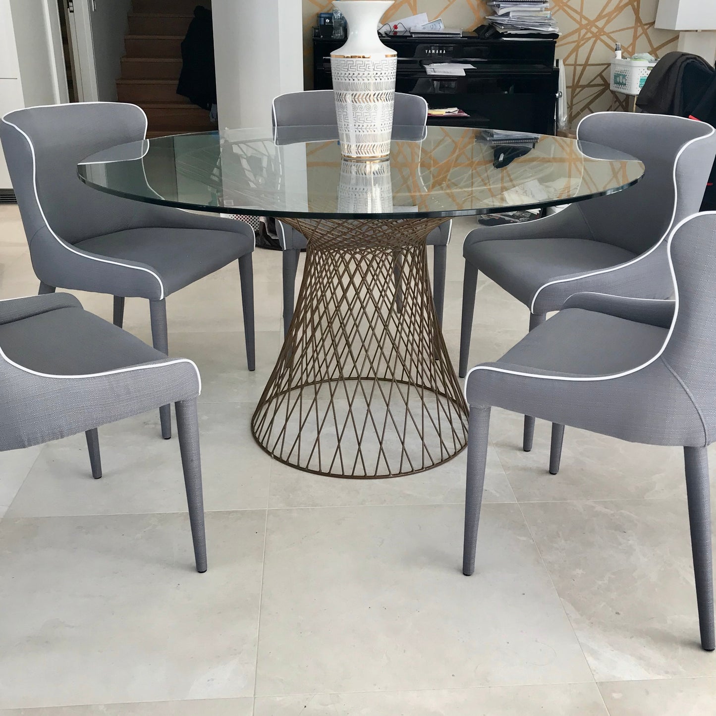 With a decorous design and luxe finish, the Lexington Dining Table creates a striking visual. This metal frame dining table has a crystal clear toughened glass glass top set upon an arresting hand forged steel base with matte gold finish.
