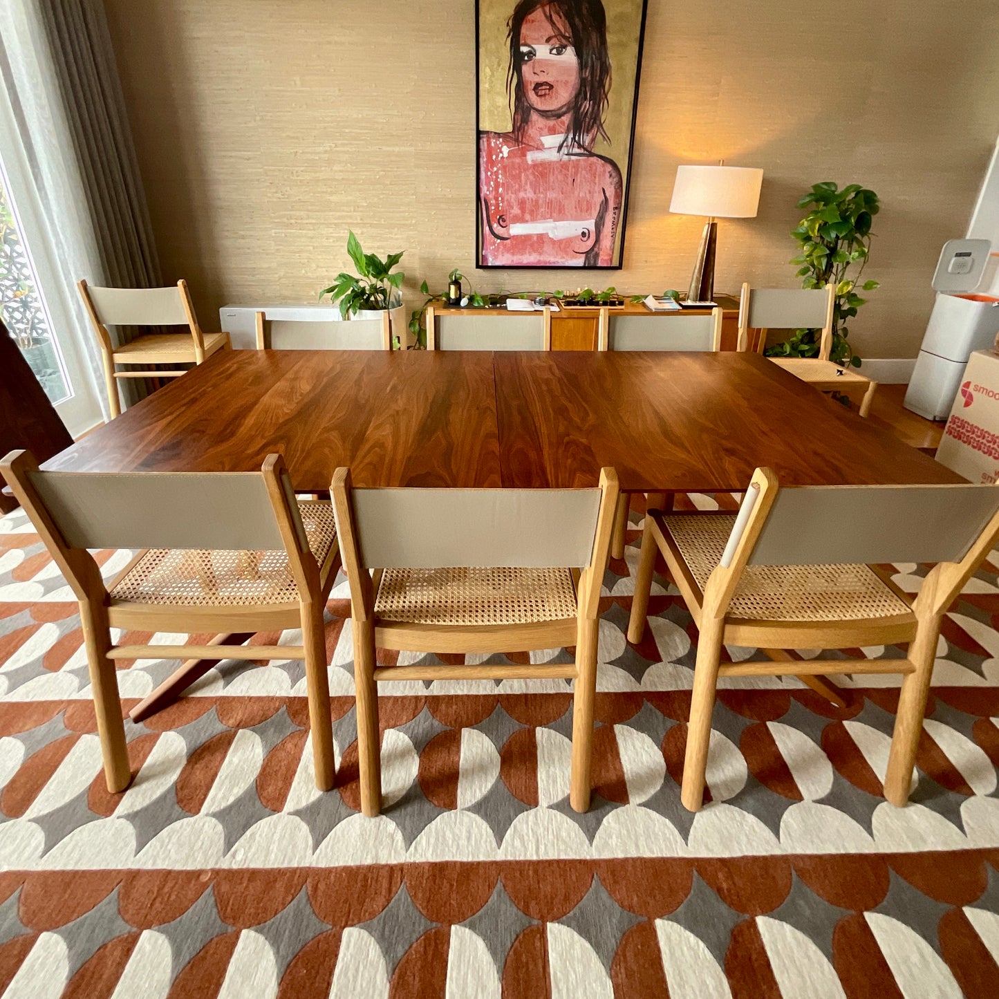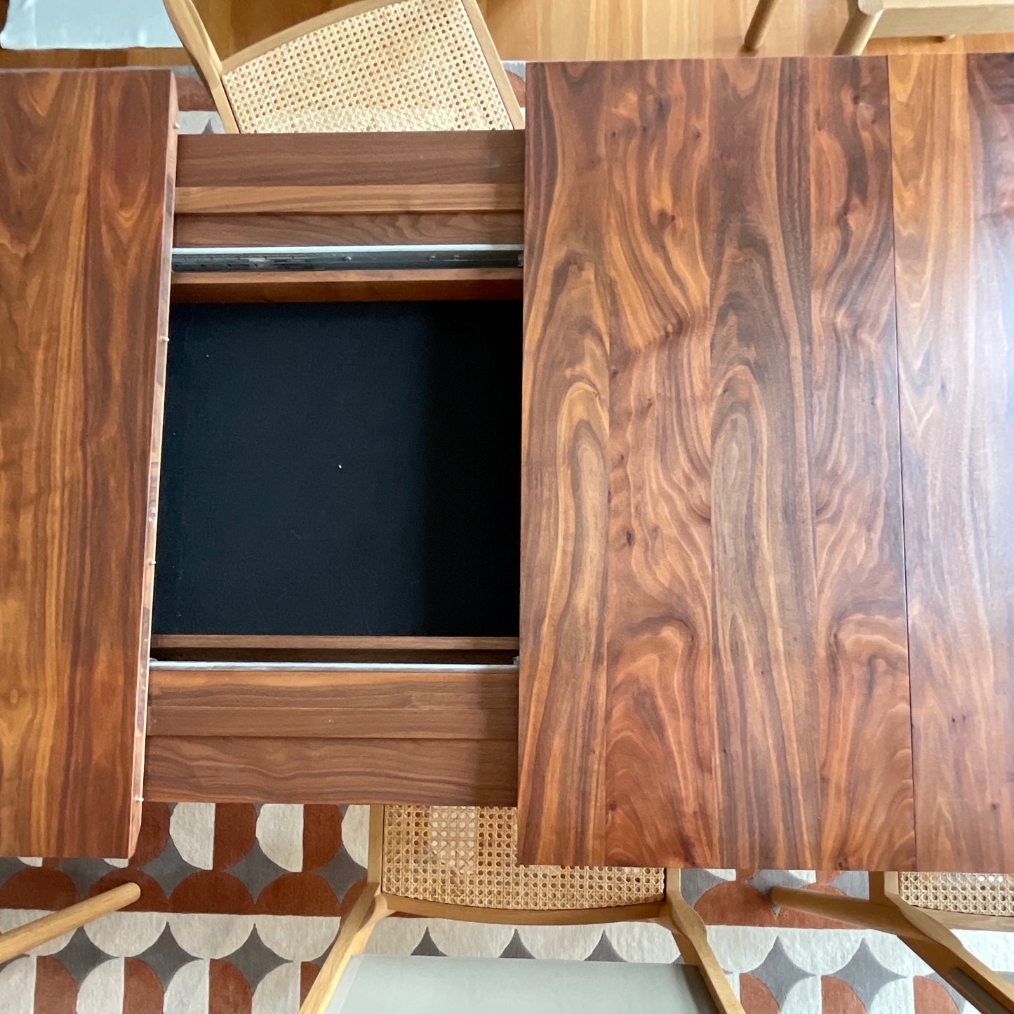 This innovative dining table extends with ease and elegance, offering three possible lengths. Set upon sculptural legs, the tabletop opens effortlessly and cradles the two leaves in a fabric-lined compartment when not in use.