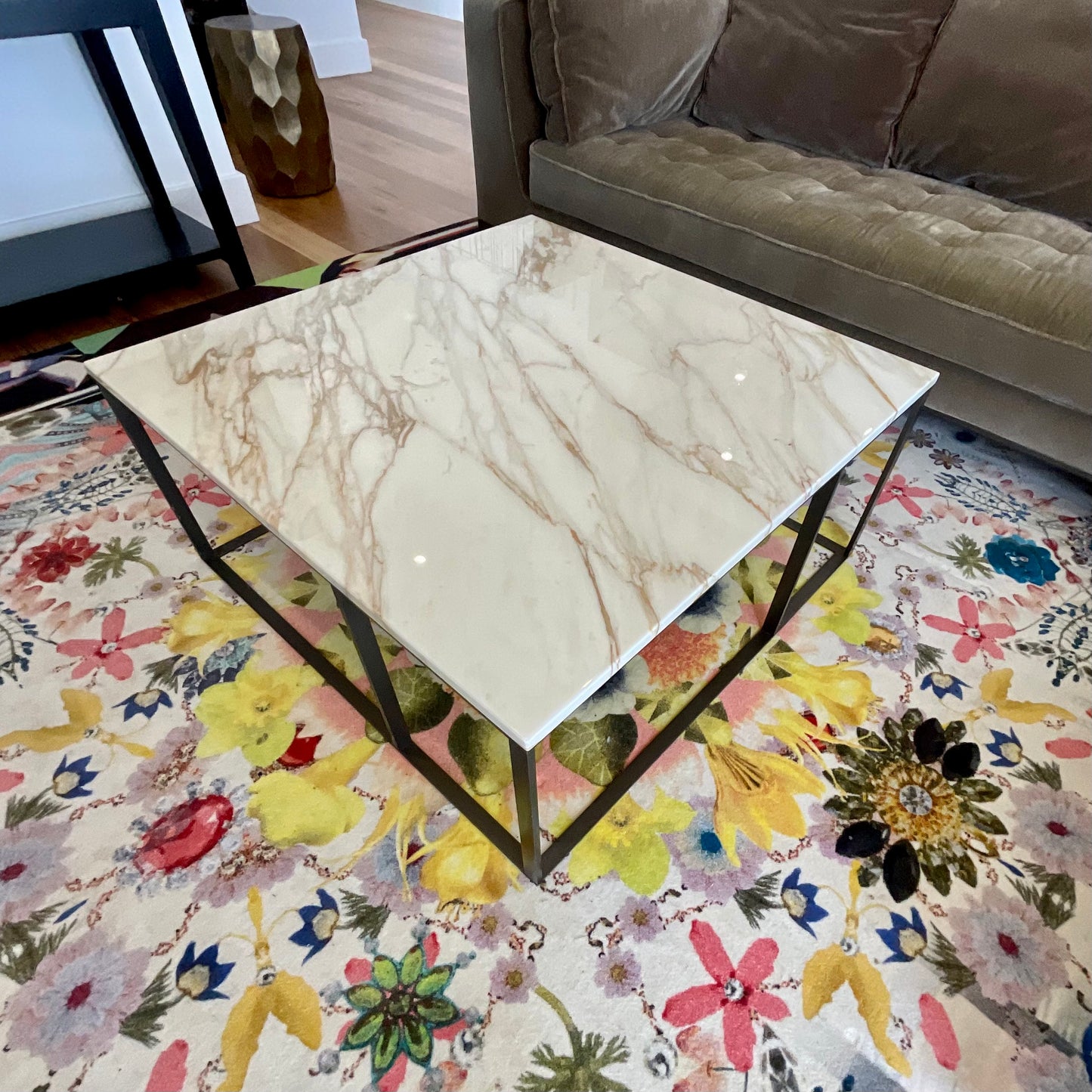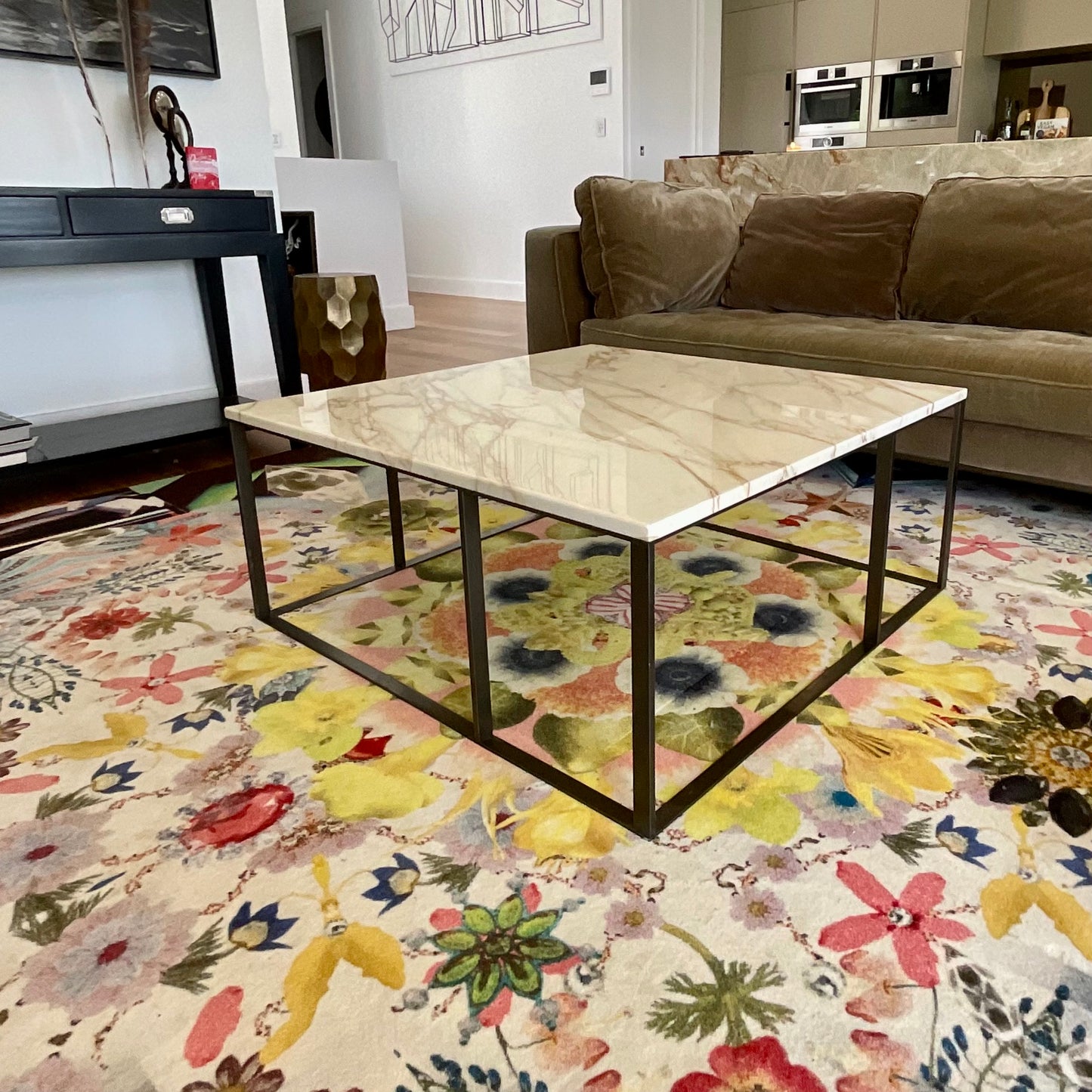 Elegant square coffee table designed by Antonio Citterio, which can either sit in the centre of a room or next to the sofa. Lithos tables have tops in black Marquinia marble, white Calacatta marble, Guatemala green marble and Travertine marble with its typical light colour. The frame is in painted bronzed nickel steel. The table we have on offer is in Calacatta marble.
