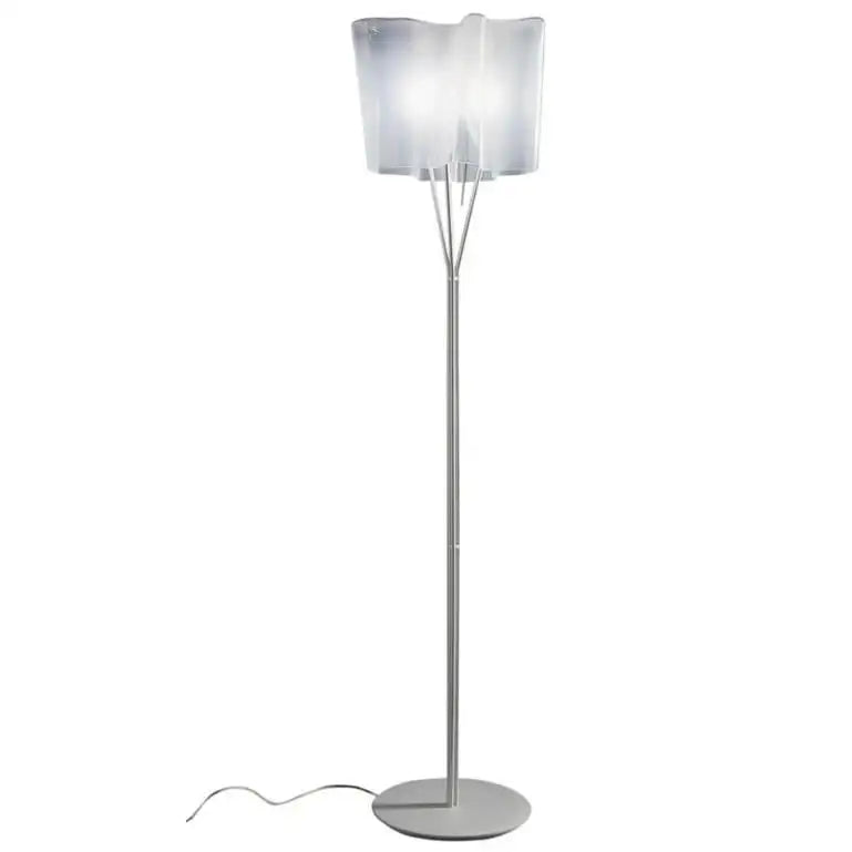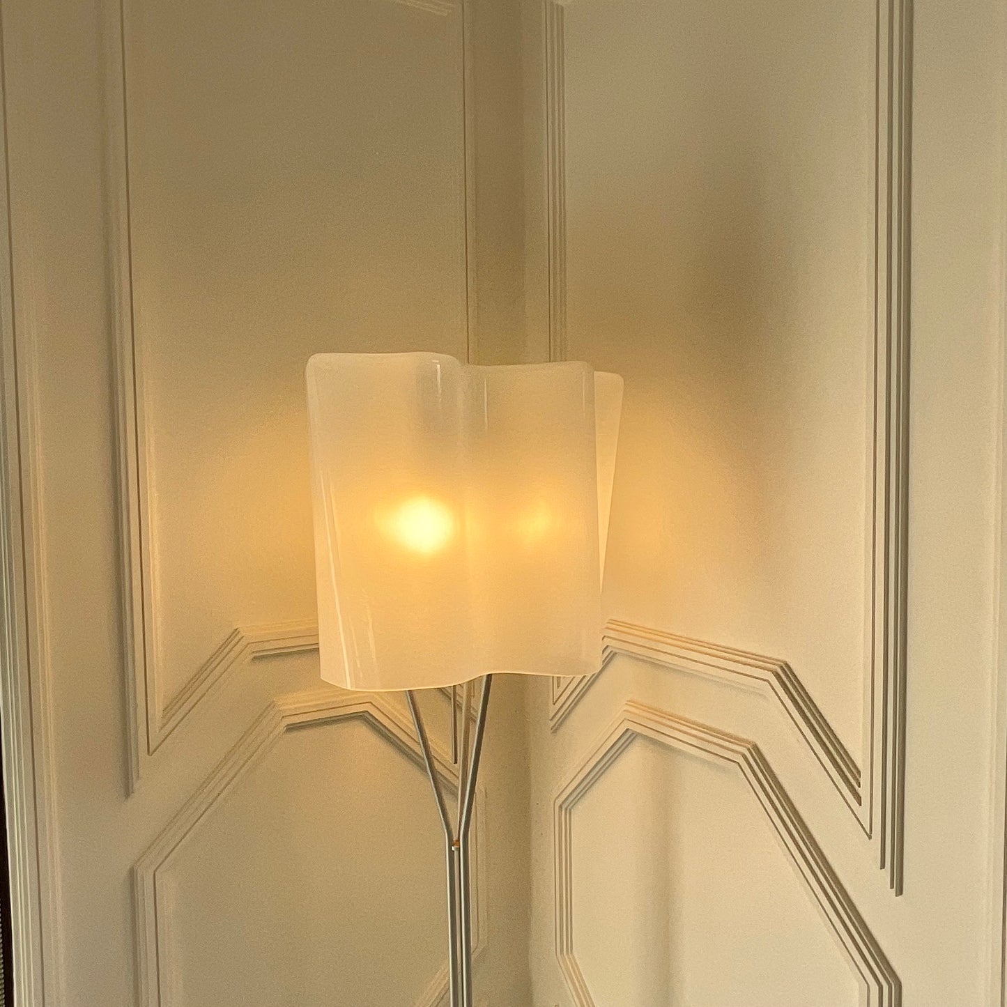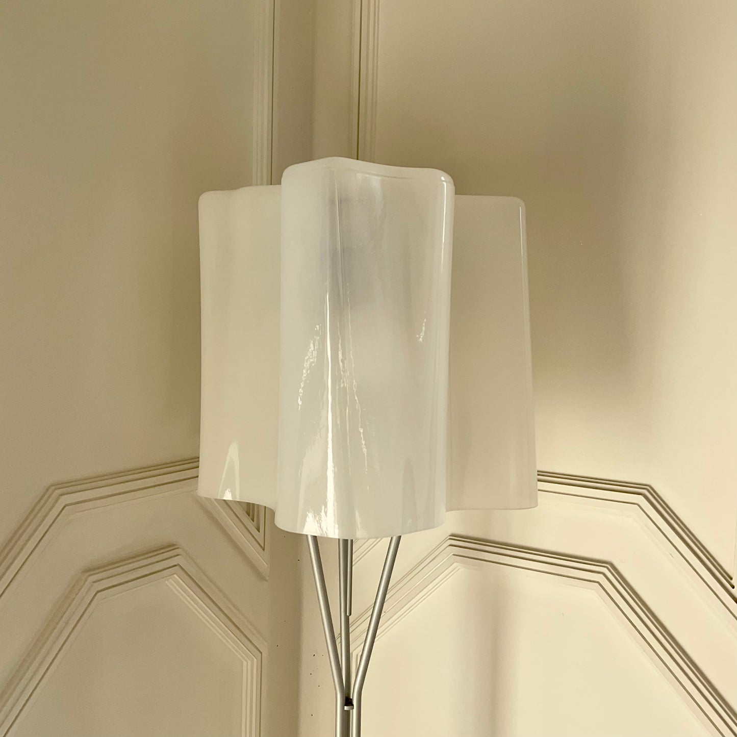 The Logico floor lamp by Artemide features a pale grey lacquered finish metal frame. The diffuser is blown glass with a polished-silk satined finish, giving a different aspect when the lamp is on or when it is off. A unique combination of glass finishing methods provides a polished-silk finish. Logico offers direct and diffused light with touch dimmer control rod in diffuser frames. The Logico floor lamp is designed by Michele De Lucchi, 2001.